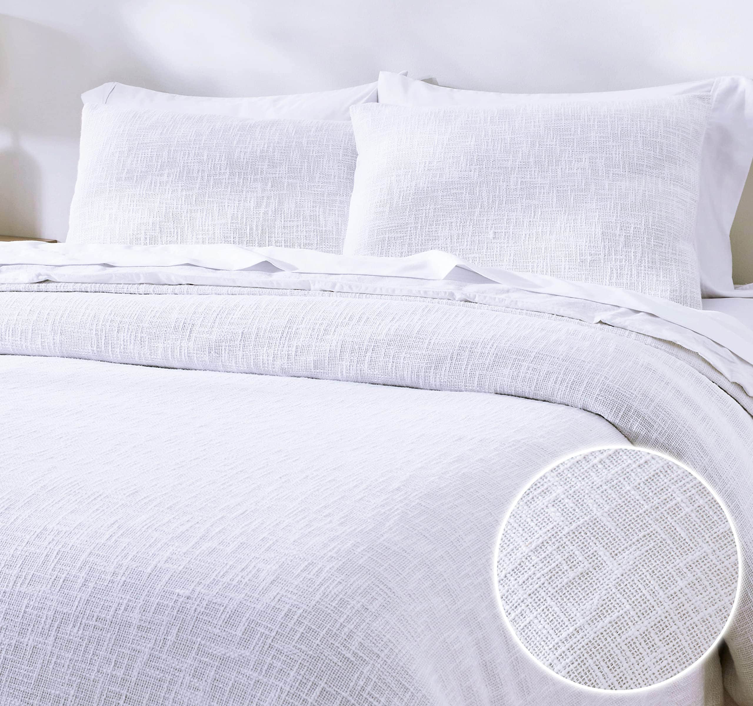 Set de funda nórdica y funda de almohada de 3 piezas de algodón 100% con textura para una apariencia elegante y acogedora en tu dormitorio. El juego incluye una funda nórdica de tamaño Queen de 92″ x 90″ que se ajusta perfectamente a los insertos de tamaño Queen. El color blanco con efecto de lino y textura añade un toque de estilo a tu decoración. Hecho con materiales de alta calidad para una durabilidad y comodidad excepcionales.