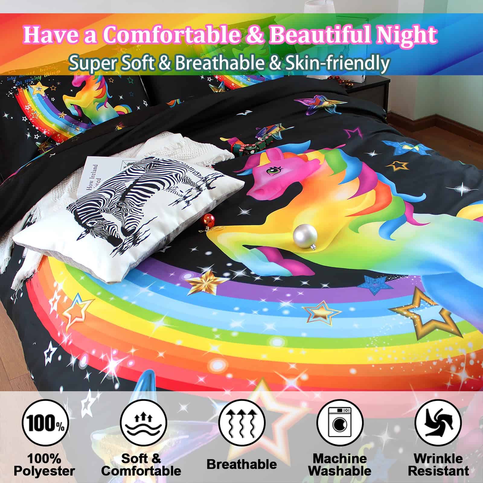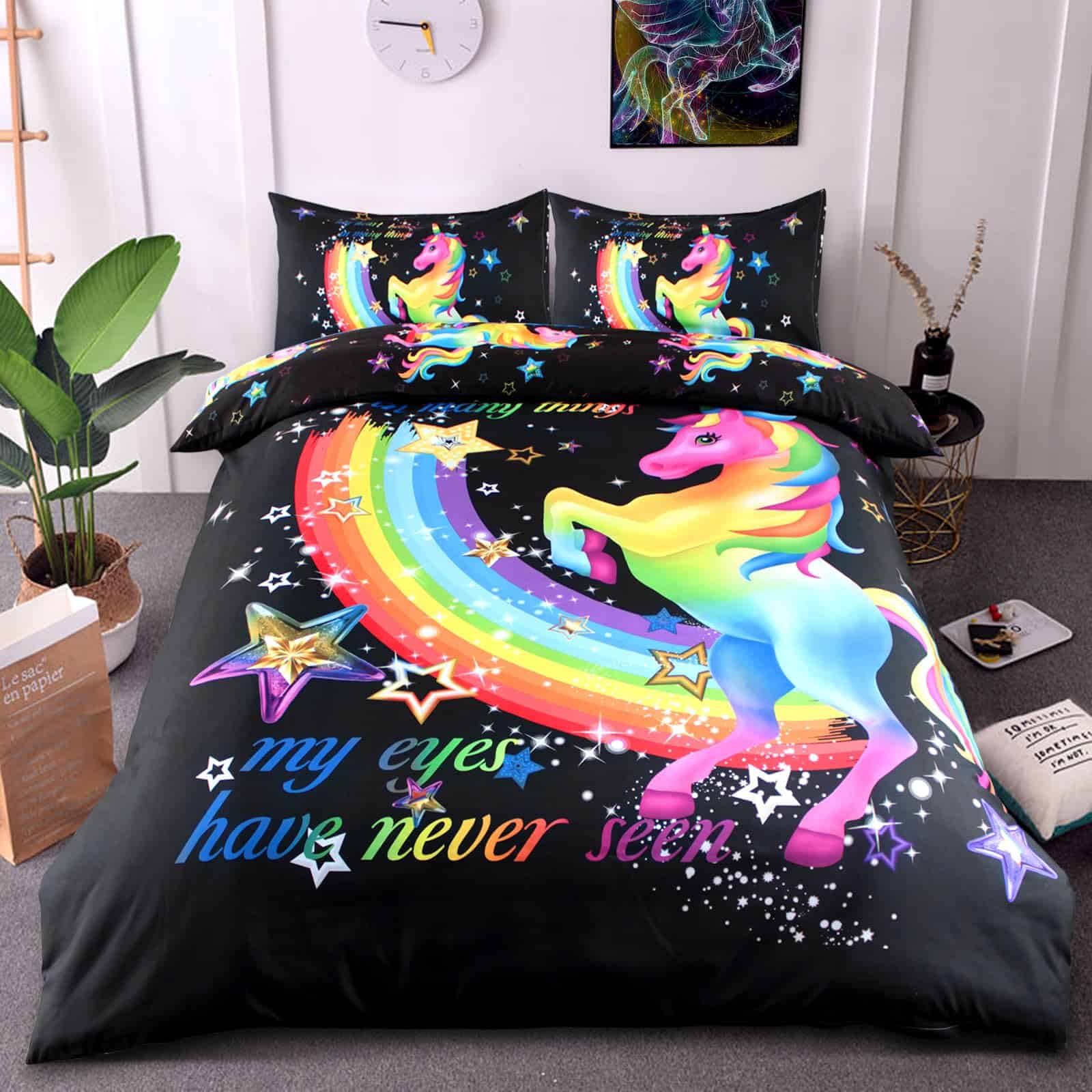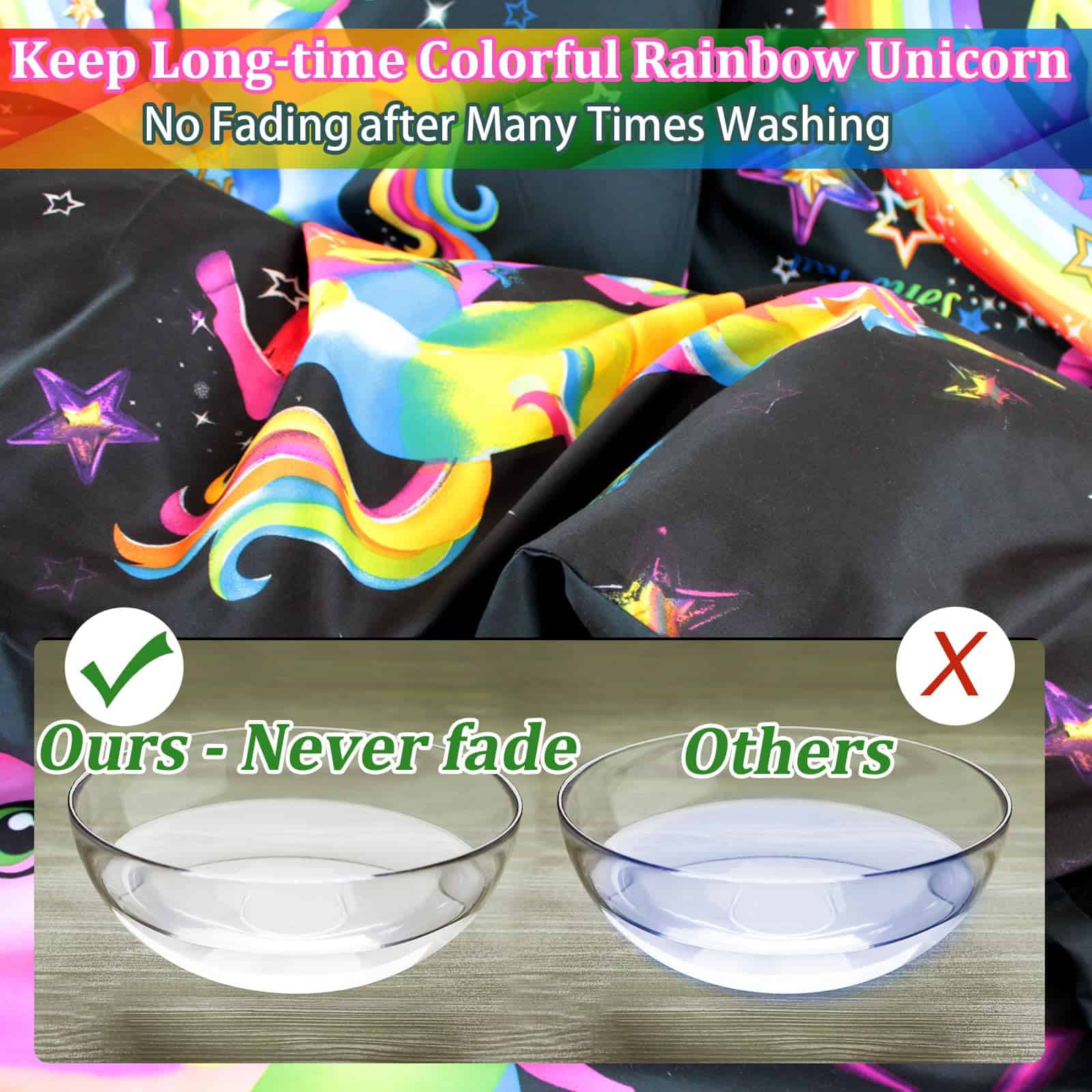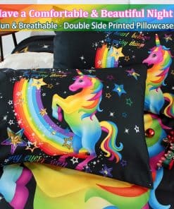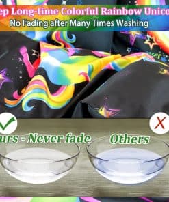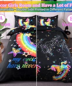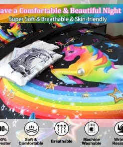 3. Patrón de unicornio El diseño de unicornio presenta colores brillantes en la funda de edredón negra, los colores llamativos atraen la vista, y el patrón arcoíris simboliza la belleza y la esperanza.