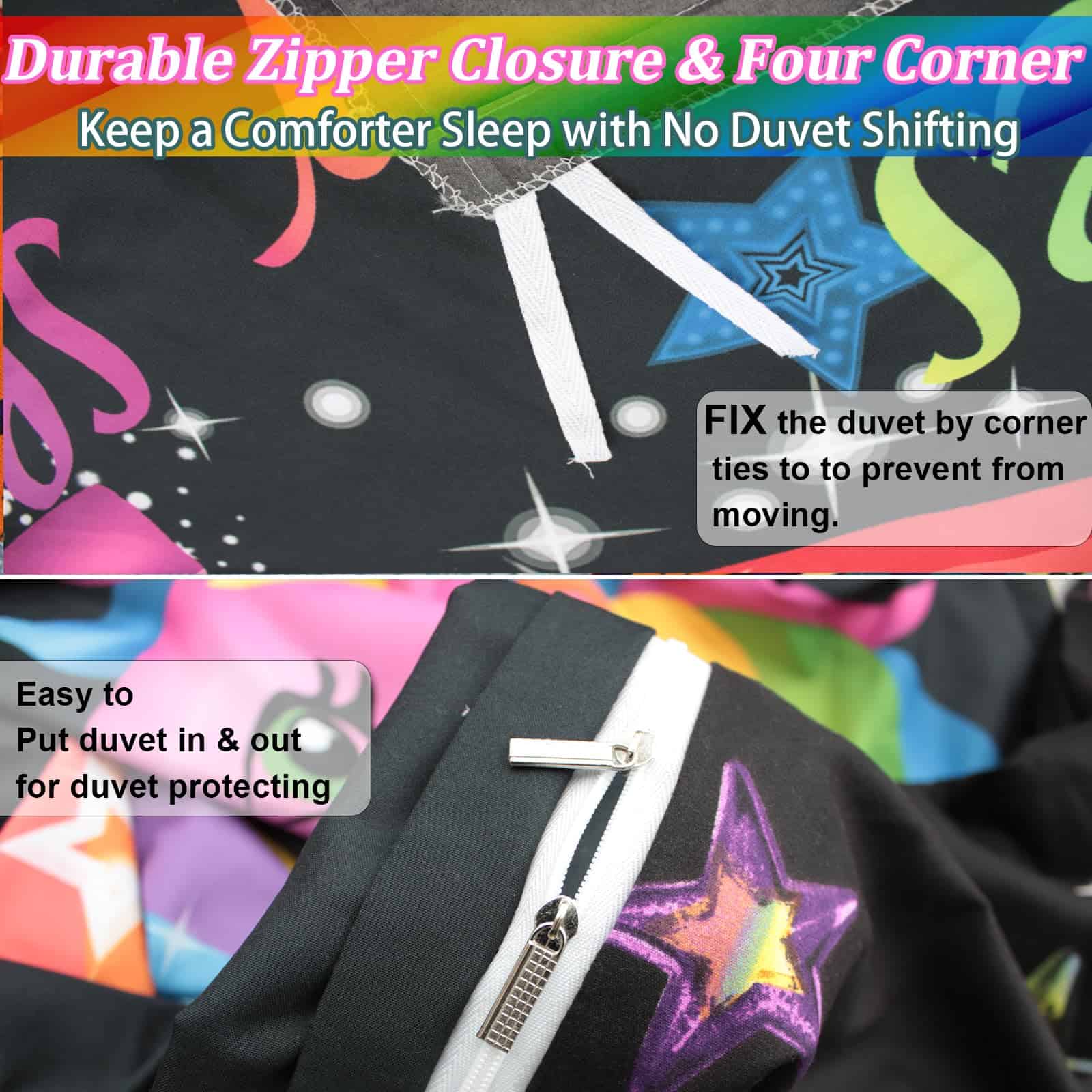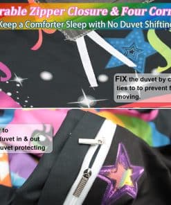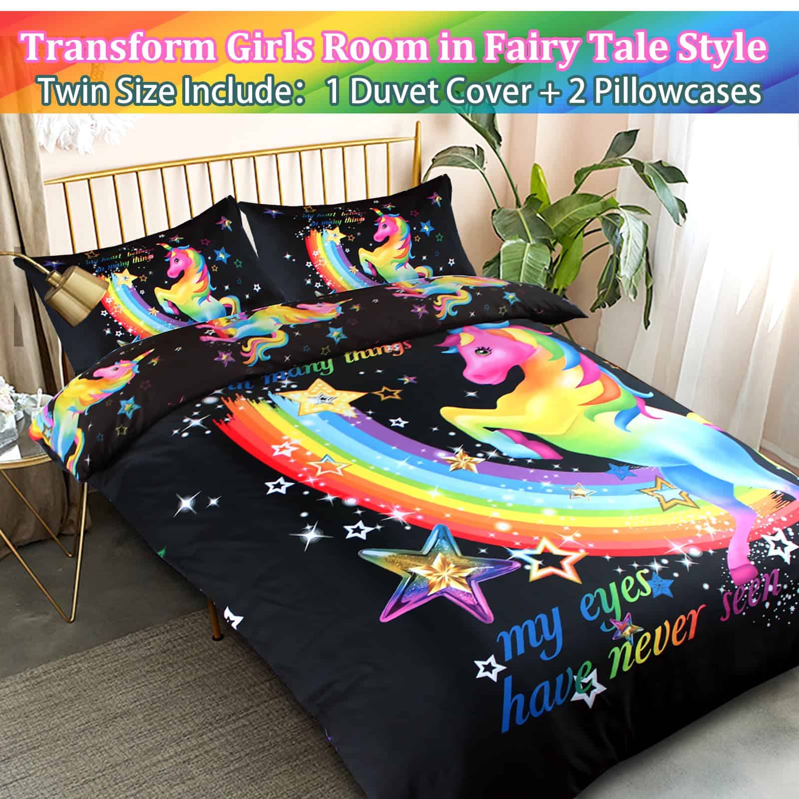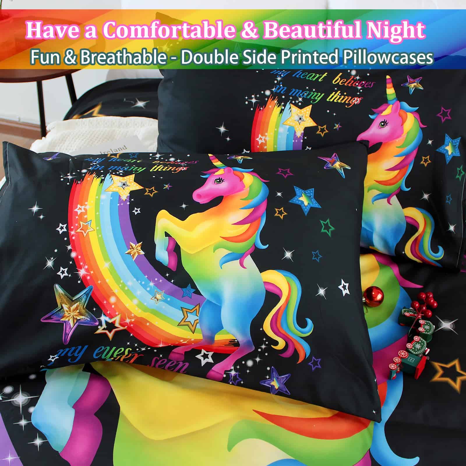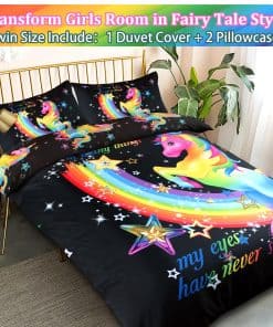 3. Patrón de unicornio El diseño de unicornio presenta colores brillantes en la funda de edredón negra, los colores llamativos atraen la vista, y el patrón arcoíris simboliza la belleza y la esperanza.