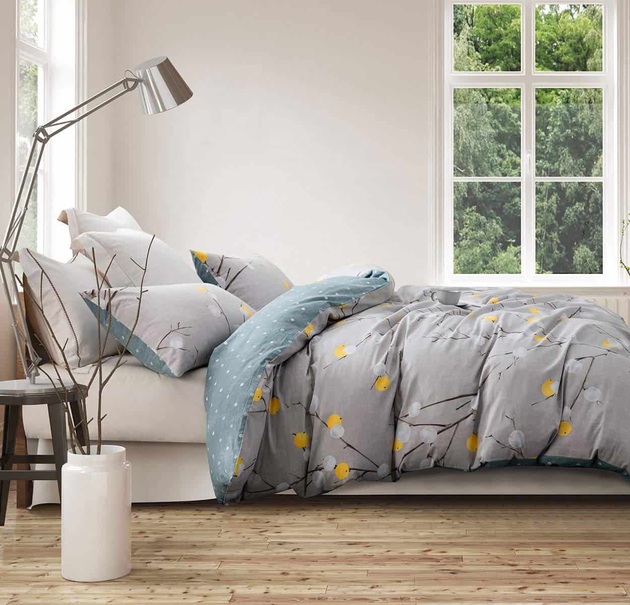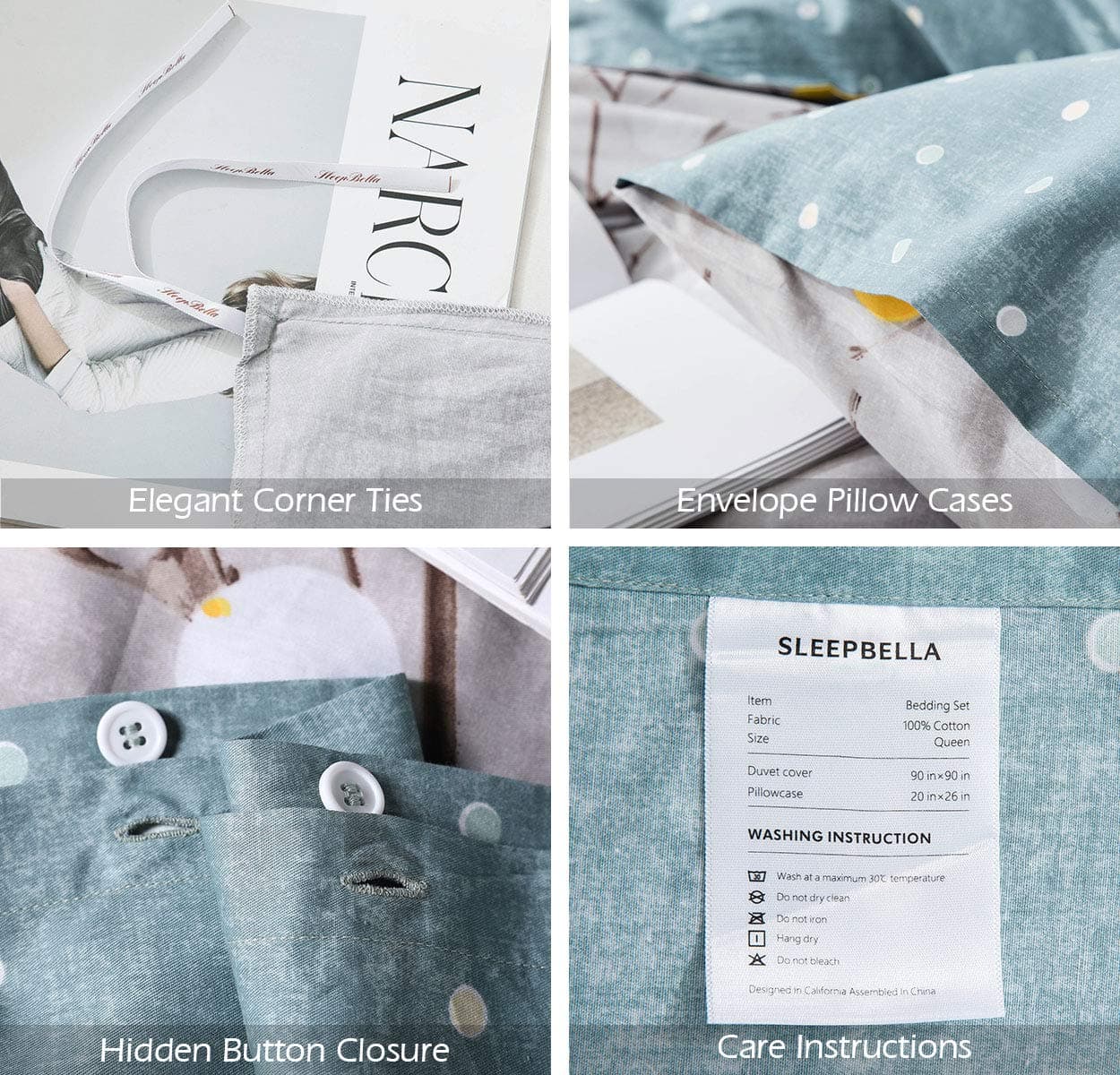 1. ¡INCLUYE JUEGO DE ROPA DE CAMA – 1x funda nórdica; 1x fundas de almohada. SIN EDREDÓN. Tamaño individual: funda nórdica (68″x 90″), fundas de almohada (20″x26″). 2. DISEÑO REVERSIBLE El juego de ropa de cama Sleepbella tiene diferentes patrones en ambos lados. Un lado es gris con un patrón de ramas salpicadas de flores blancas y amarillas. El otro lado es verde con lunares beige y turquesa. Un juego de ropa de cama trae dos estilos a tu dormitorio. 3. ALGODÓN ESTAMPADO SUAVE Y CÓMODO – Sumérgete en la comodidad y el lujo. Nuestro juego de funda nórdica está hecho de algodón de 600 hilos. La sensación suave y cómoda al tacto siempre te brinda un dulce sueño y te acompaña a través de las cuatro estaciones. 4. CIERRE DE BOTÓN RESISTENTE- La funda nórdica cuenta con un elegante cierre de botón, cosiendo 4 esquinas para mantener tu edredón en su lugar. Utilizamos costuras fuertes y de alta calidad para asegurarnos de que los botones permanezcan firmemente sujetos. 5. CUIDADO FÁCIL Con la resistencia y durabilidad, la funda nórdica SLEEPBELLA no se encoge, desvanece ni se rompe con facilidad, lo suficientemente resistente para soportar ciclos frecuentes de lavadora y secadora. Lavable a máquina, y nuestra funda nórdica se vuelve más suave después de cada lavado.