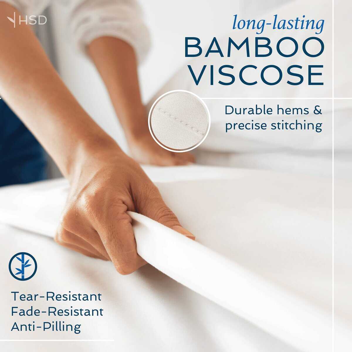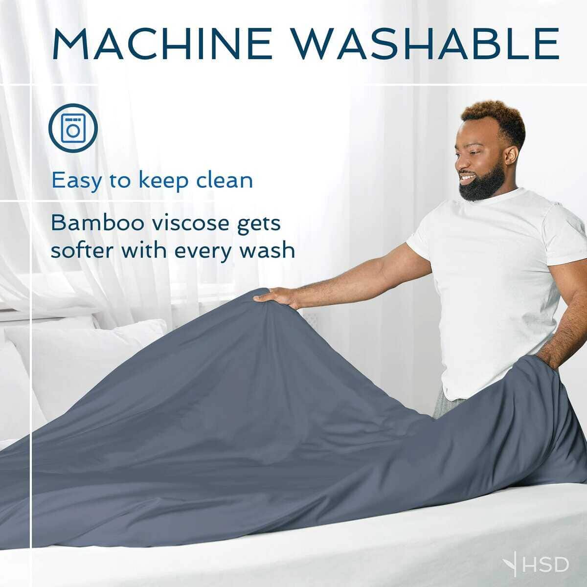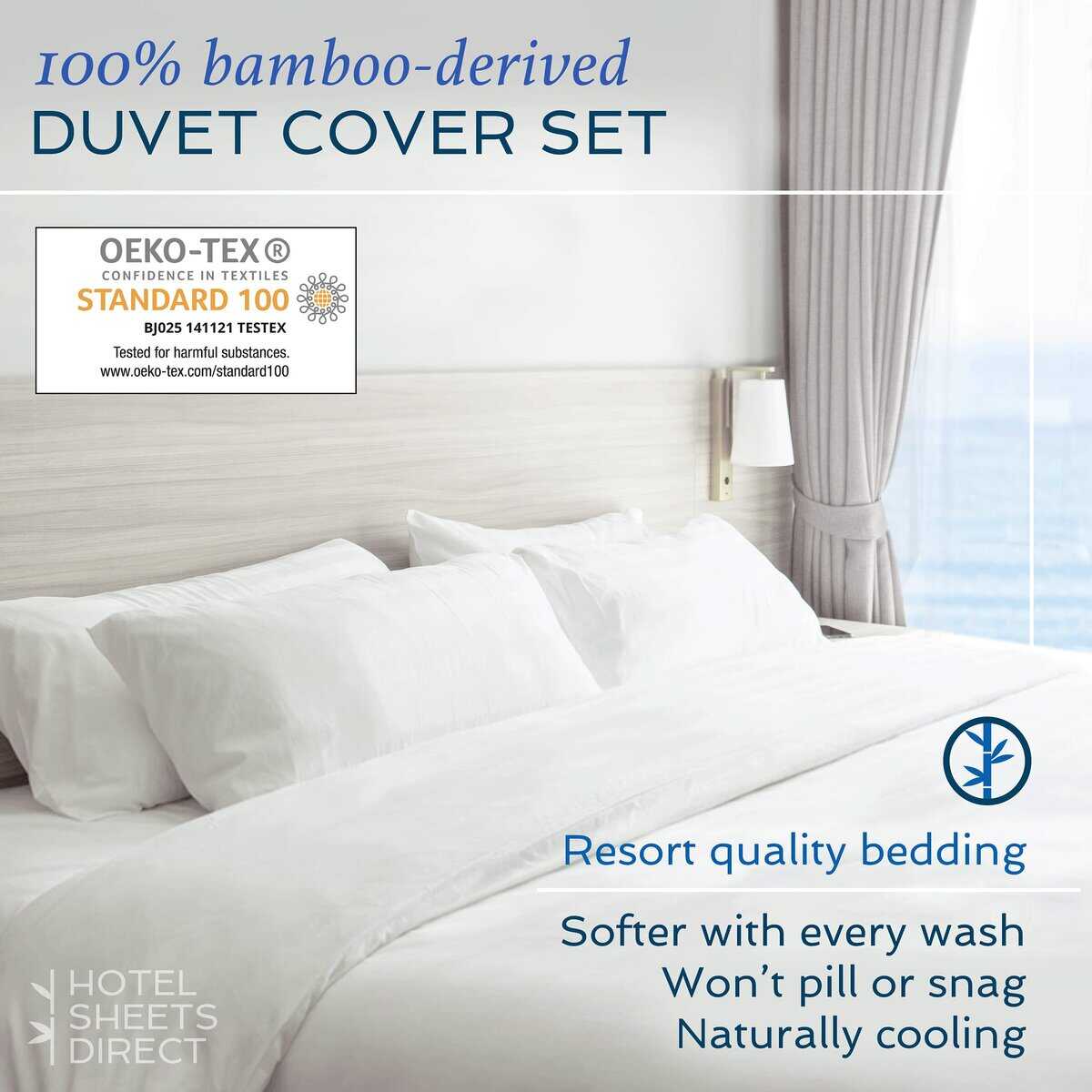 Juego de Funda Nórdica Tamaño King de 3 Piezas de Hotel Sheets Direct, hecha con 100% Viscosa Proveniente del Bambú para brindarle una sensación sedosa y ultra suave. La certificación OEKO-TEX STANDARD 100 garantiza que su ropa de cama esté libre de sustancias nocivas, haciéndola segura para toda la familia. Con un resistente cierre de cremallera y lazos en las esquinas, esta funda nórdica se mantiene en su lugar sin agruparse ni deslizarse mientras duerme. El material transpirable y que absorbe la humedad le proporciona una sensación de frescura en verano, calidez en invierno y evita la humedad para noches libres de sudor, manteniéndolo acogedor en cada temporada. Además, la tela lavable a máquina asegura una limpieza sin problemas y es lo suficientemente duradera como para mantener la suavidad incluso después de múltiples lavados.