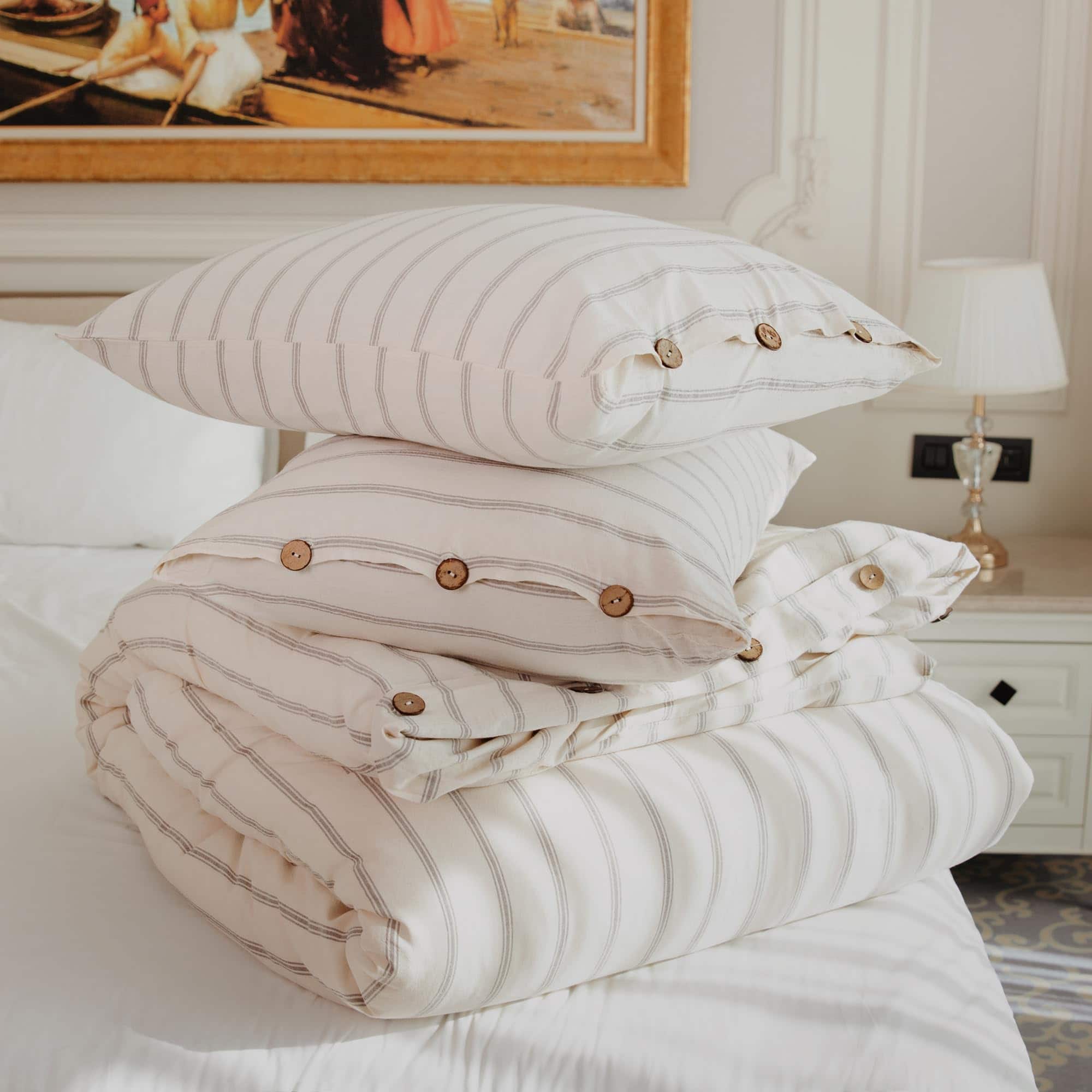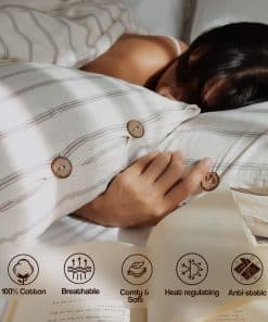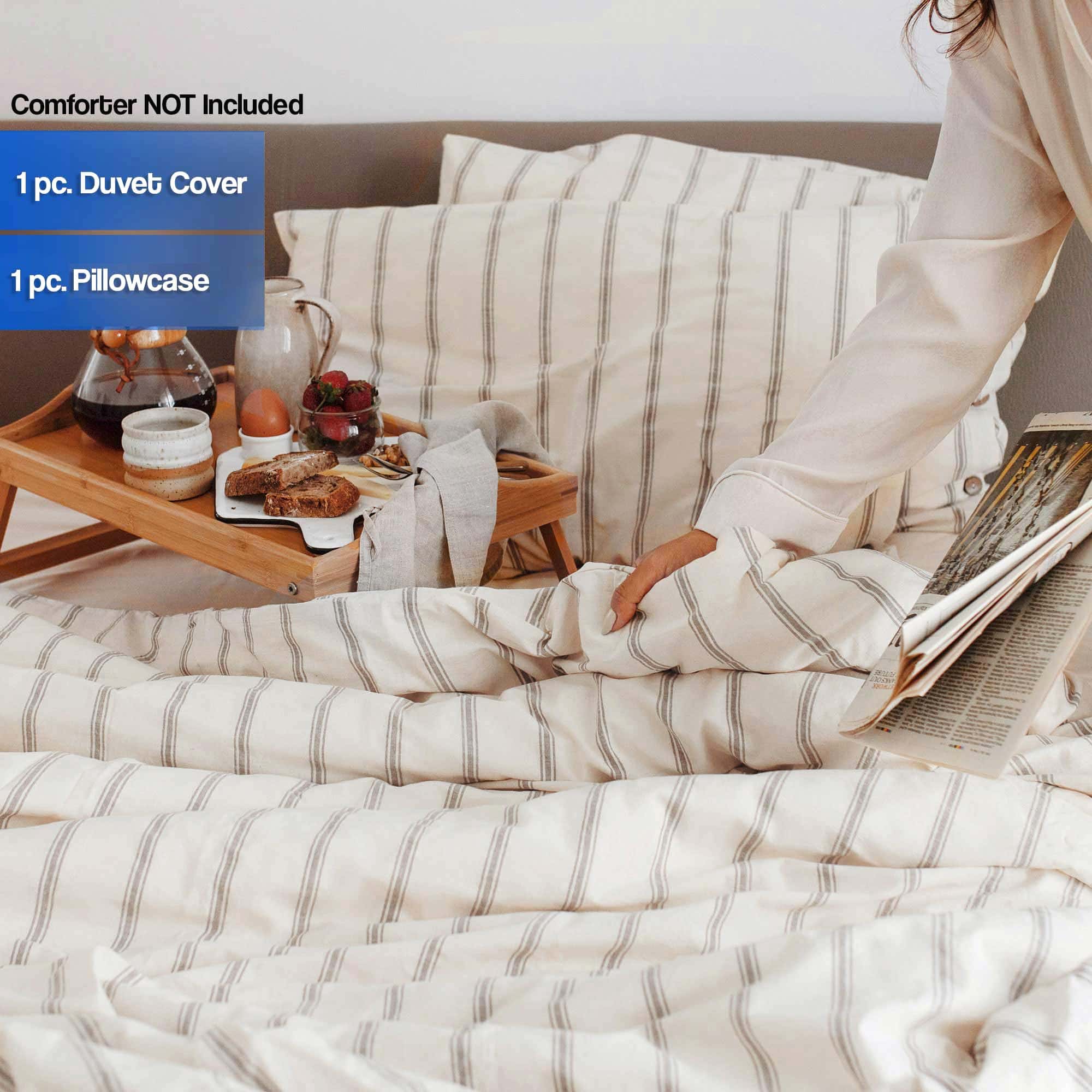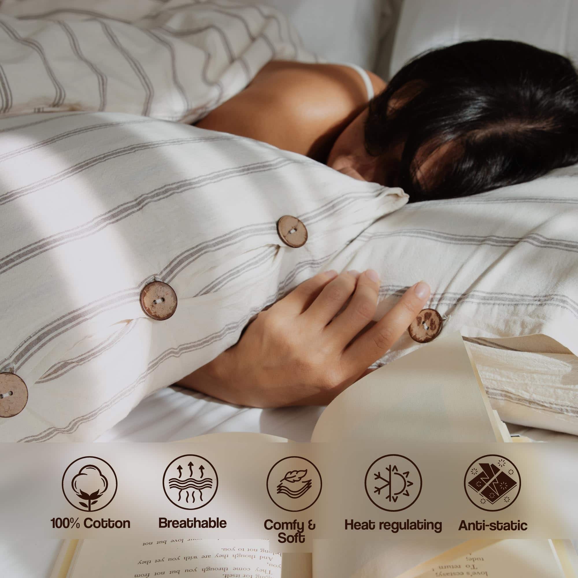 1. Juego de Cama Twin Size – 2 Piezas: 1 funda nórdica (68″ de ancho x 90″ de largo); 1 funda de almohada (20″ de ancho x 26″ de largo). No incluye el edredón. 2. 100% Algodón Natural: Hecho de algodón transpirable de alta calidad para una experiencia suave y amigable con la piel. Este tejido ligero ofrece confort durante todo el año con una sensación lujosa y duradera. 3. Diseño de Rayas Clásico: Presenta un patrón de rayas blanco y gris clásico que complementa perfectamente la decoración de dormitorio moderna, minimalista o tradicional, añadiendo elegancia a tu espacio. 4. Regulación Térmica (4 Estaciones): Diseñado para uso durante todo el año, este tejido de algodón transpirable regula la temperatura de forma natural, manteniéndote fresco en verano y cálido en invierno. 5. Cierre de Botón de Coco y 4 Lazos: Cuenta con un cierre de botón de coco natural para un toque elegante y ecológico. Cuatro lazos internos en las esquinas aseguran de manera segura tu funda nórdica en su lugar, garantizando un aspecto ordenado y suave toda la noche. 6. Fácil Cuidado: Lavable a máquina para un mantenimiento sin esfuerzo. Resistente a la decoloración, contracción y formación de bolitas, asegurando calidad duradera y un aspecto fresco después de cada lavado.