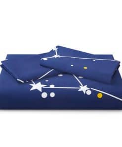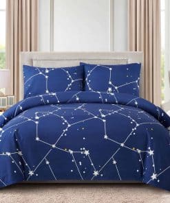 1. Diseño Este moderno patrón de universo galáctico tiene una base azul marino con estrellas blancas y amarillas de asterismo decoradas sobre él. Diseño impreso a juego en las 2 fundas de almohada. Nuestro poliéster doble cepillado de 120 GSM y rayón derivado del bambú es suave y duradero y cuenta con un tejido transpirable.