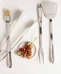La colección original de herramientas de acero inoxidable fue diseñada para complementar los utensilios de cocina All-Clad. El juego de herramientas de barbacoa incluye un tenedor de dos puntas, un cepillo de cabeza de jabalí, pinzas con cierre y una espátula ranurada, cada uno diseñado ergonómicamente con mangos extra largos para mantener las manos a una distancia segura de la parrilla caliente. Los mangos cuentan con un agujero para mantener las herramientas colgadas al alcance de la parrilla. Un estuche de almacenamiento metálico con cierre mantiene las herramientas protegidas de los elementos y permite un fácil transporte.