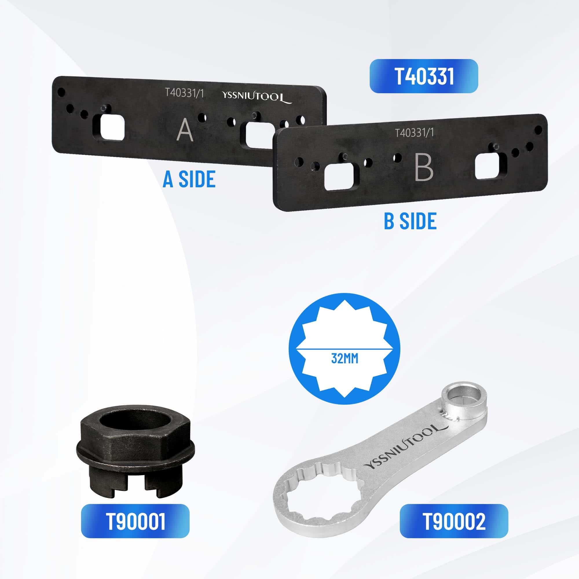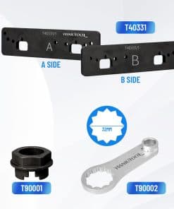 2. Función: Utilícelo para fijar los árboles de levas en su lugar al quitar e instalar las cadenas de tiempo del árbol de levas. El sujeta árboles de levas T40331 es necesario para mantener el árbol de levas en su lugar al quitar e instalar la cadena de tiempo del árbol de levas. Esta herramienta especial se utiliza para ambos bancos de cilindros 1 y 2.