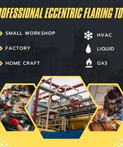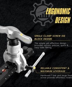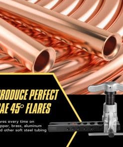 Este Juego de Herramientas de Expansión Flexzion es ideal para realizar acodamientos de 45 grados en tuberías de cobre, latón, aluminio y acero suave. Incluye 8 tamaños de troqueles, desde 3/16″ hasta 3/4″, para adaptarse a una variedad de dimensiones de tuberías. El tornillo de sujeción único facilita la sujeción y retirada de las tuberías, mientras que el mango grande del tornillo de avance permite girar suavemente con poco esfuerzo.