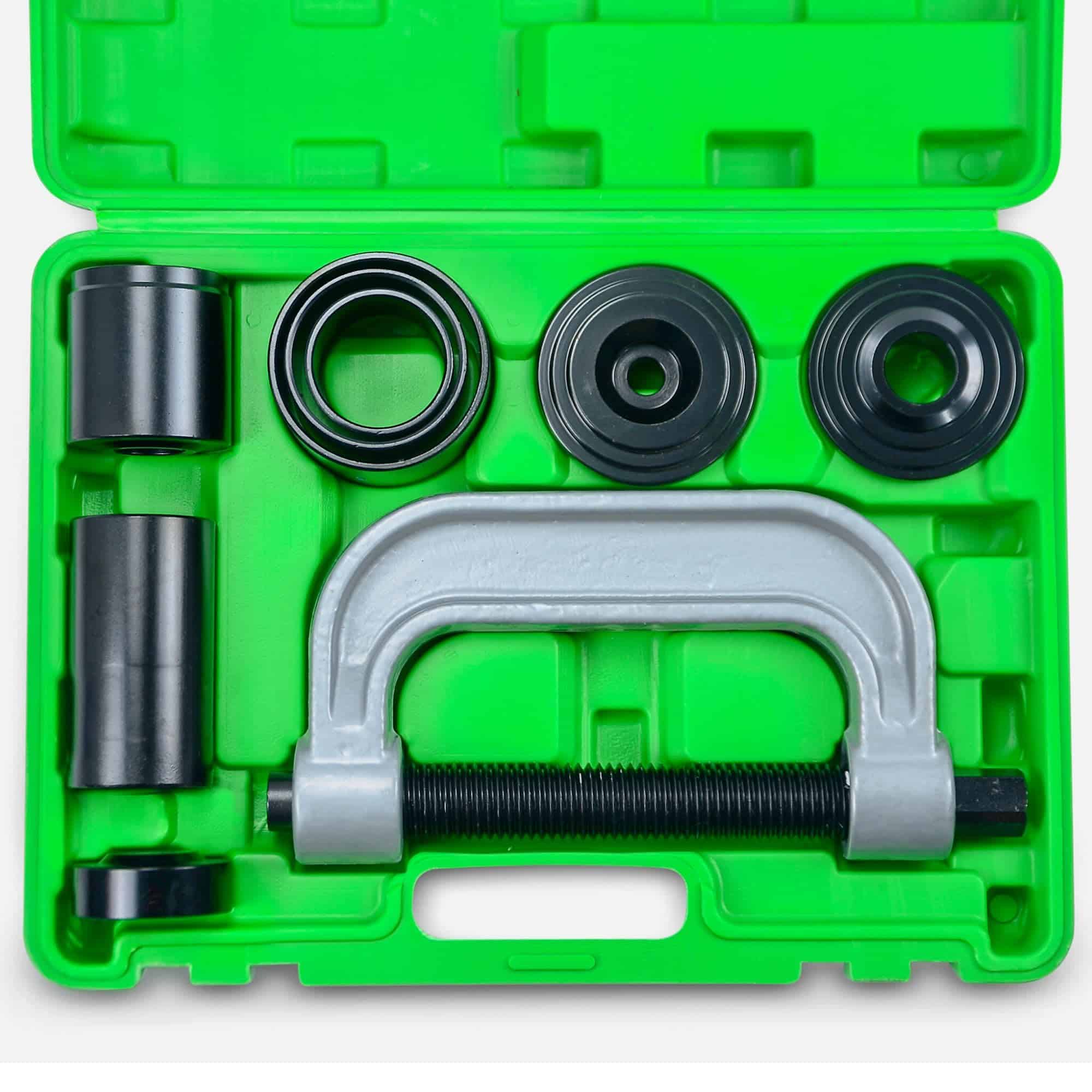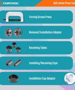 4. El juego de prensa de rótulas CORTOOL / kit de herramientas de extracción de bujes viene en un resistente estuche de plástico moldeado por soplado de 11 x 3 x 15 pulgadas (27.9cm x 7.6cm x 38.1cm) con un asa para un almacenamiento y organización fácil y seguro. El paquete incluye tubos receptores, adaptadores de extracción e instalación, tornillos, una prensa de tornillo de fuerza y copas de recepción e instalación.