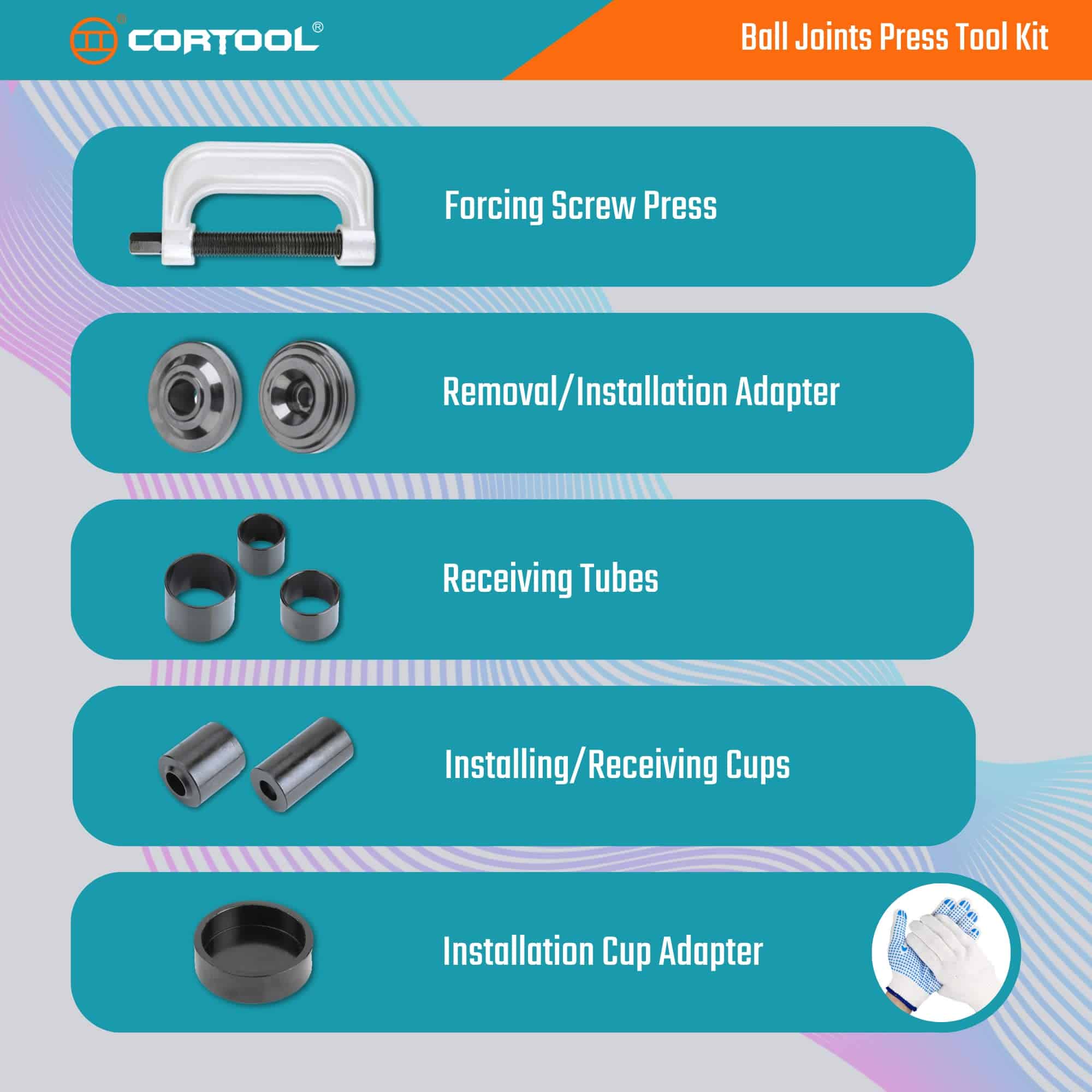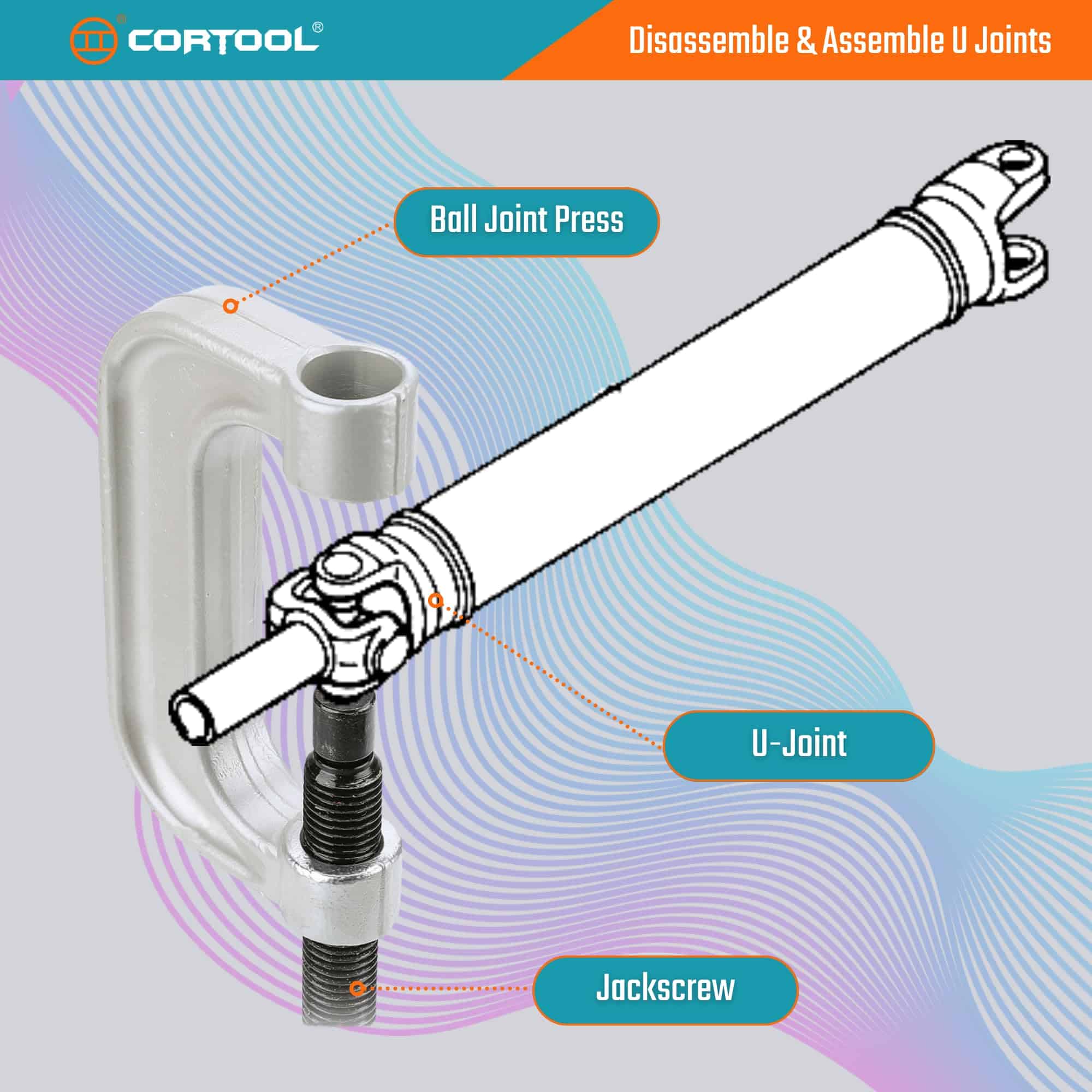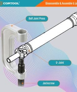 1. Retire fácilmente componentes ajustados a presión como juntas de rótula, juntas universales y pernos de anclaje de frenos de la mayoría de los vehículos 2WD y 4WD, sin necesidad de quitar el brazo de control, utilizando el Juego de Prensa de Rótulas CORTOOL Herramienta de Extracción de Rótulas / Herramienta de Extracción de Buje junto con el Adaptador 4WD.