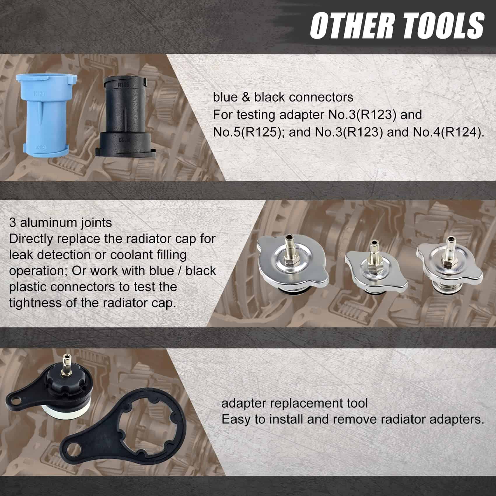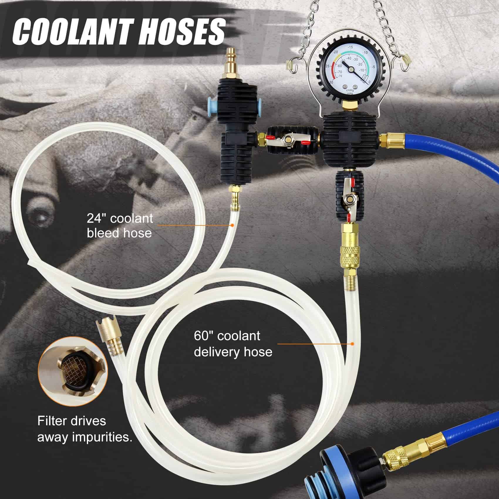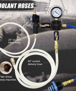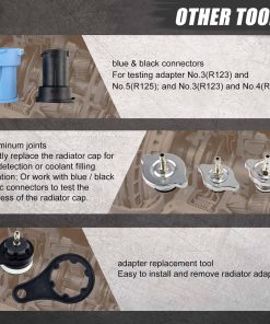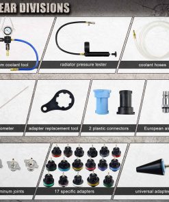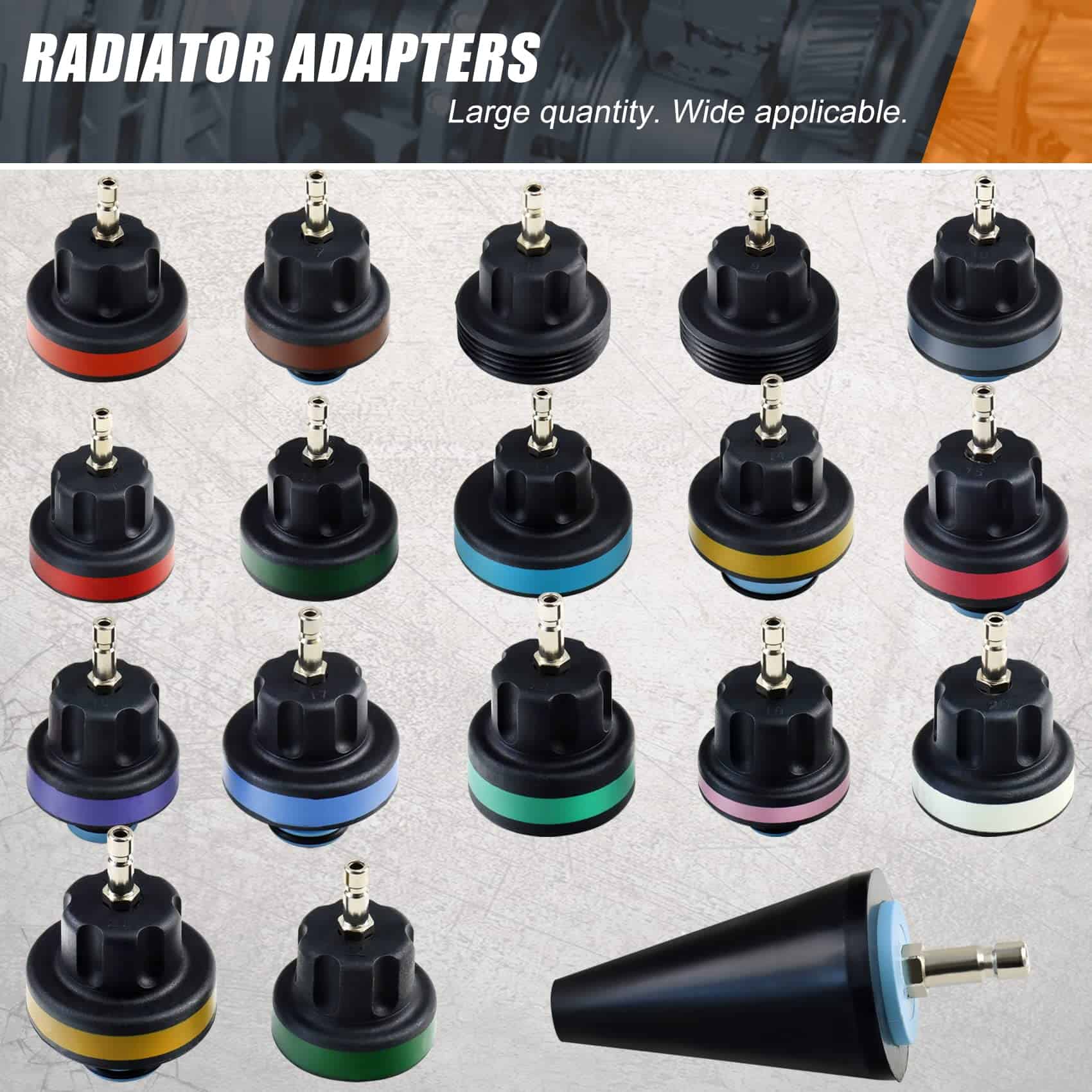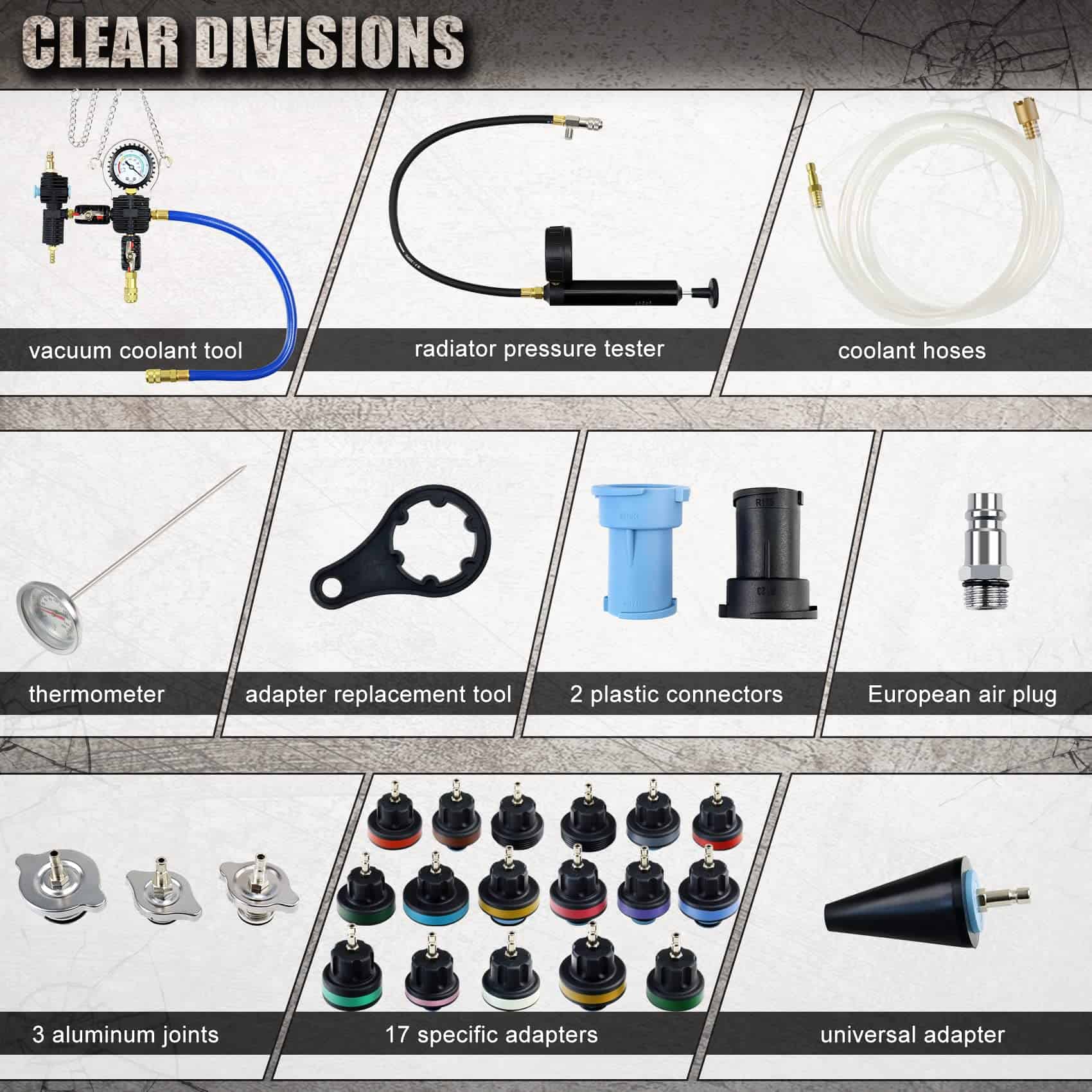 El kit incluye 21 adaptadores de colores codificados y juntas de aleación de aluminio para una amplia gama de aplicaciones en diversos vehículos domésticos e importados. Todas las piezas están organizadas de forma ordenada en un estuche de plástico ABS resistente para una fácil identificación y almacenamiento. Las herramientas, adaptadores y mangueras están fabricados con materiales de alta calidad que han sido probados para resistir el desgaste prolongado. Se incluye un termómetro de acero inoxidable para medir con precisión la temperatura del refrigerante y garantizar la seguridad de la operación.