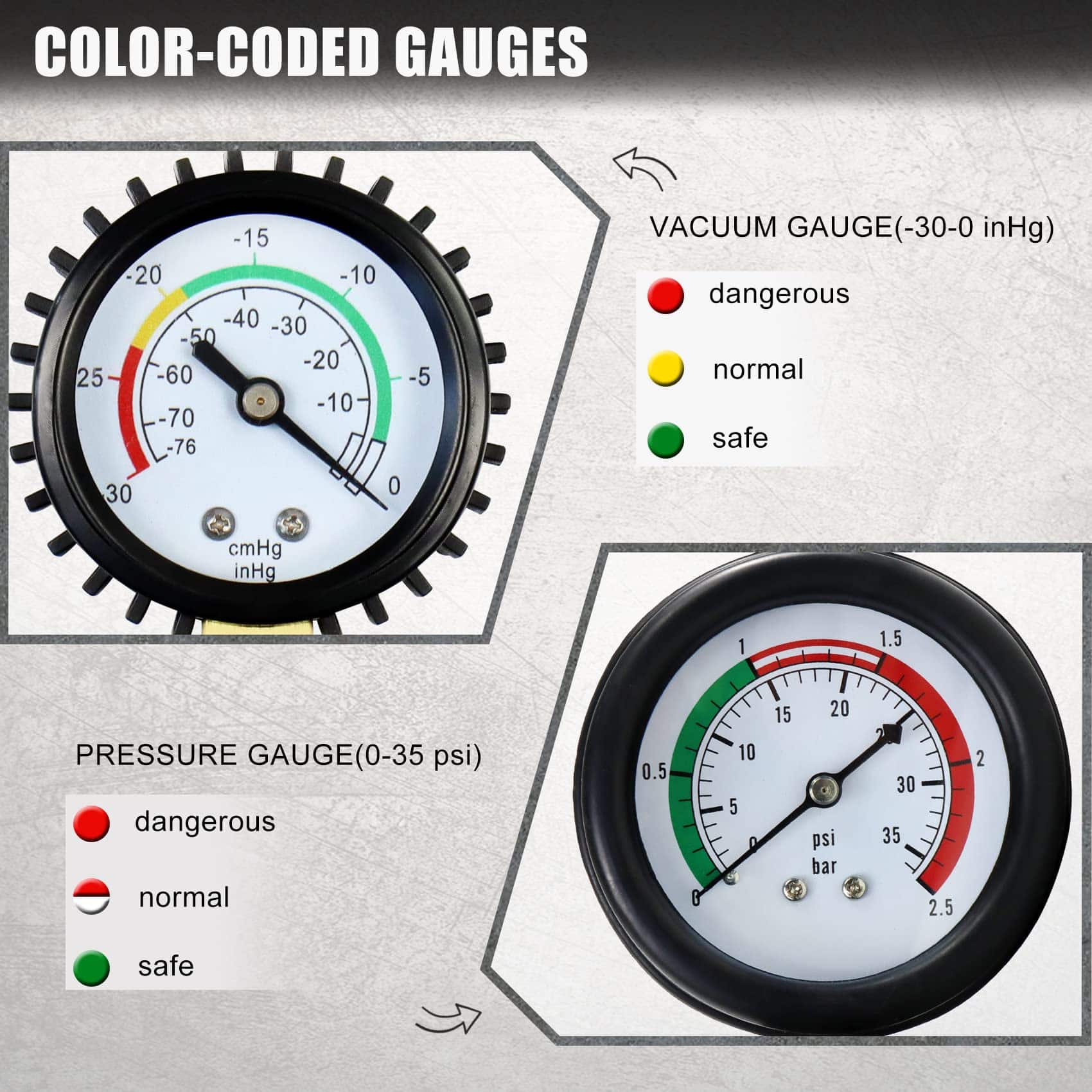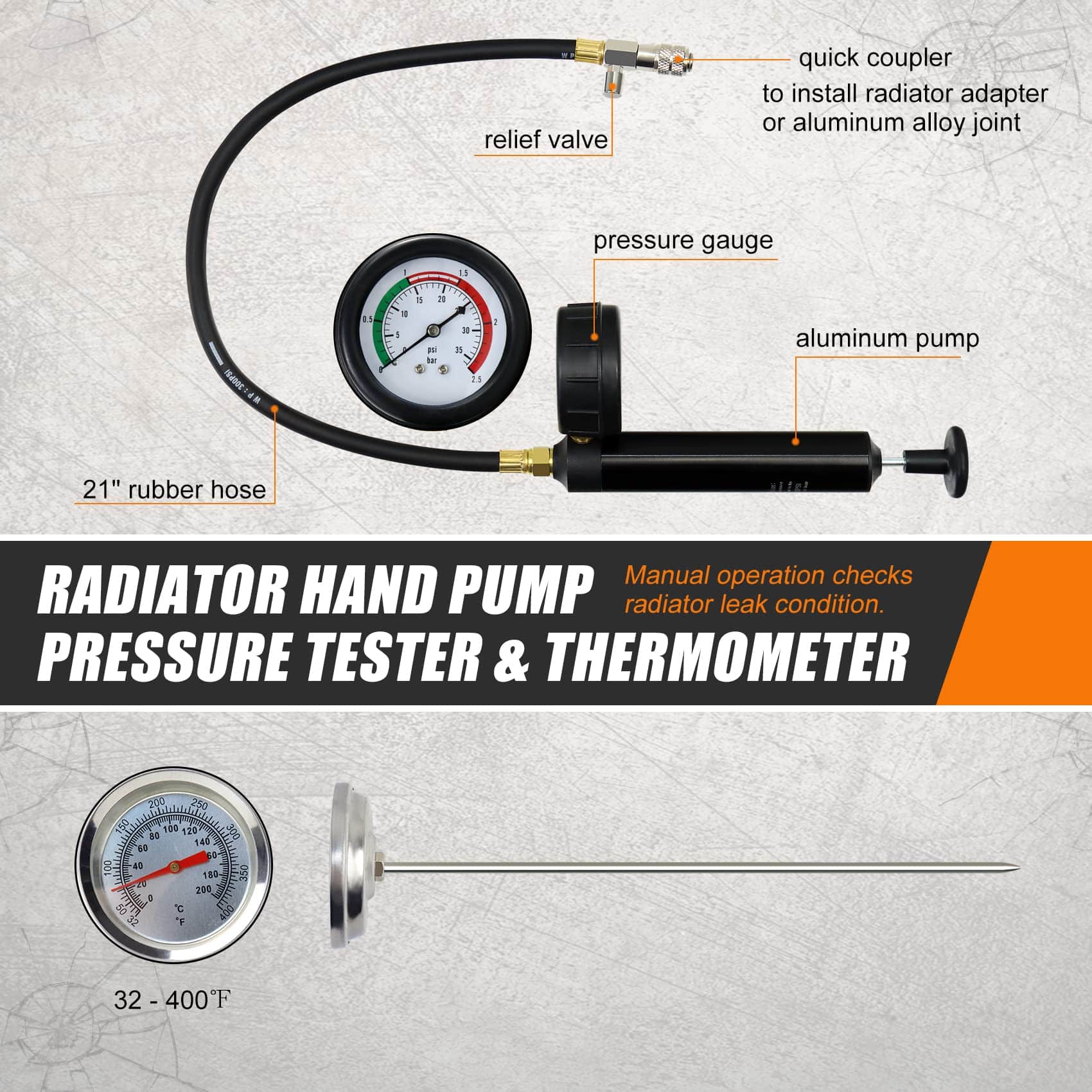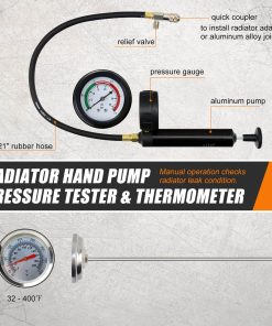 La bomba de mano de prueba de fugas de radiador está diseñada para realizar pruebas de presión manual en el radiador, lo que le permite verificar fácilmente la condición de sellado y detectar cualquier fuga potencial. El kit de presión de refrigerante incluye un manómetro de doble escala de 3″ para una lectura precisa de la presión (0-35 psi / 0-2.5 bar), un pumodio de aluminio duradero y una manguera anti-presión de 21″ para una conexión segura. El acoplador rápido le permite instalar o quitar rápidamente los adaptadores del radiador, mientras que la válvula de alivio de presión libera la presión residual en cuestión de segundos, evitando la molestia de desconectar la manguera.