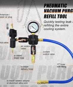 La operación de llenado de vacío neumático es eficiente y sin desorden, lo que le permite reemplazar el refrigerante rápidamente sin crear burbujas de aire en el sistema. El llenador de refrigerante al vacío está equipado con un cuerpo de colector de latón duradero con una cubierta de plástico, un manómetro de vacío para una medición precisa (-30-0 inHg, -76-0 cmHg), una manguera azul de 17″ con acoplador rápido, un enchufe de aire americano y válvulas de interruptor para un control preciso.