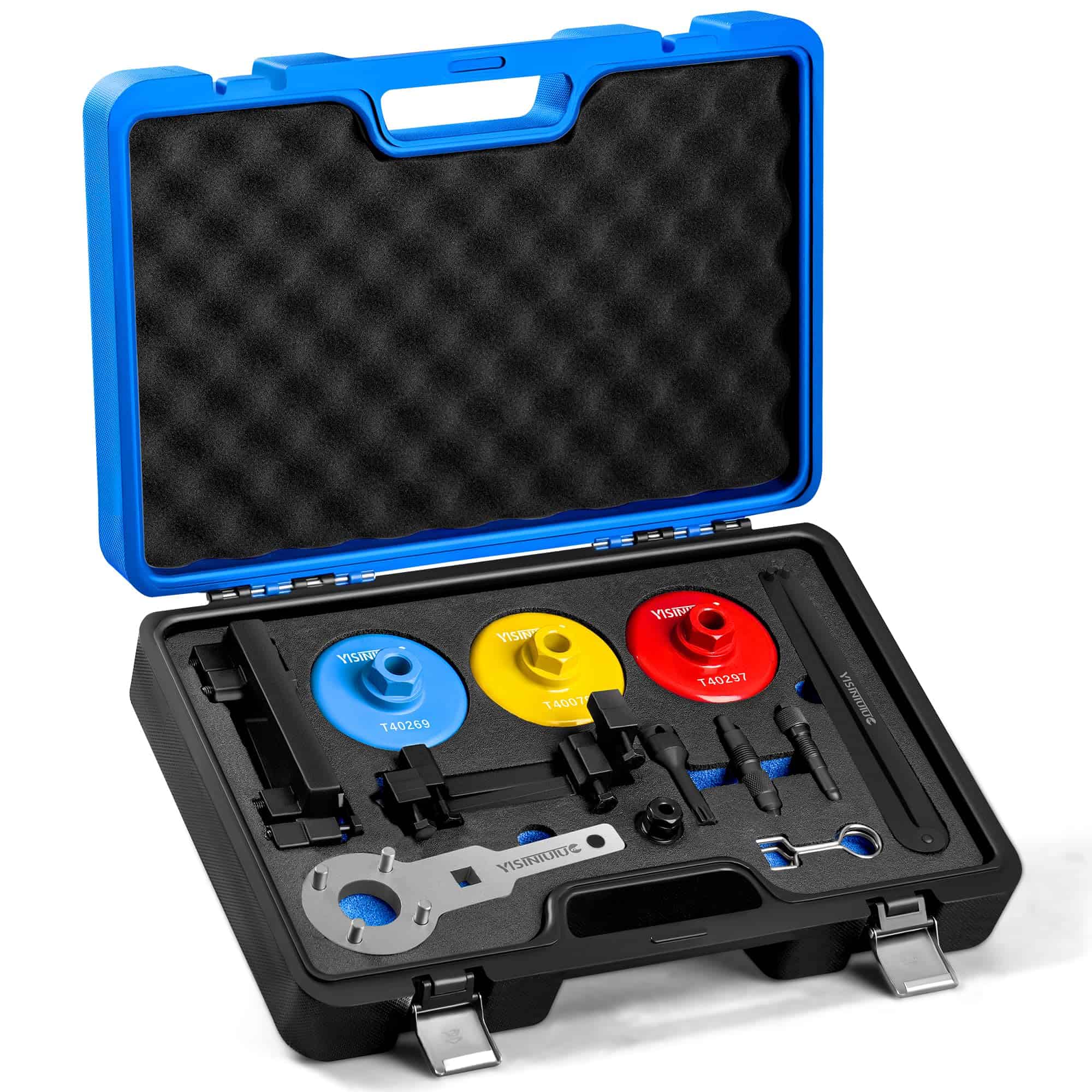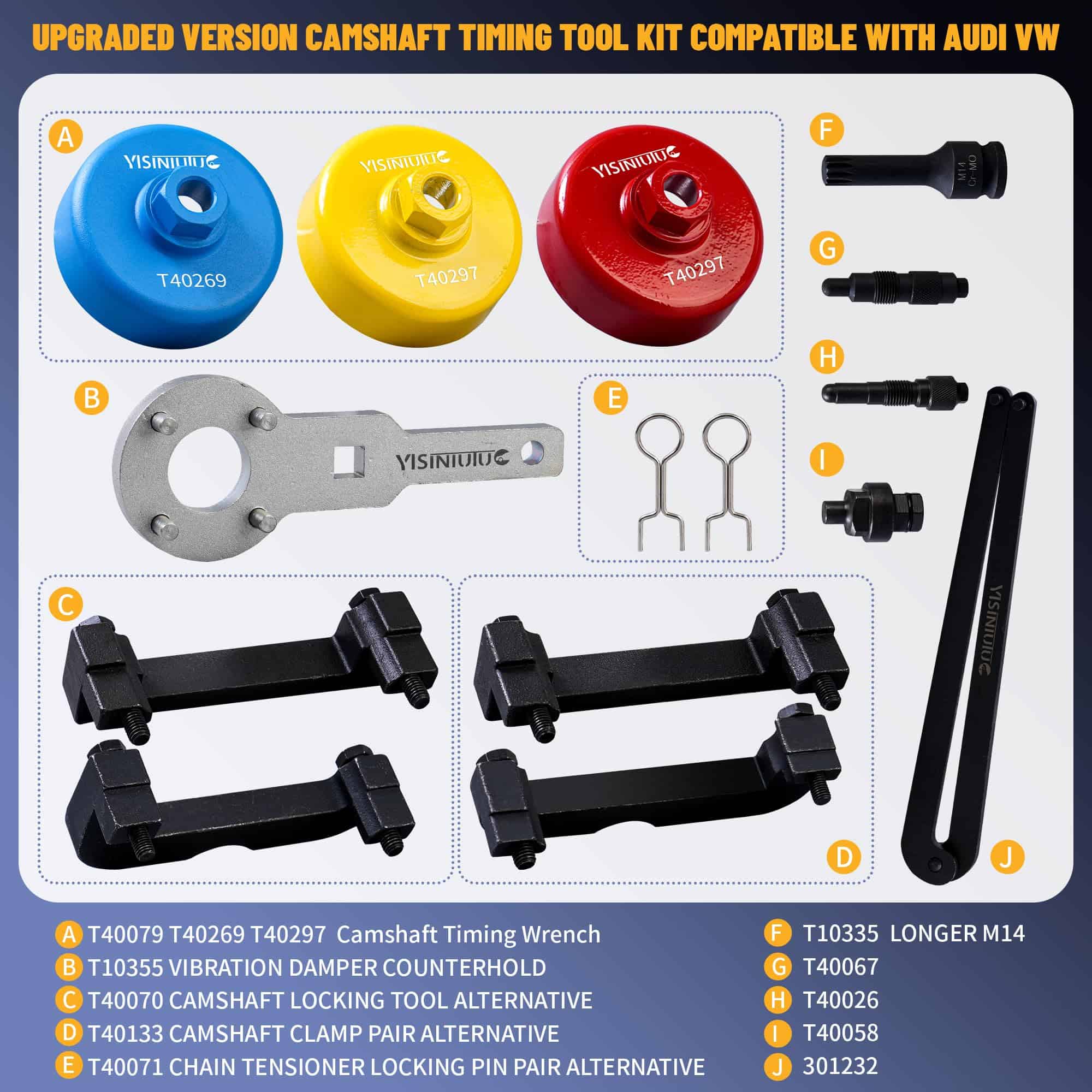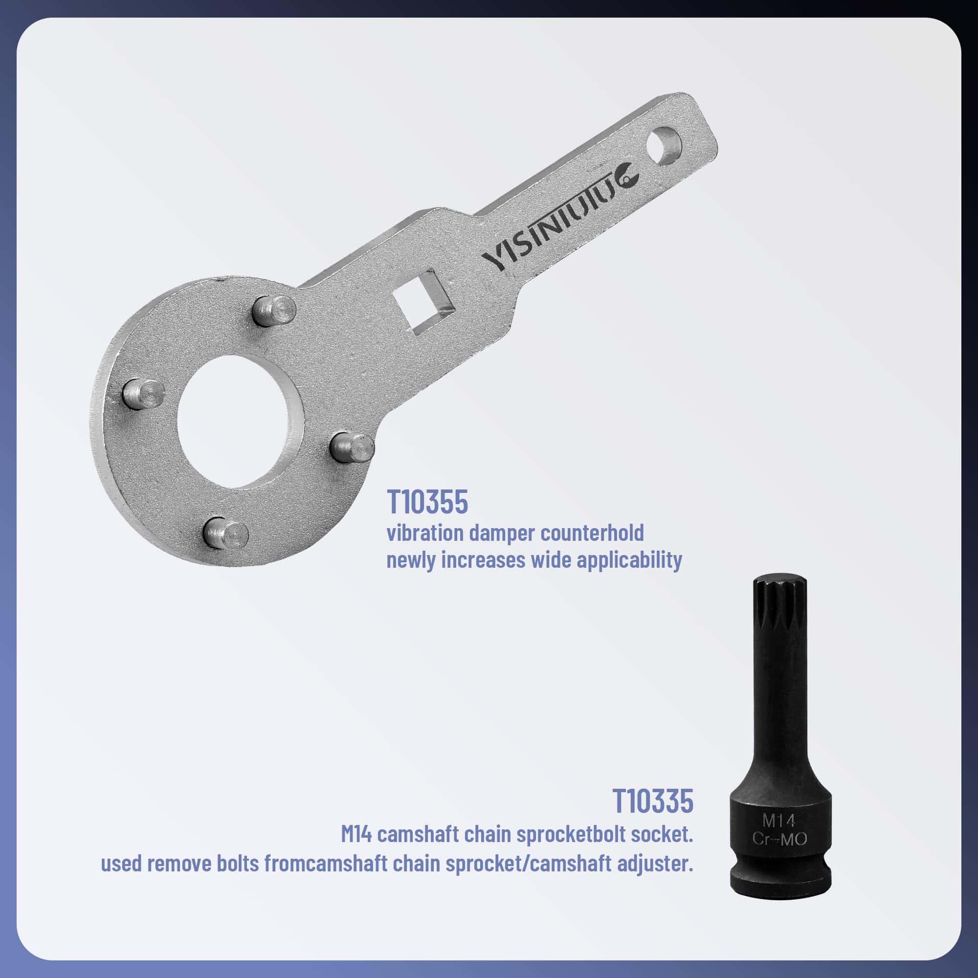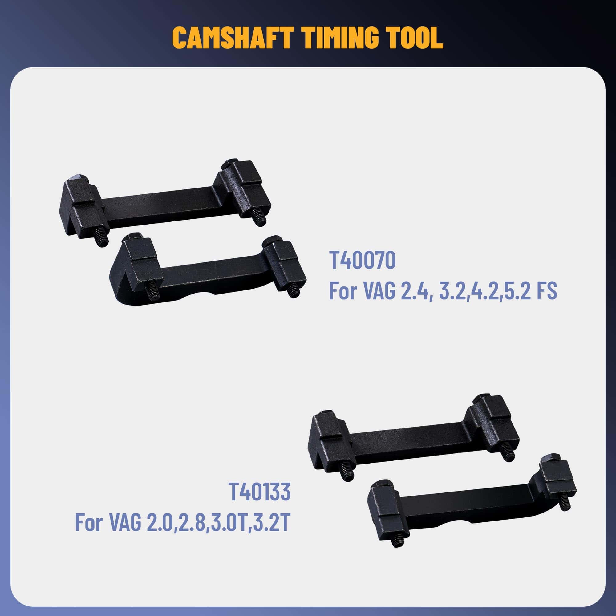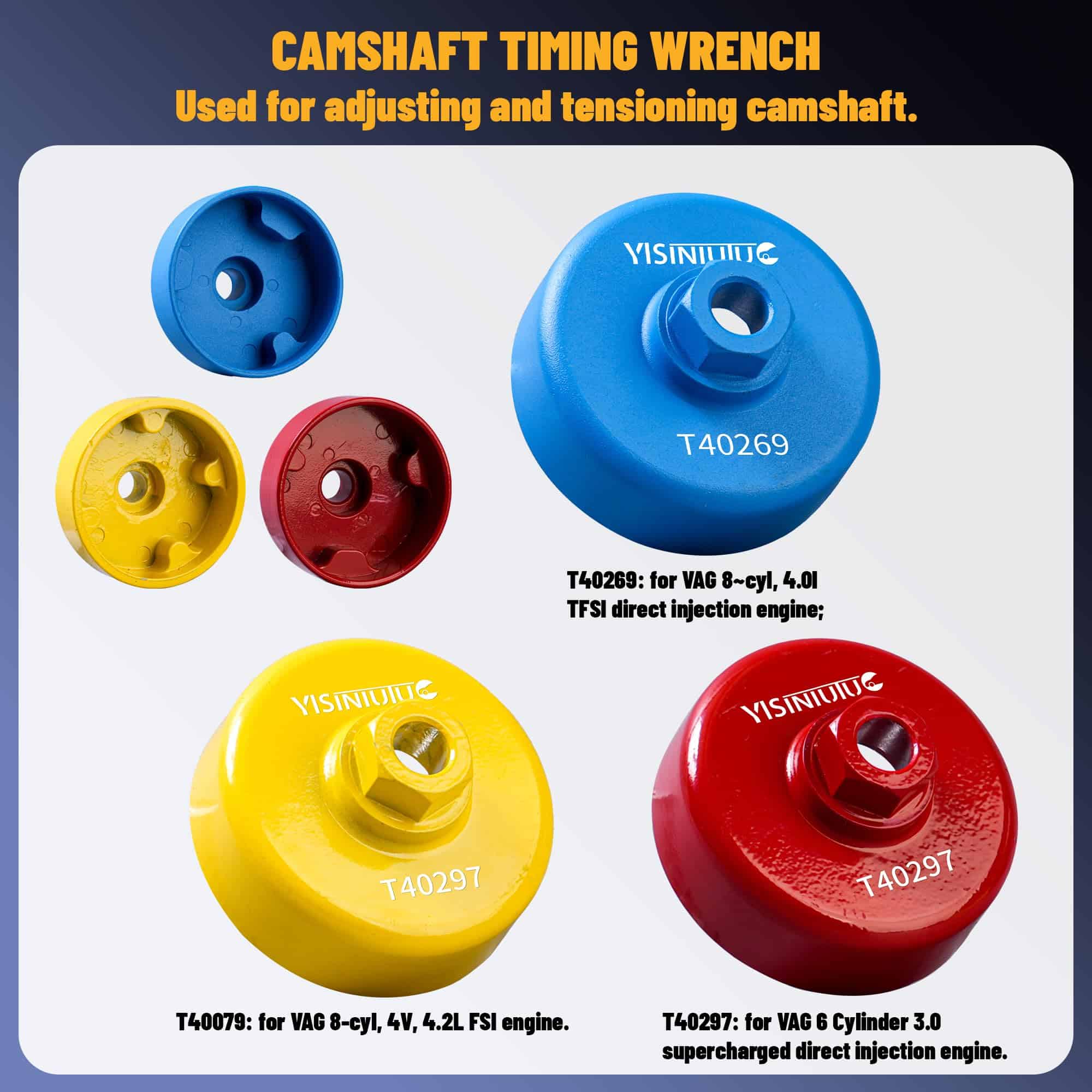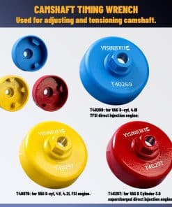 4. Versión mejorada: El kit está equipado con una llave de vaso ajustadora del árbol de levas para ajustar y tensar el árbol de levas, T40079 compatible con VAG 4.2 FSI; T40269 compatible con VAG 4.0 TFSI y T40297 compatible con VAG 3.0; Equipado con una llave de sujeción de piñón del árbol de levas, reemplaza para VAG 3036 T10172, diseñada para sostener el árbol de levas o el piñón.