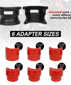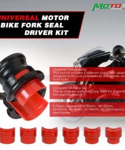 1. Universal Fork Seals El juego de herramientas para conducir sellos de horquilla de motocicleta incluye 2 cuerpos de acero y 6 adaptadores 35/36 mm, 40/41 mm, 42/43 mm, 45/46 mm, 47/48 mm y 49/50 mm. Un juego de herramientas para conducir sellos de horquilla se utiliza para la mayoría de horquillas delanteras convencionales y de cabeza para abajo.