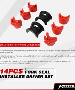 3. Diseño Útil El diseño en forma de brida del cuerpo de acero te permite instalar el protector de horquilla de motocicleta con menos esfuerzo y una operación precisa. La herramienta para conducir sellos de horquilla de moto no dañará tus sellos de horquilla nuevos durante la instalación, no es necesario envolver la herramienta para conducir sellos de horquilla con cinta adhesiva y proporciona un tamaño de conductor individual de precisión.
