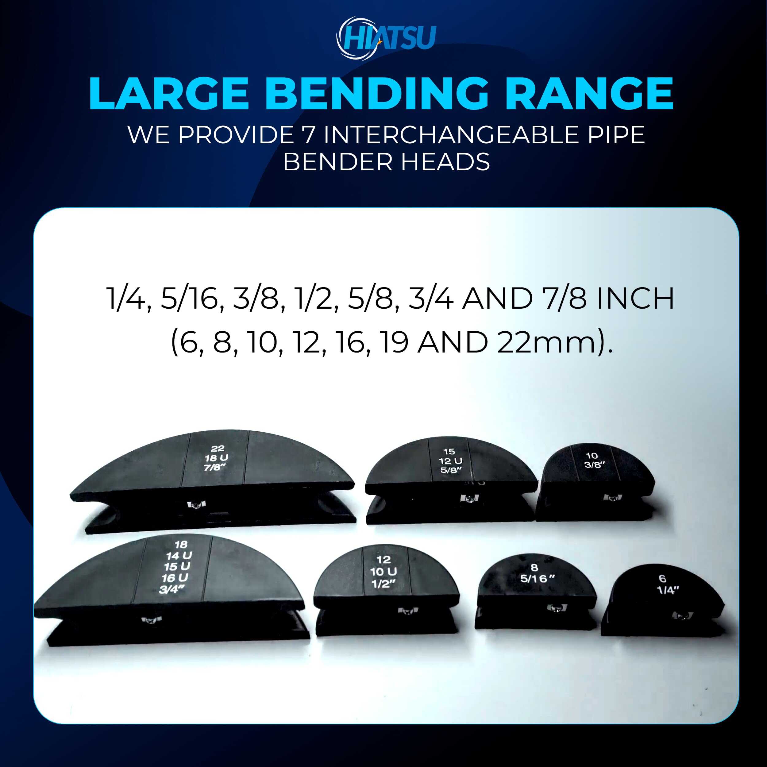 2. Rango de doblado profesional: Siete cabezales intercambiables de doblador de tubos de cobre se adaptan a múltiples tamaños: 1/4″, 5/16″, 3/8″, 1/2″, 5/8″, 3/4″ y 7/8″ (6 mm a 22 mm) – perfecto para técnicos HVAC, fontaneros y contratistas profesionales.