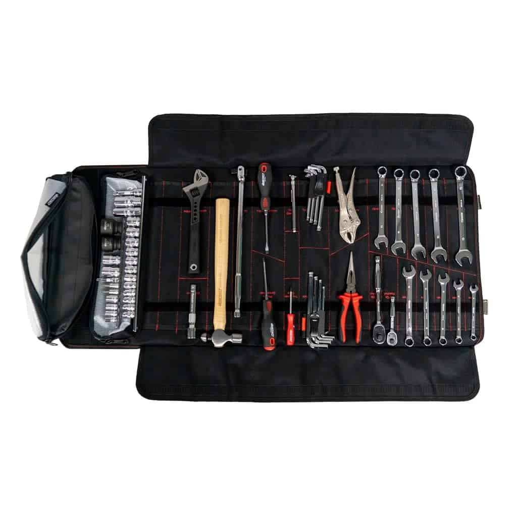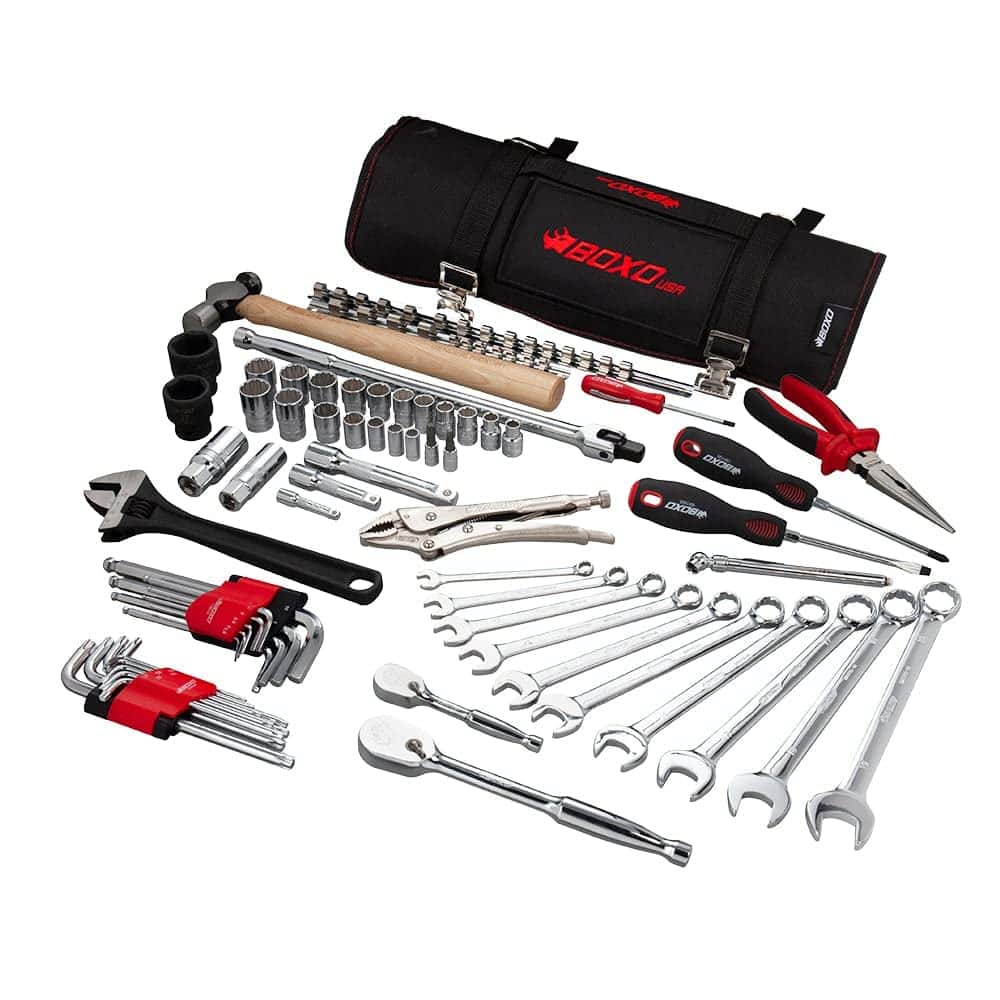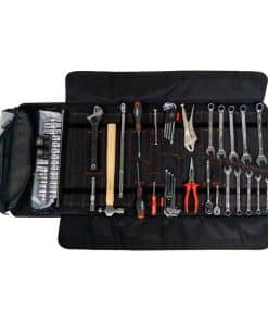 El juego de herramientas BoxoUSA de 66 piezas fue diseñado pensando en el mercado UTV para tu Polaris, RzR o CanAM. La selección de herramientas fue elegida a mano por entusiastas hardcore para abordar la mayoría de las reparaciones en los senderos. El mismo kit de herramientas genial, Tool Roll 2.0 que te encanta diseñado para los mercados de vehículos Powersports, Motorsports y de recreo, ahora con una Llave Ajustable Cromada. El Tool Roll de BoxoUSA está cargado con las herramientas más comúnmente utilizadas y está diseñado al estándar elevado del mercado móvil y profesional de herramientas. Estas herramientas satisfacen las necesidades de los entusiastas en los mercados de vehículos Powersports, Motorsports y de recreo que buscan una solución simple que incluya herramientas para abordar la mayoría de los trabajos. Probado y comprobado que es duradero para los elementos al aire libre, además, el tamaño compacto del roll de herramientas hace que sea fácil de colocar prácticamente en cualquier lugar de tu vehículo o equipo. La bolsa está cosida con Nylon de alta calidad para garantizar que tus herramientas permanezcan organizadas y no se sacudan. El roll presenta dos bolsillos para herramientas, uno cosido al roll con el conjunto de enchufes ampliado, y un bolsillo extraíble de velcro para herramientas adicionales que quieras llevar contigo. Las correas externas y las hebillas de resorte de metal duradero mejoran la seguridad de tus herramientas. Los 24 bolsillos para herramientas están etiquetados con el nombre de la herramienta respectiva para eliminar el trabajo de adivinar tu selección de herramientas. Además, los bolsillos opcionales para llave de torsión. No te conformes con otras opciones mediocres, cuando puedes tener el roll de herramientas todo en uno diseñado para mejorar todos tus viajes, ya sea en tierra o agua. Juego de herramientas métricas de 66 piezas con las herramientas más comúnmente utilizadas 24 bolsillos etiquetados muestran la selección de herramientas respectiva Roll de herramientas duradero y seguro hecho de Nylon de alta calidad Dos bolsillos para herramientas, uno cosido y un bolsillo de velcro extraíble Almacenamiento compacto y conveniente que se adapta a cualquier parte de un vehículo Manija montada, correas externas y broche de metal duradero Roll de herramientas versátil ideal para cualquier vehículo. Respaldado por el fabricante. El Juego de Herramientas Incluye: Enchufes de 12 puntos de 1/4″ Drive 8, 9, 10 y 13 mm Enchufes de 1/4″ Drive T30 y T40 Enchufes de 12 puntos de 3/8″ Drive 8, 9, 10, 11, 12, 13, 14, 15, 16, 17, 18 y 19 mm Enchufes de 5/8″ y 13/16″ para bujías Enchufes de 12 puntos de 1/2″ Drive 17 y 19 mm Enchufes de 6 puntos de 1/2″ Drive 27 y 30 mm Juego de llaves hexagonales Allen métricas de 9 piezas Juego de llaves Torx de 9 piezas Destornilladores planos de 6 x 100 mm y Philips PH2 x 100 mm Alicate de bloqueo de mandíbula curva de 7″ Alicate de nariz de aguja de 7″ con cortador de alambre Llaves combinadas métricas de 8, 10, 12, 13, 14, 15, 16, 17, 18 y 19 mm Llave ajustable de 10″ Trinquetes de mano de 1/4″ y 3/8″ 90T Barra de extensión de 1/2″ Drive de 380 mm Enchufes de extensión de Ball Peen Martillo de bola Manómetro de presión de neumáticos Válvula de neumático Bolsa enrollable Roll Up Tool Roll Pouch removible de herramientas