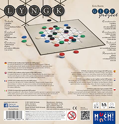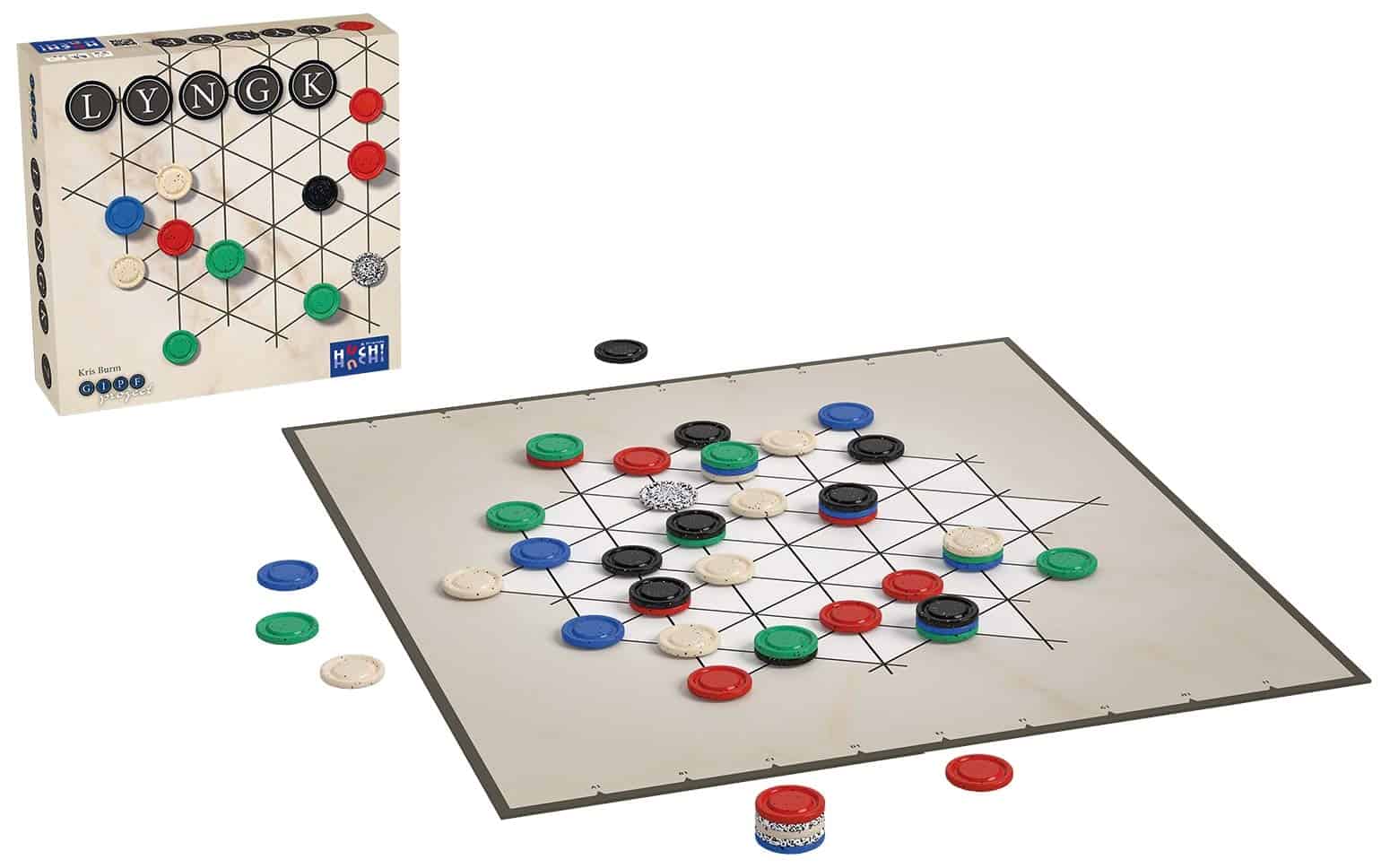 LYNGK es la síntesis de los primeros 6 juegos del proyecto GIPF y el epílogo perfecto de la serie. LYNGK se juega con 48 piezas de juego en 6 colores diferentes. Al principio, todos los colores son neutrales y no pertenecen a nadie. Durante el juego, los jugadores necesitan elegir 2 colores cada uno. El objetivo es construir pilas que consistan en 5 piezas de diferentes colores, con una pieza de tu color en la parte superior. Si utilizas tácticas inteligentes, planeas con anticipación y aprovechas al máximo la posibilidad de hacer múltiples movimientos utilizando piezas de tu propio color, tendrás la mayoría de las pilas de 5 al final y ganarás el juego.