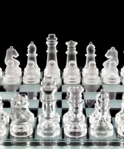 Set Includes: 1 x 14″ Glass Chess/Checkers Glass Board & 1 x 14″ Backgammon Board (2 Glass Boards), Set Includes: Frosted Glass and Clear Glass Chess Pieces, Marble Frosted Glass And Clear Glass Checkers/Backgammon Pieces, Playing Cards, Dominoes, Cribbage and Dice