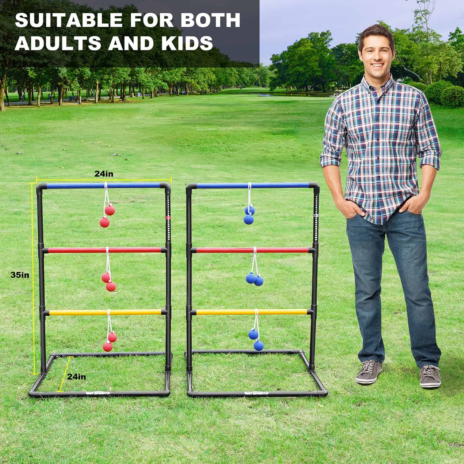 3. JUEGO DE INTERIOR Y EXTERIOR: Un divertido juego de fiesta para adultos, niños, adolescentes y familias, el juego de lanzamiento de escalera proporciona horas de entretenimiento en una barbacoa de verano, fiesta de cumpleaños, reunión en la piscina o reunión festiva. El juego de lanzamiento de escalera también se puede practicar en el interior, ya que el bolo es menos dañino.