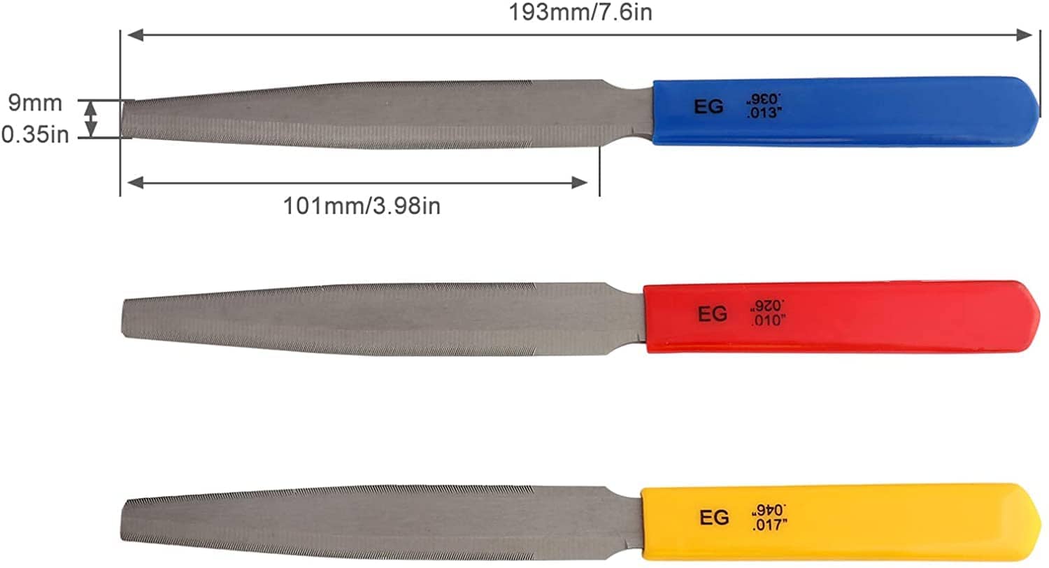 Excelente juego de limas en forma de V para guitarras eléctricas, acústicas o bajos. 3 limas de doble borde cónico para cortar ranuras de cuerdas en la cejuela. Esto es esencial para tiendas que construyen, reparan o cambian la cejuela. Se proporciona una bolsa de PVC para mantener los bordes de las limas protegidos. Cada juego contiene 3 limas de doble borde en su interior. Juego de 3 piezas para guitarras eléctricas: 3 limas de doble borde .010″/.013″/.017″/.026″/.036″/.046″, Juego de 3 piezas para guitarras acústicas: 3 limas de doble borde .016″/.026″/.036″/.042″/.050″/.055, Juego de 3 piezas para guitarras bajos: 3 limas de doble borde .045″/.065″/.075″/.085″/.105″/.130. Te brindaremos el mejor servicio de calidad, si tienes alguna pregunta, puedes contactarnos en cualquier momento, la resolveremos lo antes posible, para que puedas comprar con confianza y felicidad.