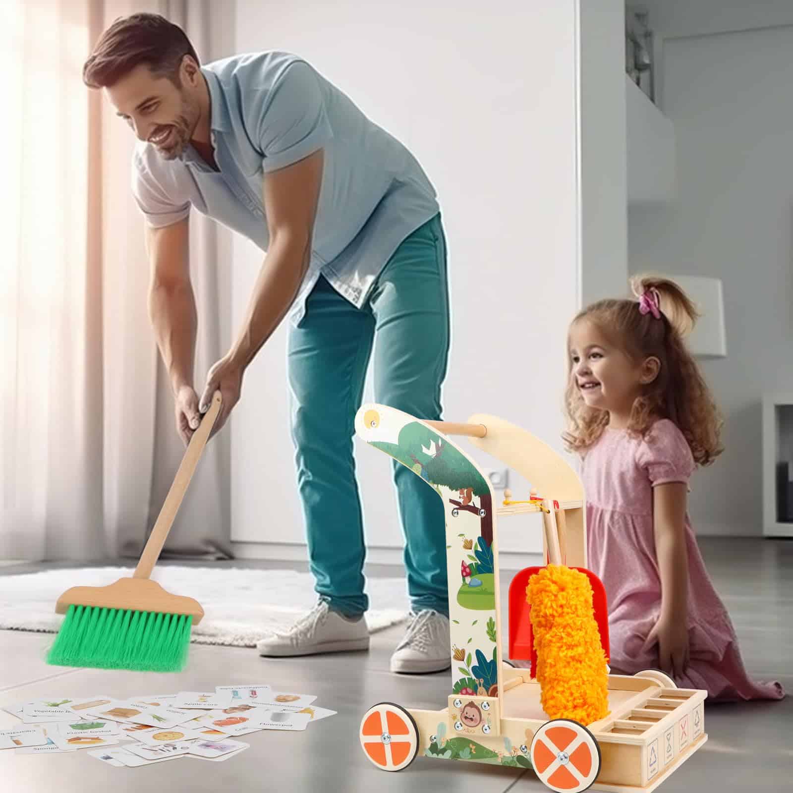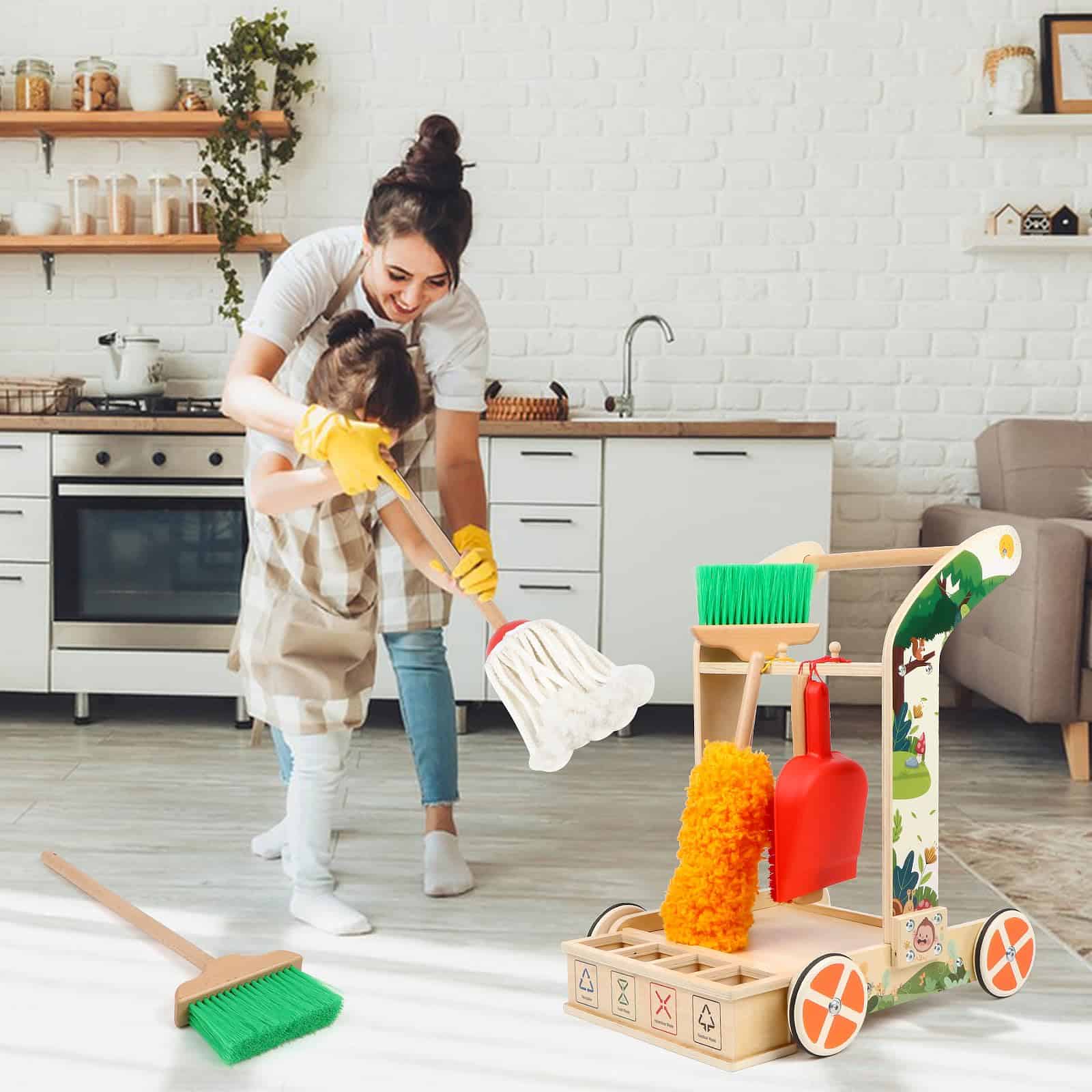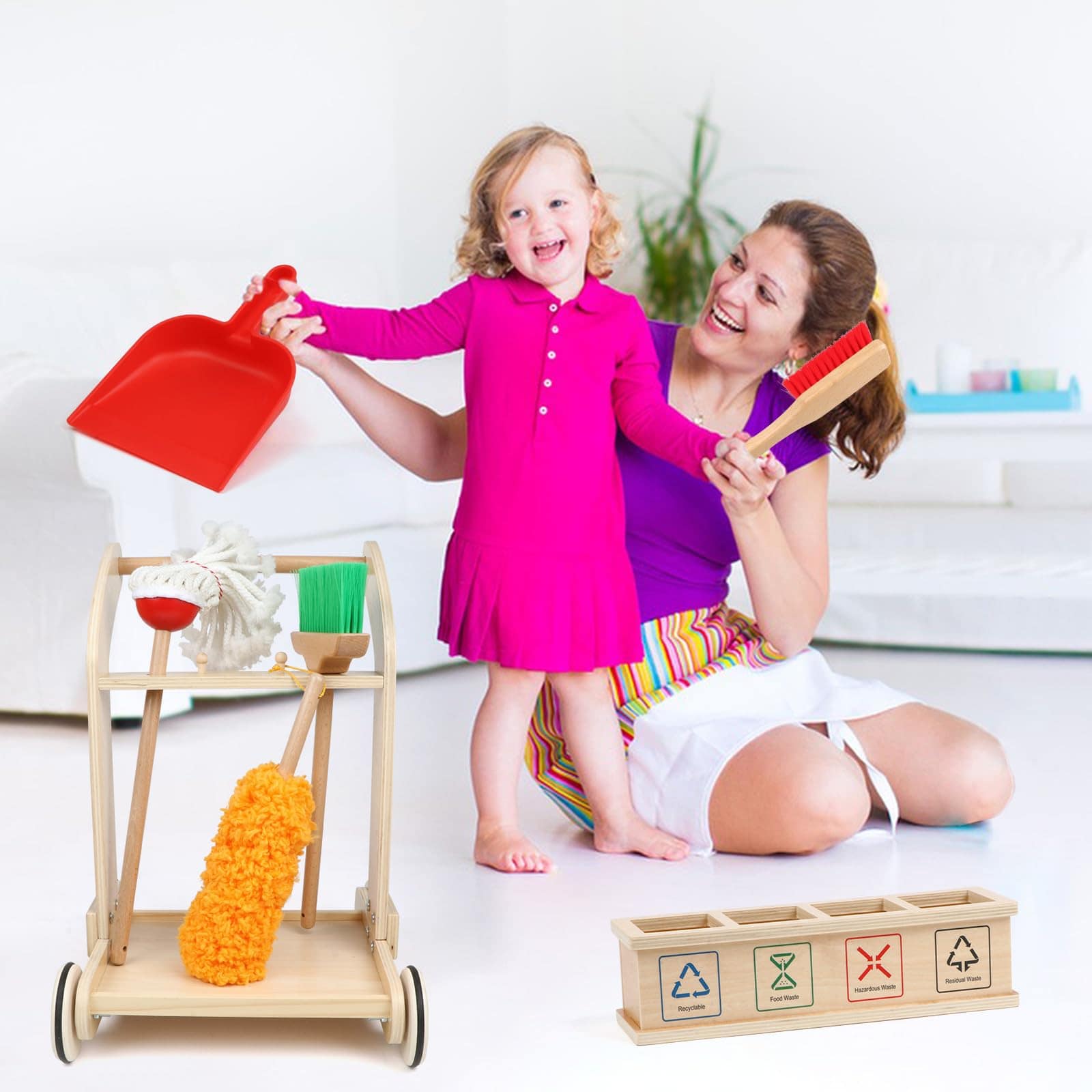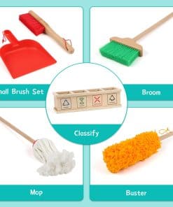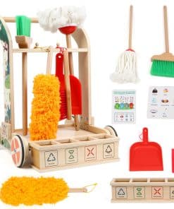 Juego de Limpieza para Niños Montessori de 8 Piezas con Escoba, Trapeador, Recogedor, Plumero, Categorizador de Basura, Juguetes de Madera Desmontables para Jugar a las Tareas Domésticas con Niños. Los niños aprenderán, se divertirán y desarrollarán un sentido de responsabilidad con este juego de limpieza. Incluye herramientas duraderas de madera y un carrito para facilitar el juego de roles. Perfecto para fomentar el interés por limpiar y desarrollar habilidades de limpieza en los niños. ¡Un regalo ideal para el crecimiento y la diversión de los más pequeños!