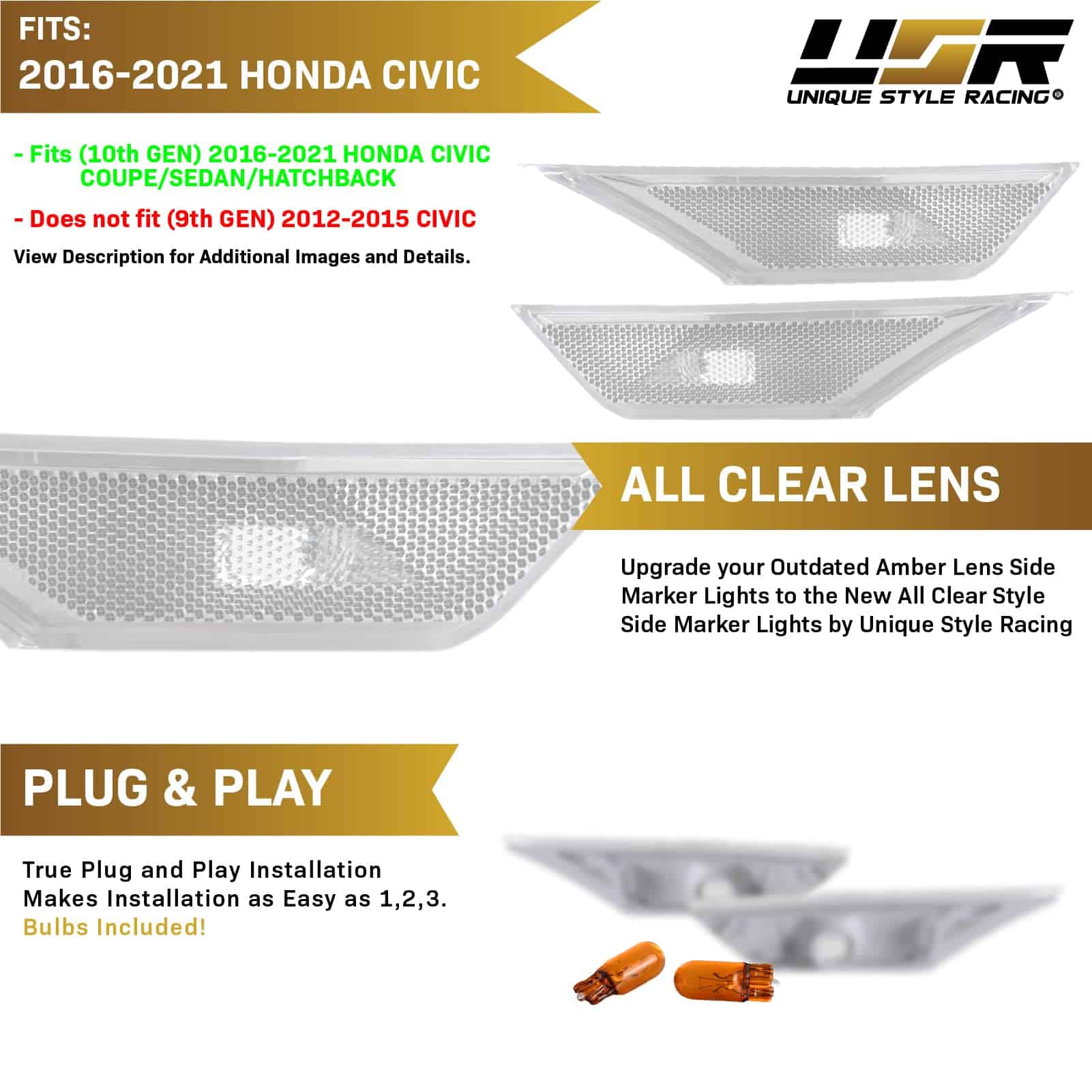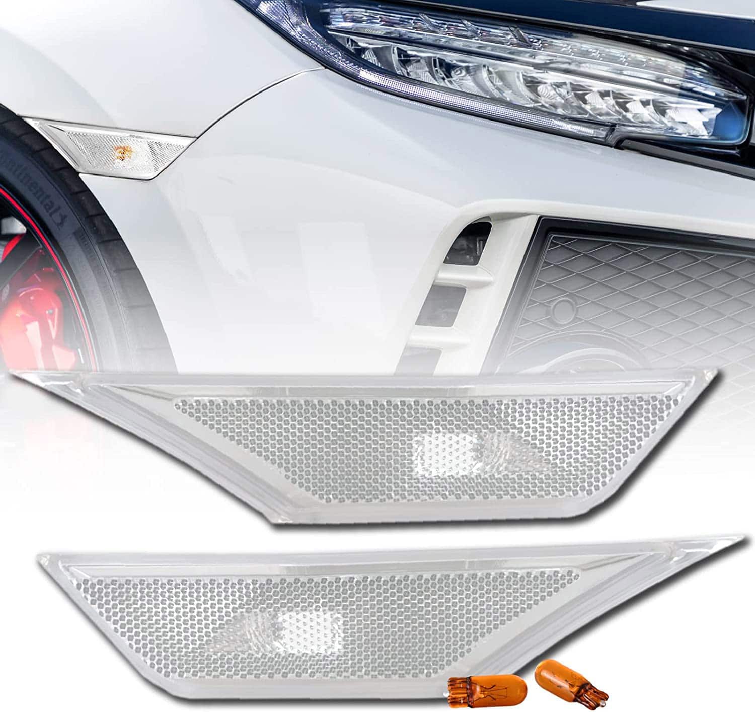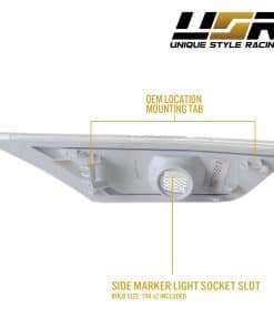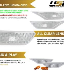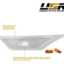 Este listado es para un juego de 2 piezas (izquierda + derecha) de luces de señalización lateral de parachoques con lente clara esmerilada / carcasa cromada para adaptarse a Honda Civic 2016-2020. Es un ajuste perfecto para los modelos de Civic Coupé de 2 puertas, Sedán de 4P y Hatchback de 5P. La compra incluye un par de bombillas halógenas T10 ámbar.