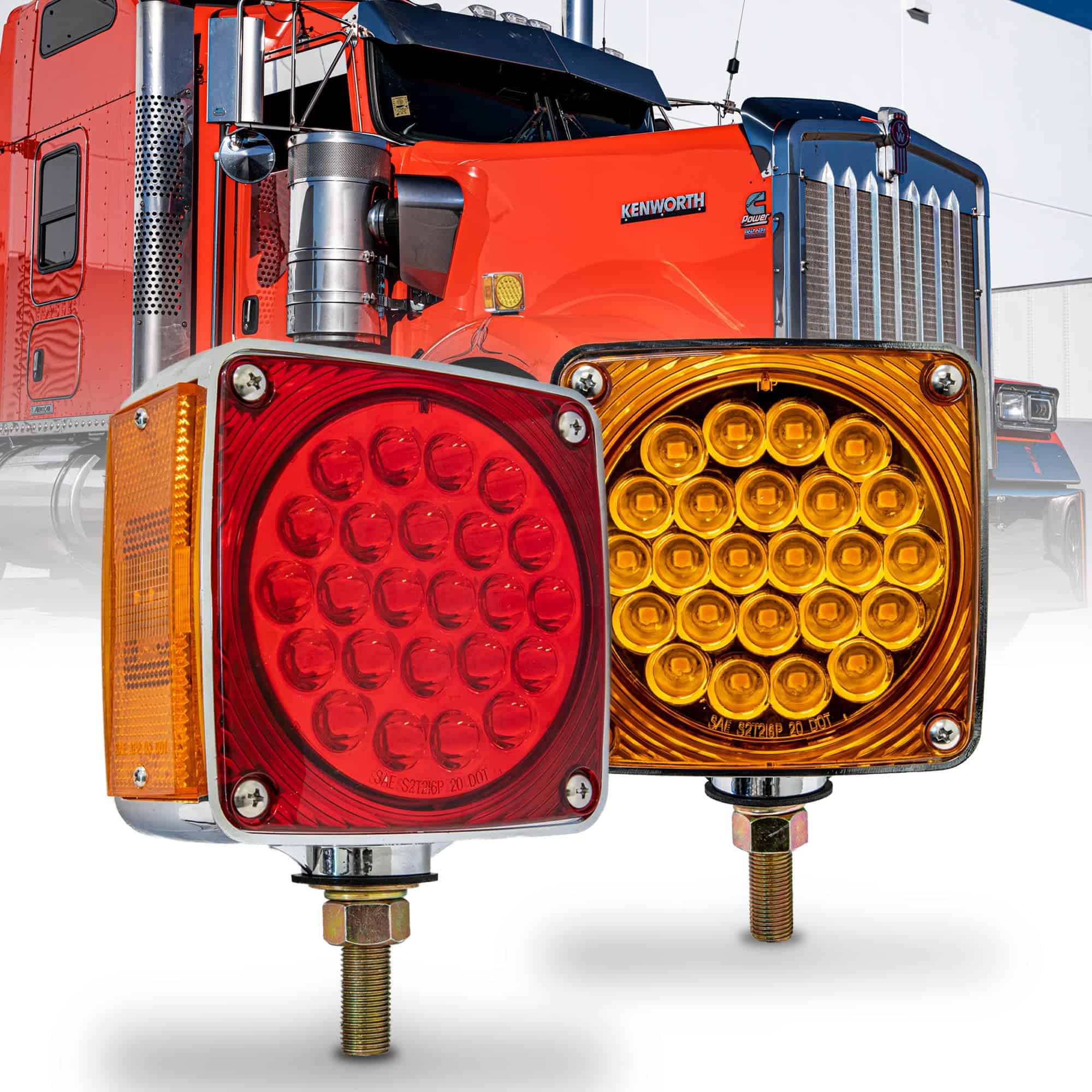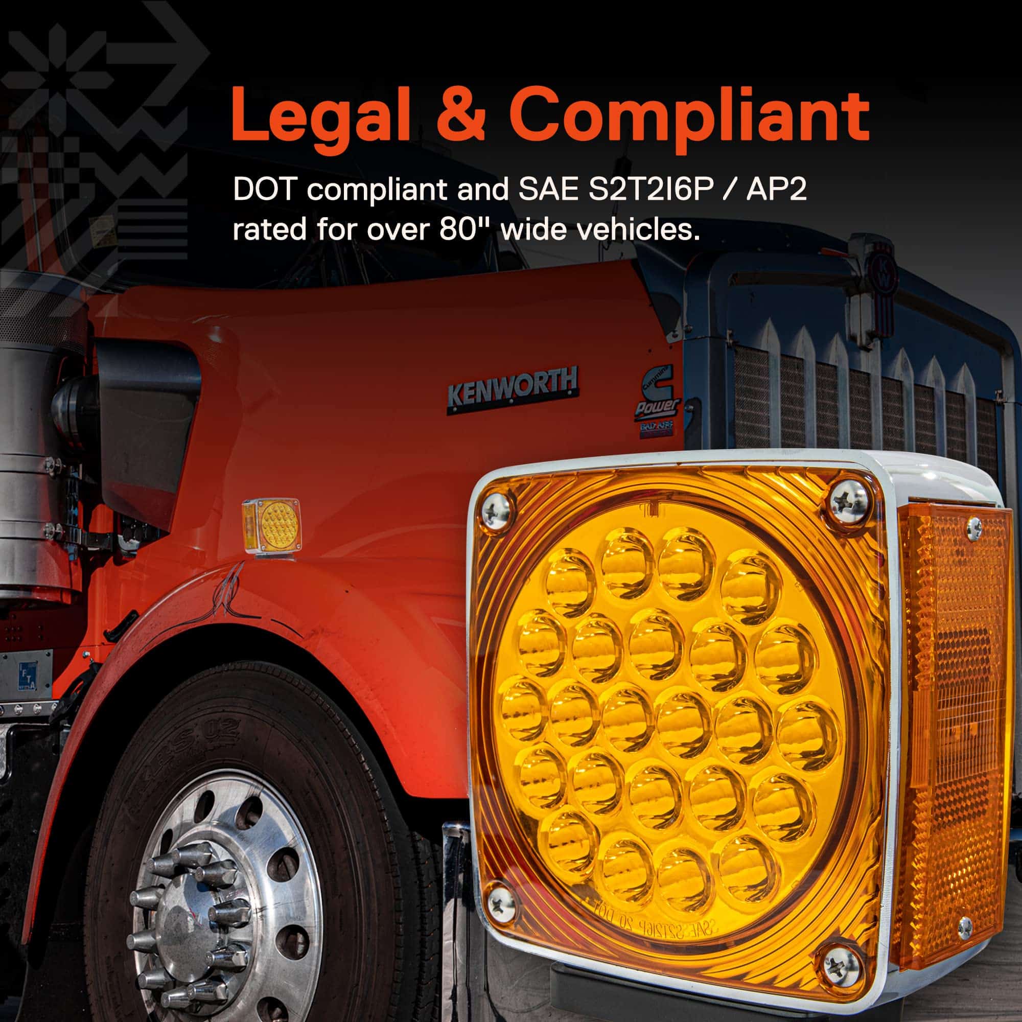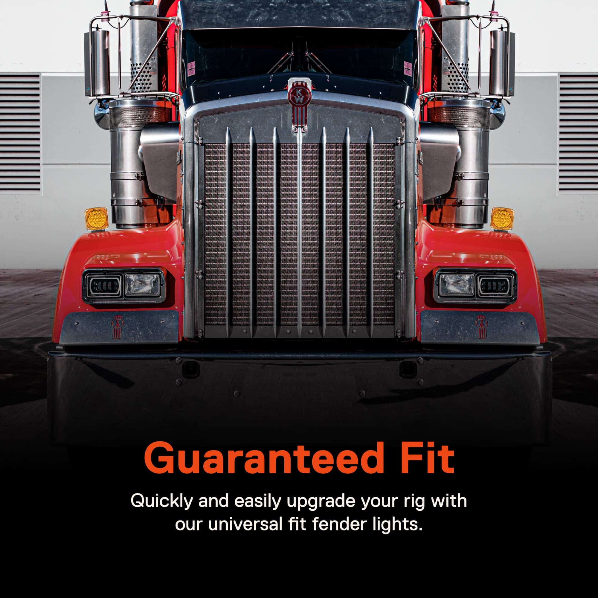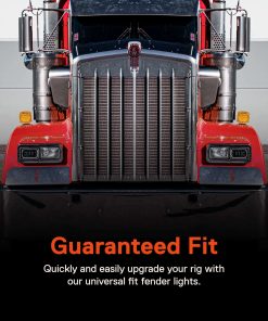 Lista para el camino por delante Los plazos, horarios, cronogramas, todo depende de la fiabilidad de tu camión. No dejes que algo tan simple como una luz de fender te retrase. Nuestras luces de fender cuadradas LED están diseñadas para mantenerte en la carretera y funcionando a tiempo. Totalmente impermeables, estas luces están listas para largas jornadas en cualquier clima. Y, gracias a sus lentes irrompibles de policarbonato y su resistente cuerpo de ABS, estas luces resistirán la prueba del tiempo. Paz mental La durabilidad no es la única consideración al elegir una luz de fender. Las mejores luces son resistentes y legales. Las luces DOT compliant están construidas mejor, brillan más y duran más que otras luces más débiles. Nuestras luces de fender ámbar y rojas cumplen con DOT FMVSS-108 y están clasificadas como SAE S2T2I6P / AP2 para uso como luces de freno, cola, señal de giro y estacionamiento. Incluso vienen con reflectores integrados para un nivel adicional de seguridad. Se instala más rápido Los largos tiempos de instalación pueden rápidamente comerse en tu presupuesto de actualización. Ahorra tiempo y dinero con nuestras simples luces de fender cuadradas para tu semi truck. Solo se necesitan tres cables para instalar estas luces y, con todo el hardware necesario incluido en el kit, puedes salir del taller y volver a la carretera para ganar dinero. Características Luz de Fender Cuadrada Cumple con DOT Para vehículos de más de 80 de ancho (Clasificado como SAE S2T2I6P / AP2) Luces de marcador lateral integradas Reflectores 50 LED por luz Montaje de perno individual o doble Lentes de policarbonato duraderas Cuerpo de ABS