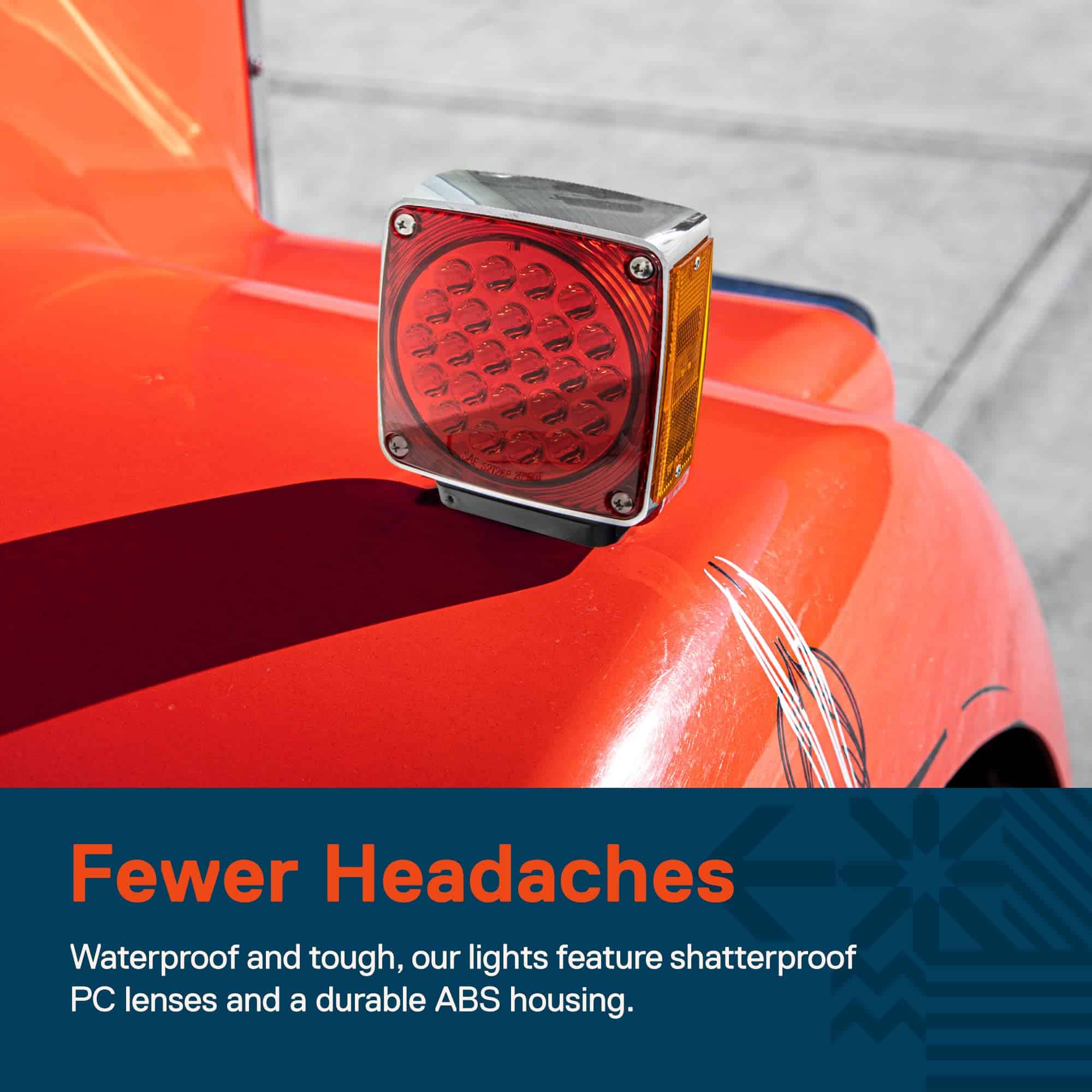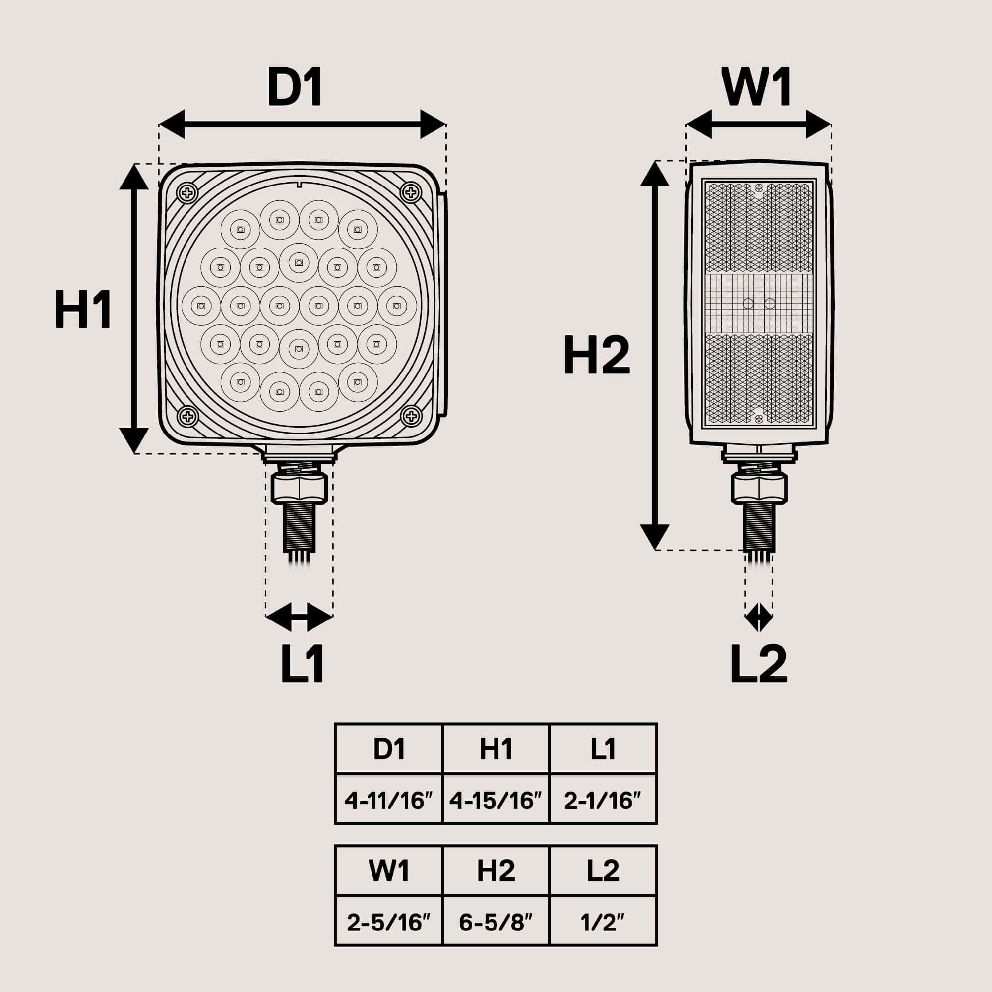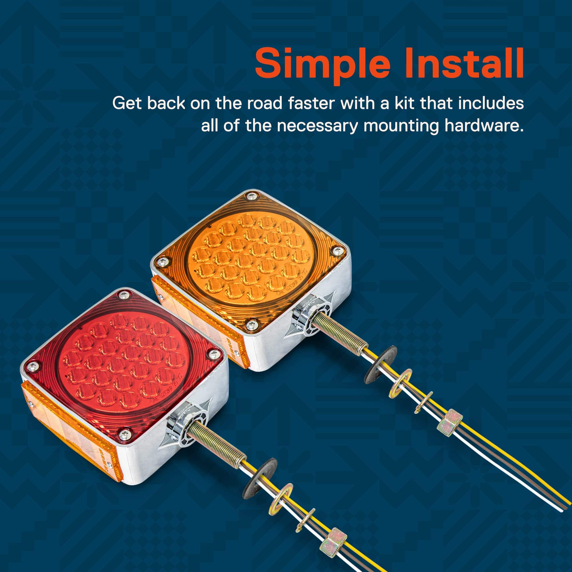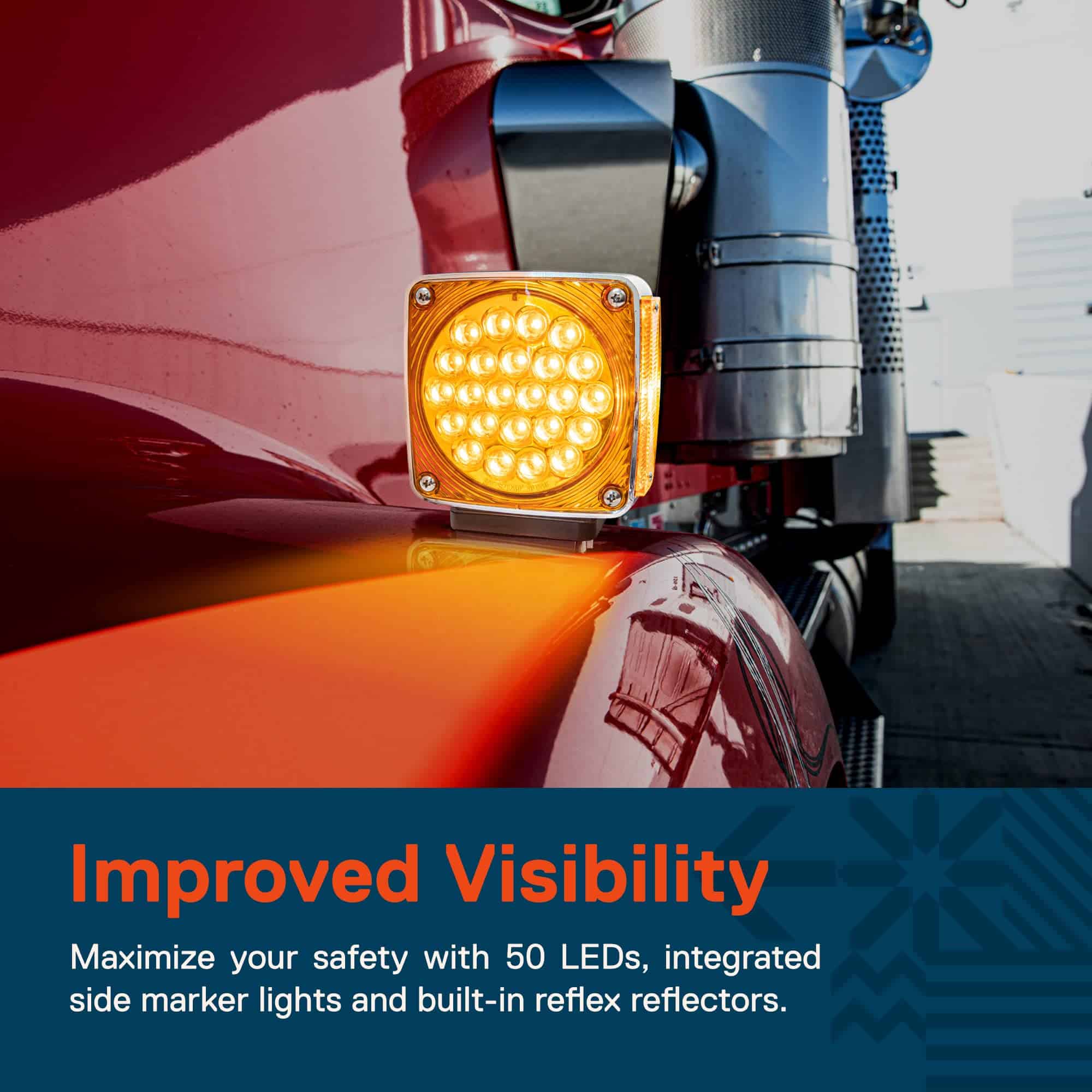 Lista para el camino por delante Los plazos, horarios, cronogramas, todo depende de la fiabilidad de tu camión. No dejes que algo tan simple como una luz de fender te retrase. Nuestras luces de fender cuadradas LED están diseñadas para mantenerte en la carretera y funcionando a tiempo. Totalmente impermeables, estas luces están listas para largas jornadas en cualquier clima. Y, gracias a sus lentes irrompibles de policarbonato y su resistente cuerpo de ABS, estas luces resistirán la prueba del tiempo. Paz mental La durabilidad no es la única consideración al elegir una luz de fender. Las mejores luces son resistentes y legales. Las luces DOT compliant están construidas mejor, brillan más y duran más que otras luces más débiles. Nuestras luces de fender ámbar y rojas cumplen con DOT FMVSS-108 y están clasificadas como SAE S2T2I6P / AP2 para uso como luces de freno, cola, señal de giro y estacionamiento. Incluso vienen con reflectores integrados para un nivel adicional de seguridad. Se instala más rápido Los largos tiempos de instalación pueden rápidamente comerse en tu presupuesto de actualización. Ahorra tiempo y dinero con nuestras simples luces de fender cuadradas para tu semi truck. Solo se necesitan tres cables para instalar estas luces y, con todo el hardware necesario incluido en el kit, puedes salir del taller y volver a la carretera para ganar dinero. Características Luz de Fender Cuadrada Cumple con DOT Para vehículos de más de 80 de ancho (Clasificado como SAE S2T2I6P / AP2) Luces de marcador lateral integradas Reflectores 50 LED por luz Montaje de perno individual o doble Lentes de policarbonato duraderas Cuerpo de ABS
