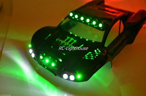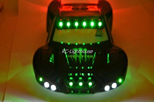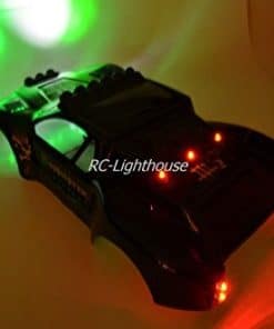 Luces delanteras: 4 LED blancos extra grandes de 5 mm 2 LED verdes de niebla de 3 mm para la entrada frontal: 3 LED verdes de 5 mm. Para la barra de luces superior del techo: 6 LED verdes de 5 mm Luces de freno: 4 LED rojos extra grandes de freno de 10 mm 3 LED de acento ámbar de 3 mm Energía: Enchufe JST – (enchufe de desconexión rápida) Enchufe JR (conexión directa a su receptor). La entrada de luz delantera, la barra de luz superior y el cuerpo no están incluidos.