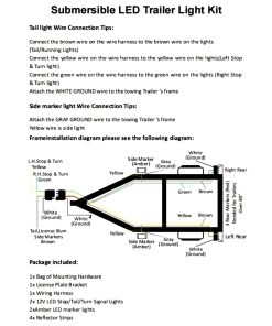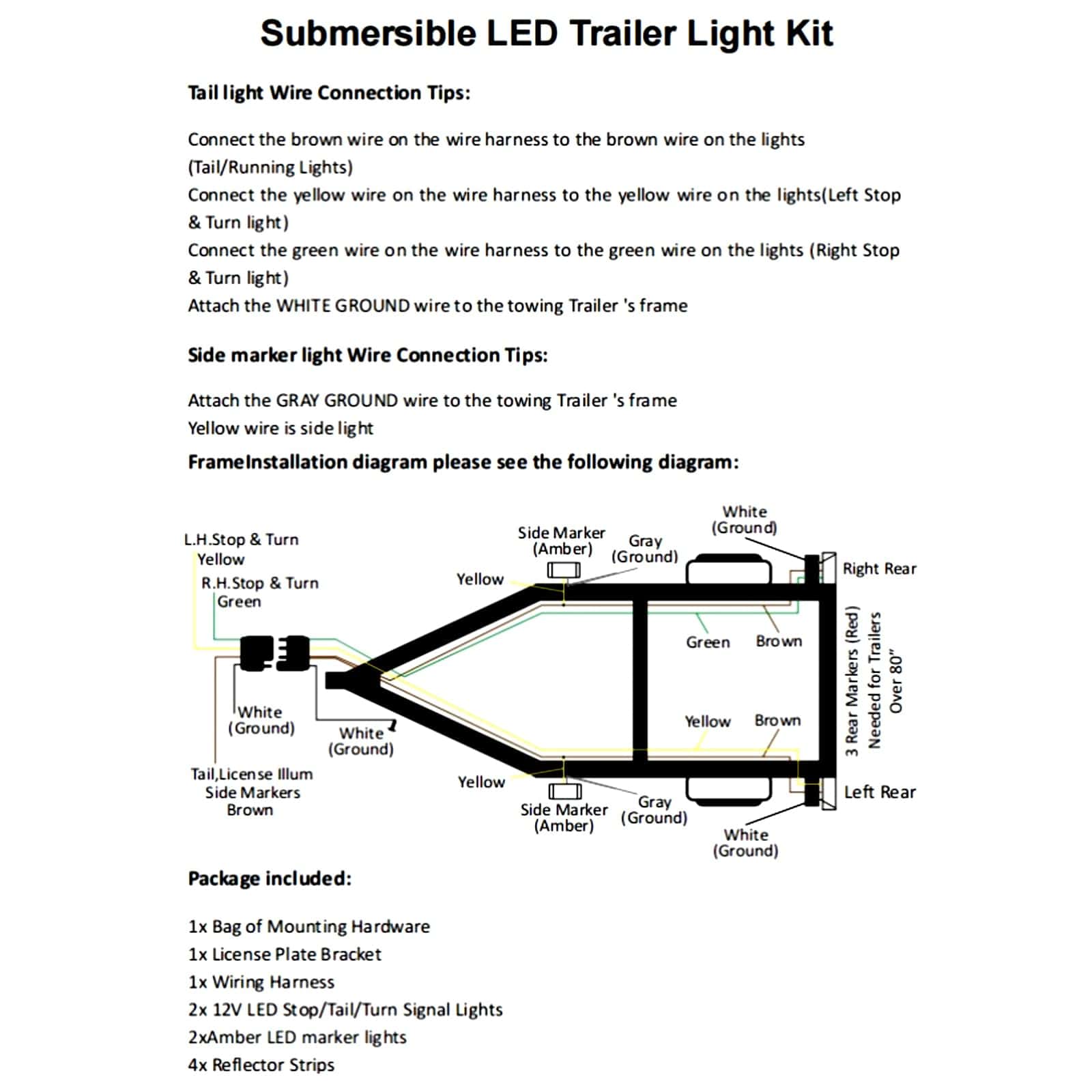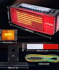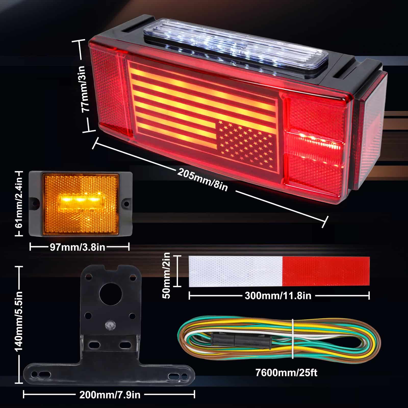 4. Kit completo de luces para remolque: 2 luces traseras rectangulares combinadas de LED, 2 luces de marcador LED ámbar, arnés de cableado de 25 pies (arnés de cableado de 21.65 pies y arnés de cableado de 3.93 pies), soporte de matrícula y hardware de montaje. El arnés de cableado para remolque es lo suficientemente largo para instalar.
