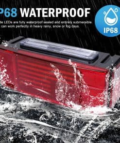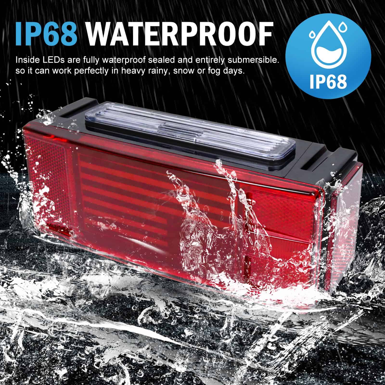 3. Súper impermeable y sumergible: Este juego de luces LED para remolque tiene un diseño resistente al agua IP 68, sin tornillos en la superficie de la lámpara, completamente sellado, puede funcionar perfectamente en mal tiempo como días de lluvia intensa, nieve o niebla. Las luces traseras también pueden resistir de manera efectiva la invasión y corrosión de arena, polvo, suciedad, nieve, etc., garantizando una larga vida útil.
