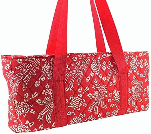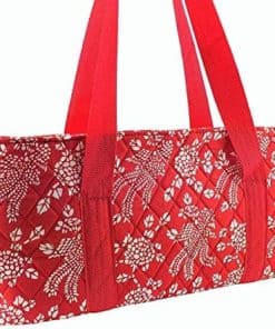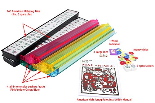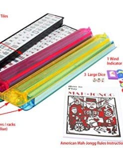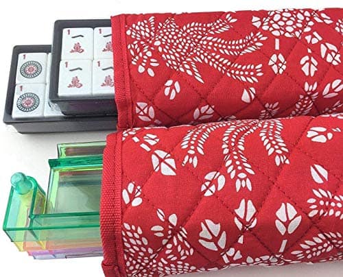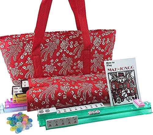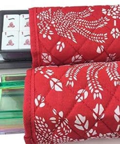 Juego completo de Mahjong de 166 fichas en un elegante estuche de transporte suave ROJO con diseño de fénix Características del Estuche: 19″ (L) x 8″(H) x 3″(D) Tamaño de la caída de la correa: 13″ 4 Empujadores/Racks de 4 Colores incluidos Descripción del Producto: Este elegante set de Mahjong americano de alta calidad viene completamente equipado en un estuche de transporte suave con correas para los hombros resistentes, lo que lo hace muy conveniente de llevar. El estuche suave es ultraligero y presenta un elegante diseño de fénix rojo con patrón y cremalleras de doble vía para una fácil apertura y cierre. El set contiene 166 fichas premium de color blanco, todas grabadas y bellamente pintadas a mano. Hechas de melamina, son resistentes a los arañazos. Las fichas se dividen de la siguiente manera: 36 Dots, 36 Bams, 36 Cracks, 12 Dragons, 16 Winds, 16 Flowers, 10 Jokers y 4 Sueltes en blanco. Las fichas miden 1-1/8″ de alto x 7/8″ de ancho x 1/2″ de grosor. Los 2 estantes de fichas contienen 80 fichas cada uno, y se incluyen 6 fichas de repuesto (2 Jokers, 4 en blanco). Cada estante de fichas viene con una tapa de plástico transparente para mantener las fichas de forma segura en los estantes durante el transporte. Los estantes de fichas y los 4 racks/empujadores transparentes de 4 colores (la combinación de colores puede variar) están envueltos por una envoltura con cierres de velcro para mantenerse organizados y protegidos. Incluye 3 Dados Grandes, 90 Fichas de Dinero y 1 indicador de viento. ¡También se Incluye: «Manual de Instrucciones de Reglas de Mahjong» que te ayuda a dominar el juego o repasar las reglas y estrategias.