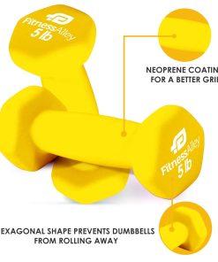 5. La caja incluye 2 mancuernas de 5 lb de tamaño y color amarillo. La construcción es de hierro fundido, de calidad superior junto con un agarre de neopreno que permite levantar pesos pesados de forma más fácil y sencilla.