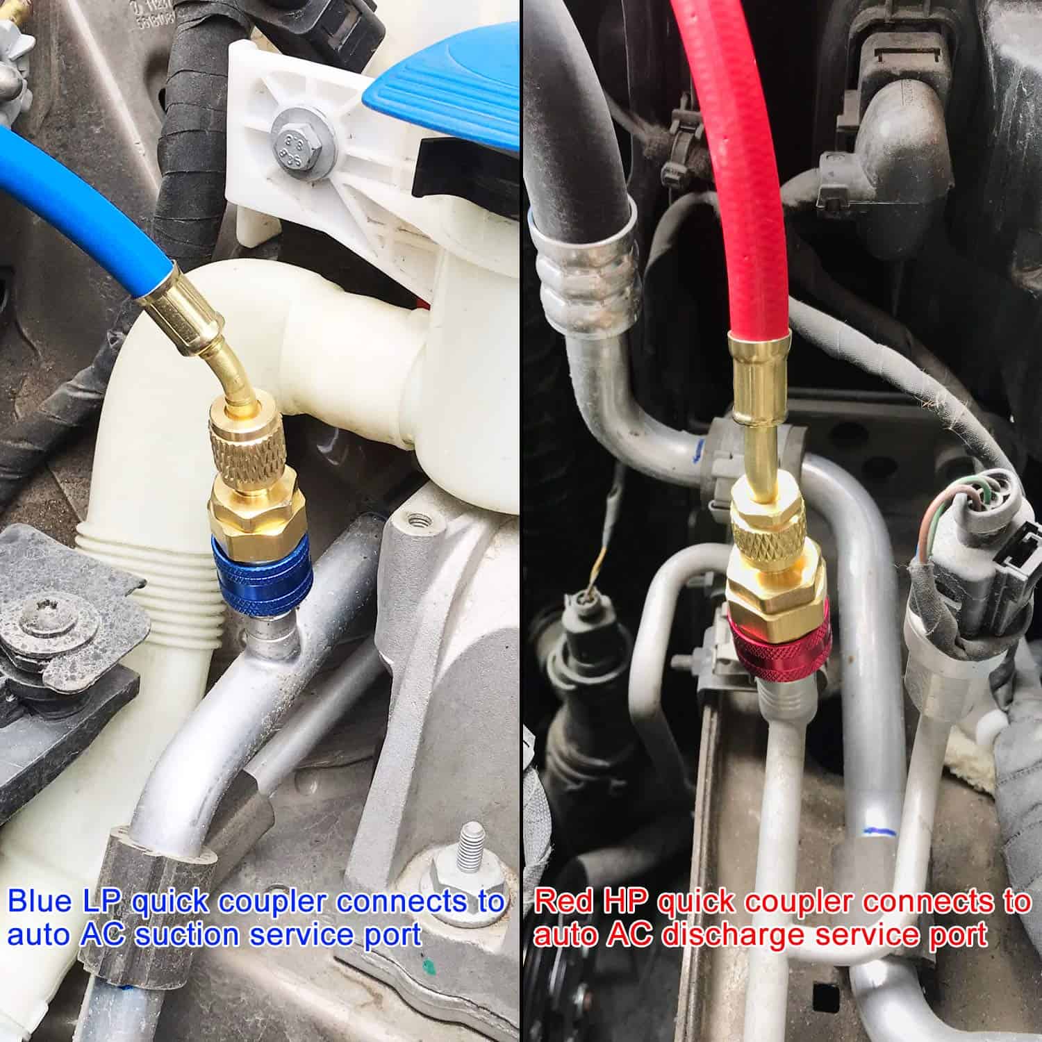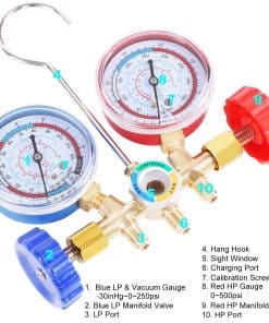 Juego de Manómetros 3 Vías JIFETOR, Herramienta de Carga de Refrigerante de Diagnóstico HVAC para Auto y Casa R404A R134A, Adaptador Válvula, Manguera de 5FT. El manómetro de AC de 3 vías de doble movimiento en latón auto AC, durable y anticorrosión. Manómetro de baja presión azul con rango -30 inHg a 250 PSI, alta presión roja de 0 a 500 PSI, unidad Celsius. Esfera grande de 2-3/4″ fácil de leer con escala codificada por colores, y ventana de observación en el manómetro para monitorear mejor y fácilmente la carga y recuperación del refrigerante. El tornillo de calibración incorporado y el puntero sin vibraciones garantizan la precisión de la medición. Perfecto para R404A R134A. Tres mangueras codificadas por colores de 5 FT: Refrigerante que carga el kit con las mangueras de resina de nylon de goma, que cuenta con la resistencia a la corrosión, baja resistencia al fluido, alta presión de carga, la durabilidad y buena estanqueidad al aire. La presión de trabajo máxima es de 600 PSI y la presión de ráfaga es de 3000 PSI. Cada lado está cargado con conexiones de 1/4″ hembra de latón para una conexión fácil. La manguera roja conecta el lado rojo del manómetro 1/4″ macho flare al acoplador rápido rojo, la azul a la azul, y la manguera amarilla conecta el puerto de carga central del medidor de AC al grifo de lata o bomba de vacío. Acoplamientos rápidos de AC R134A: Latón y aluminio de alta calidad, diseño de interfaz rápida con cerradura precisa y anillo de agarre moleteado antideslizante, fácil de conectar y desconectar, compatible con todos los modelos con puerto de servicio R134A. Conecte el acoplador azul al puerto de servicio de succión de AC y el rojo al puerto de servicio de descarga de AC. Apunte al puerto de servicio, presione para conectar y bloquear. Tire hacia arriba del anillo de agarre moleteado para aflojar y levantar para desconectar. Latón grifo de lata y adaptador: Grifo de lata R134A con interfaz de rosca hembra de 1/2″, puede enroscarse para fijarse en la abertura de botella de refrigerante de rosca macho de 1/2″. Pomos en forma de T, fácil de operar con las yemas de los dedos. El pasador interno con punta afilada ayuda a perforar la botella de R134A fácil y rápidamente. El grifo de lata y el adaptador de 1/4″ macho a 1/2″ hembra con válvula de cierre están hechos de latón premium, con alta dureza, resistencia al desgaste, resistencia a la corrosión, con anillo de sellado de goma, garantizan la estanqueidad del gas sin fugas. Multifunción: El juego completo de manómetros de AC de JIFETOR es perfecto para automotriz y hogar aire acondicionado evacuación/vaciado, revisión de diagnóstico, carga de refrigerante y recuperación. La caja de moldeo personalizada mantiene todo en su lugar y protege los manómetros durante el almacenamiento. También hay una instrucción detallada y bien escrita que lo ayudará a comprender y utilizar rápidamente este conjunto de herramientas.