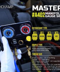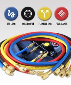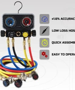 Juego profesional de manómetros de aire acondicionado, compatible con refrigerantes R1234YF R134A y R404A, ideal para carga de AC, vaciado, chequeo diagnóstico y trabajo de recuperación. Set de herramientas completo, incluye: MANÓMETRO DE ACTUALIZACIÓN de 4 vías con conexión macho de 1/4 de pulgada por válvula, manómetro calificado a 800 psi (rojo) y 550 psi (azul) de presión máxima. MANGUERA DE 4 PIEZAS de conexión hembra de 1/4 de pulgada para manguera roja, azul, amarilla, conexión hembra de 1/4 de pulgada a hembra de 5/16 de pulgada para manguera negra de 5FT de longitud con una presión máxima de trabajo de 800 psi y una presión de rotura de 4000 psi. ACOPLADORES DE 2 PIEZAS R134A Diseño ajustable sin fugas, adaptador rojo para descarga de alta presión y adaptador azul para succión de baja presión. Diseño rápido de acoplador de canicas, conexión macho de 1/4 de pulgada, cuerpo de aluminio con adaptador de latón extraíble. VALVULA DE SEGURIDAD DE LÍQUIDO R410A Cuerpo de latón, conexión macho de 1/4 de pulgada. GRIFO CAN Tipo de perforación, abridor de botellas de latas, conexión macho de 1/4 de pulgada con abrazadera ajustable. ADAPTADORES DE CONVERTIDOR DE MANGUERA Juegos de adaptadores de tanques de latón de 2 piezas, p1 conexión macho de 5/16 de pulgada a hembra de 1/4 de pulgada, p2 conexión macho de 1/4 de pulgada sae a hembra de 1/2 de pulgada acme rh. Adaptador giratorio de latón de 1 pieza, macho sae de 1/4 de pulgada a hembra sae de 5/16 de pulgada. BONO Removedor de válvula Destornillador de calibración Guantes