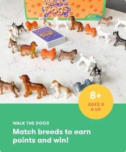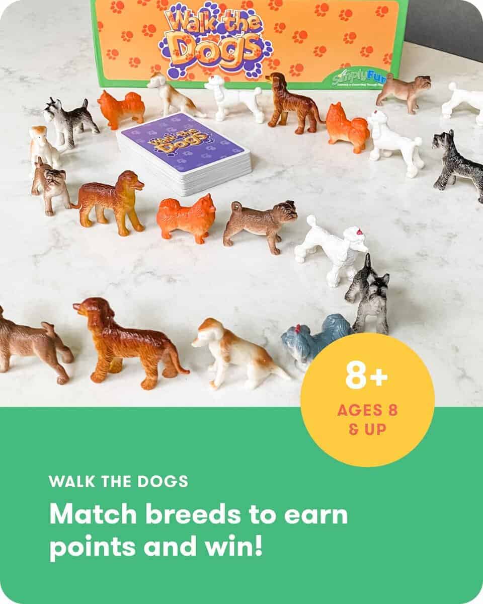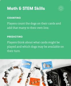 Walk the Dogs es un juego de matemáticas para niños que ayuda a los jugadores de 8 años en adelante a mejorar habilidades matemáticas básicas de una forma práctica y agradable. ¡Usa en casa o en el salón de clases! Impulsa tus habilidades matemáticas tempranas con este emocionante y educativo juego de matemáticas que potencia la multiplicación temprana a través de cartas y 63 lindos perros con el objetivo de crear una línea de perros con la mayor cantidad posible de la misma raza juntos. A medida que los jugadores participan en Walk the Dogs, se les anima a practicar el pensamiento estratégico al considerar las cartas que tienen, los perros disponibles y sus posibilidades de ganar el juego. ¡El riesgo y la recompensa son clave en este juego estratégico! ¡Crea una fila de perros con la mayor cantidad posible de la misma raza juntos! ¡Agrega perros a tu fila solo al principio o al final de tu fila! ¡Gana puntos por cada conjunto o gana teniendo cinco de la misma raza en fila en tu línea!