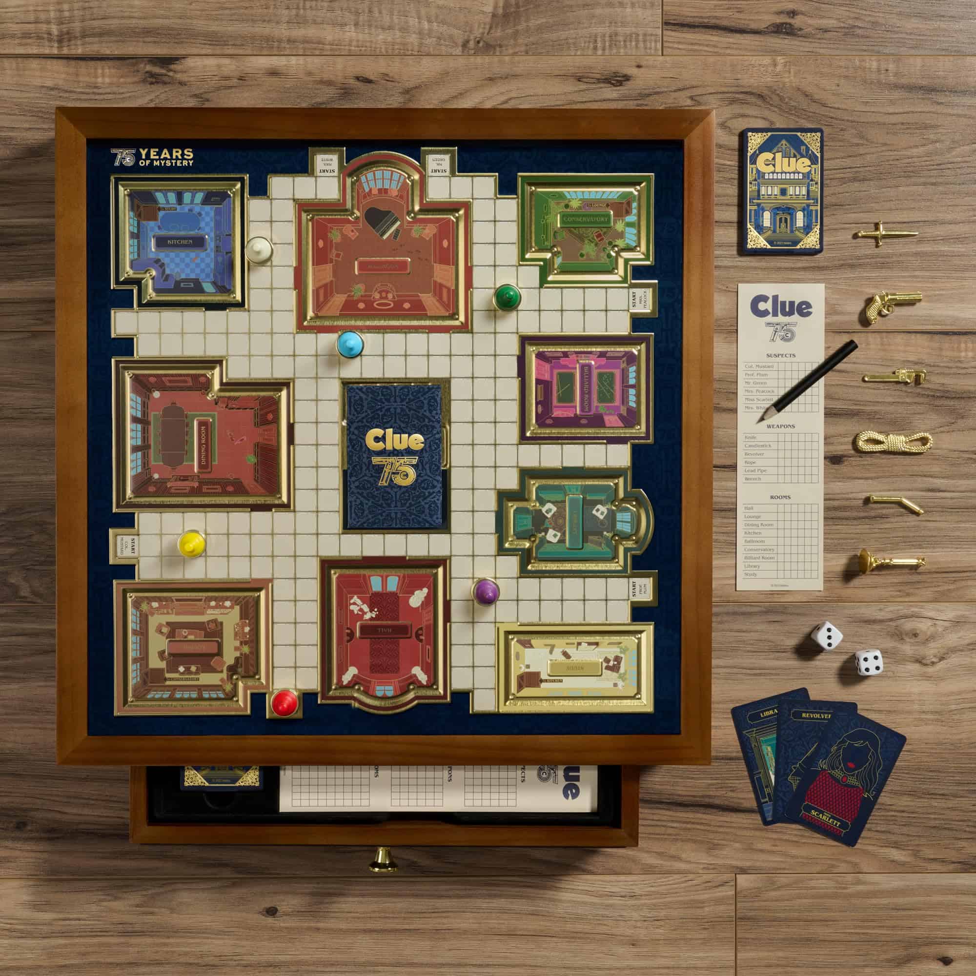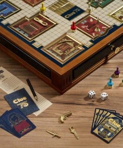 El Juego de Mesa Clue 75 Aniversario de WS Game Company es una conmemoración y jubileo del juego de detectives más venerado del mundo. Cada detalle ha sido cuidadosamente diseñado para proporcionar el respeto necesario a esta celebración. Estas características se destacan por un hermoso gabinete de madera de dos tonos con un tirador de cajón de metal fundido, almacenamiento integrado y un impresionante tablero de juego de metal tridimensional.