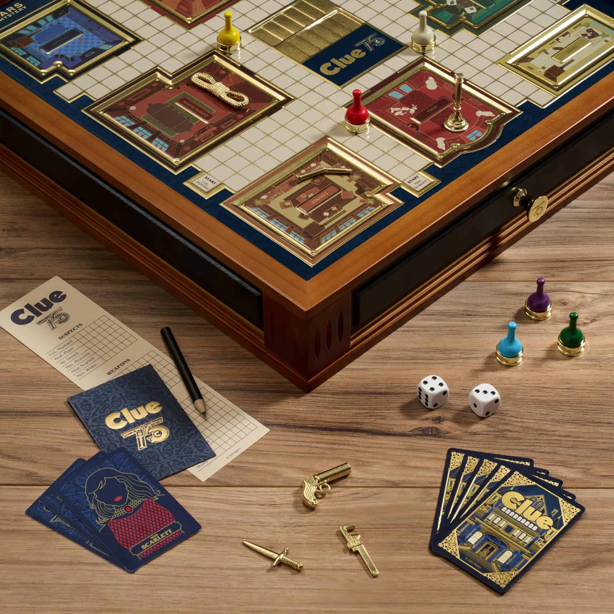 Esta edición también incluye peones de madera con bases de metal fundido, armas de metal fundido, cartas temáticas del 75 Aniversario, notas del detective y sobre de solución. La combinación de estos maravillosos elementos te hará gritar ¡Soy yo en la sala de estar con el mejor juego de aniversario de todos los tiempos!