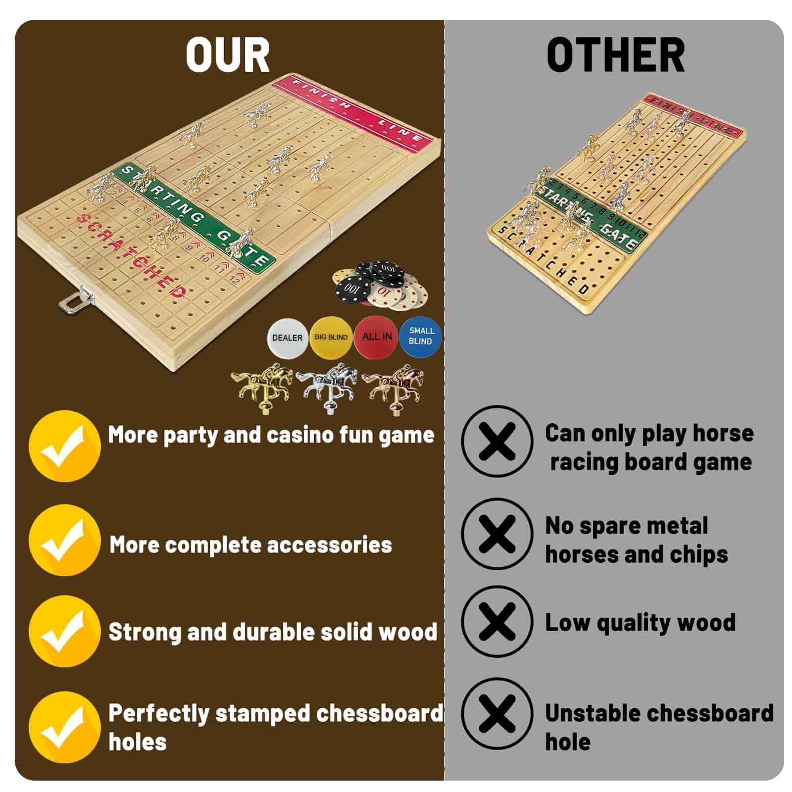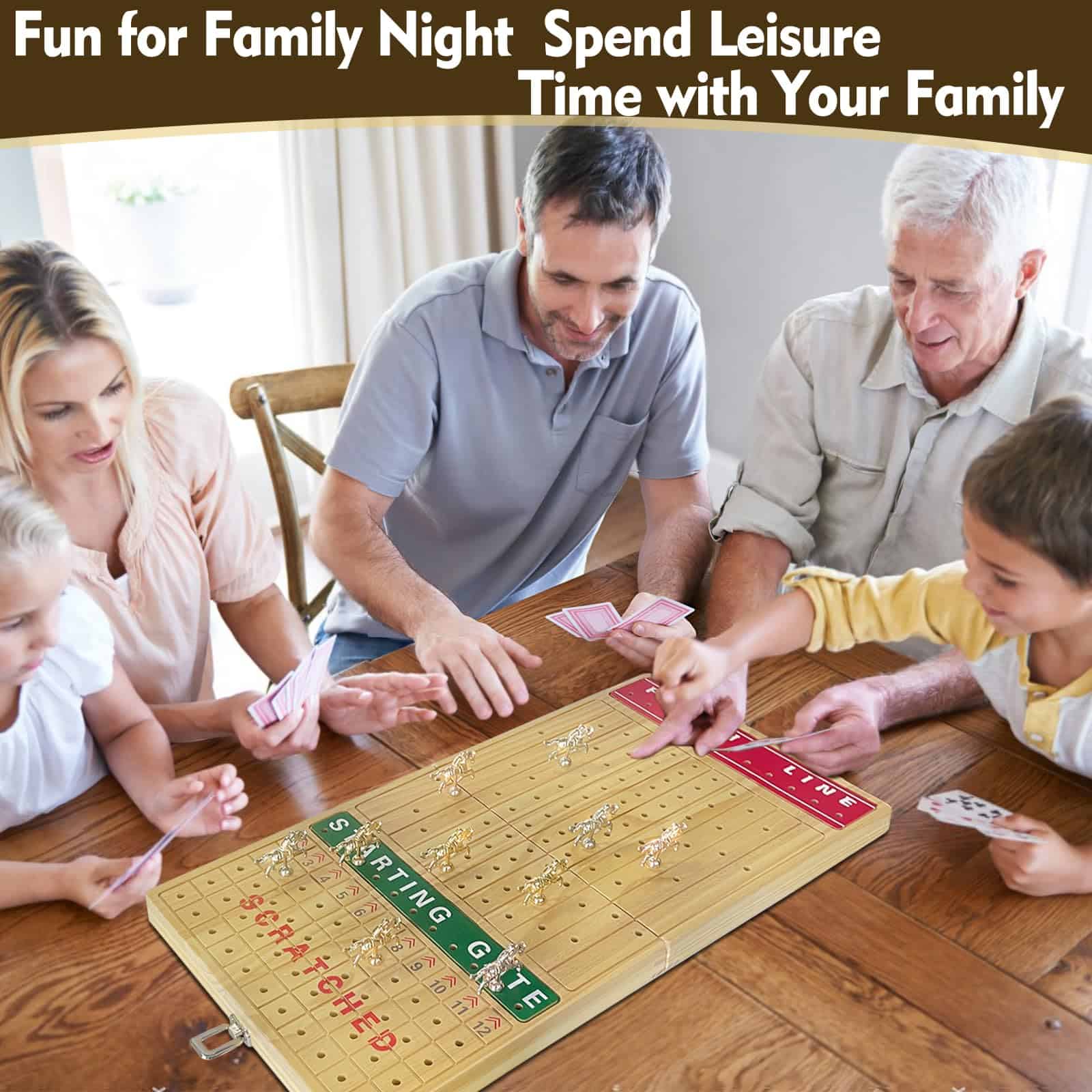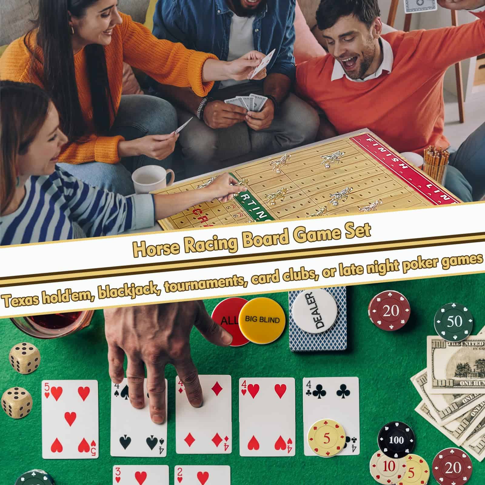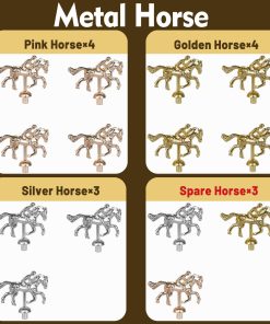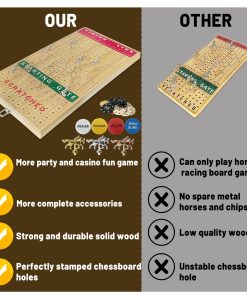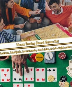 Nuestro set de juego de lujo incluye un juego de mesa de carreras de caballos y un set de fichas de póker. El juego de mesa de carreras de caballos está hecho de madera de pino de alta calidad, las líneas están talladas en la madera y no se dañarán con el tiempo. El tablero de juego está impreso en color y no se desvanecerá fácilmente. Además, el tablero de juego es a prueba de agua y no se daña fácilmente. Los exquisitos y compactos caballos de metal son más como algunas artesanías. Las carreras de caballos tienen una reputación de larga data. Estamos equipados con un juego detallado y emocionante. Tira los dados para determinar qué caballo correspondiente avanza. ¡Cada caballo tiene la misma probabilidad de ganar hasta que el caballo llega a la última fila! Aumenta la emoción jugando este juego con herramientas de juego de lujo. Nuestro tablero de ajedrez de carreras de caballos está bellamente empaquetado y puede regalarse a familiares y amigos. Para aquellos que aman los juegos, este debe ser un regalo sorprendente. El caballo de metal adentro es aún más hermoso y se puede colocar en casa. No es solo un juego, es una artesanía. El set de juego de mesa de carreras de caballos 3 en 1 es la mejor elección de regalo jamás, puede animar la fiesta y proporcionar entretenimiento para su familia y amigos. No solo es genial para jugar juegos de mesa de carreras de caballos, también es genial para Texas hold’em, blackjack, torneos, clubes de cartas o juegos de póker nocturnos. Gran elección para regalos de vacaciones.