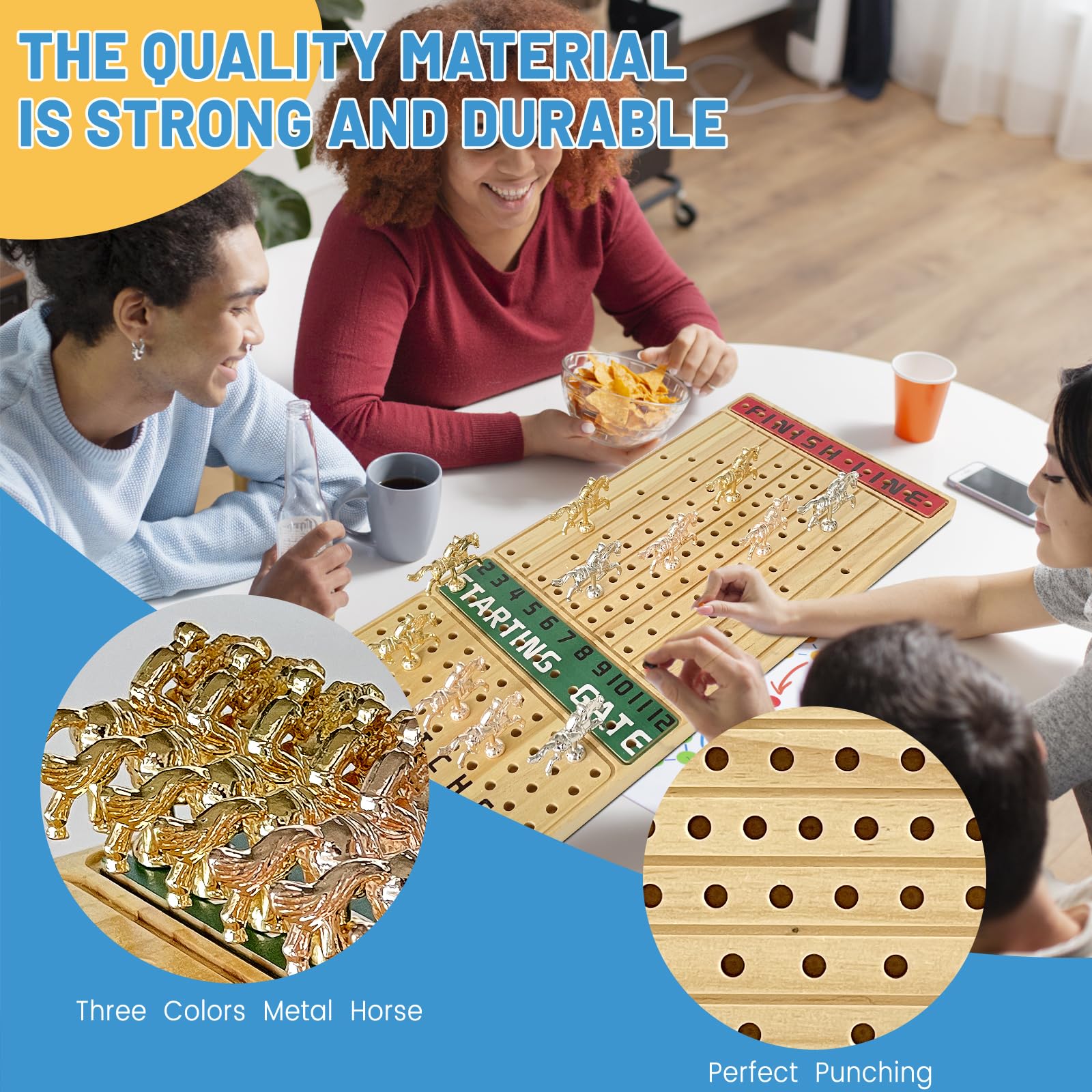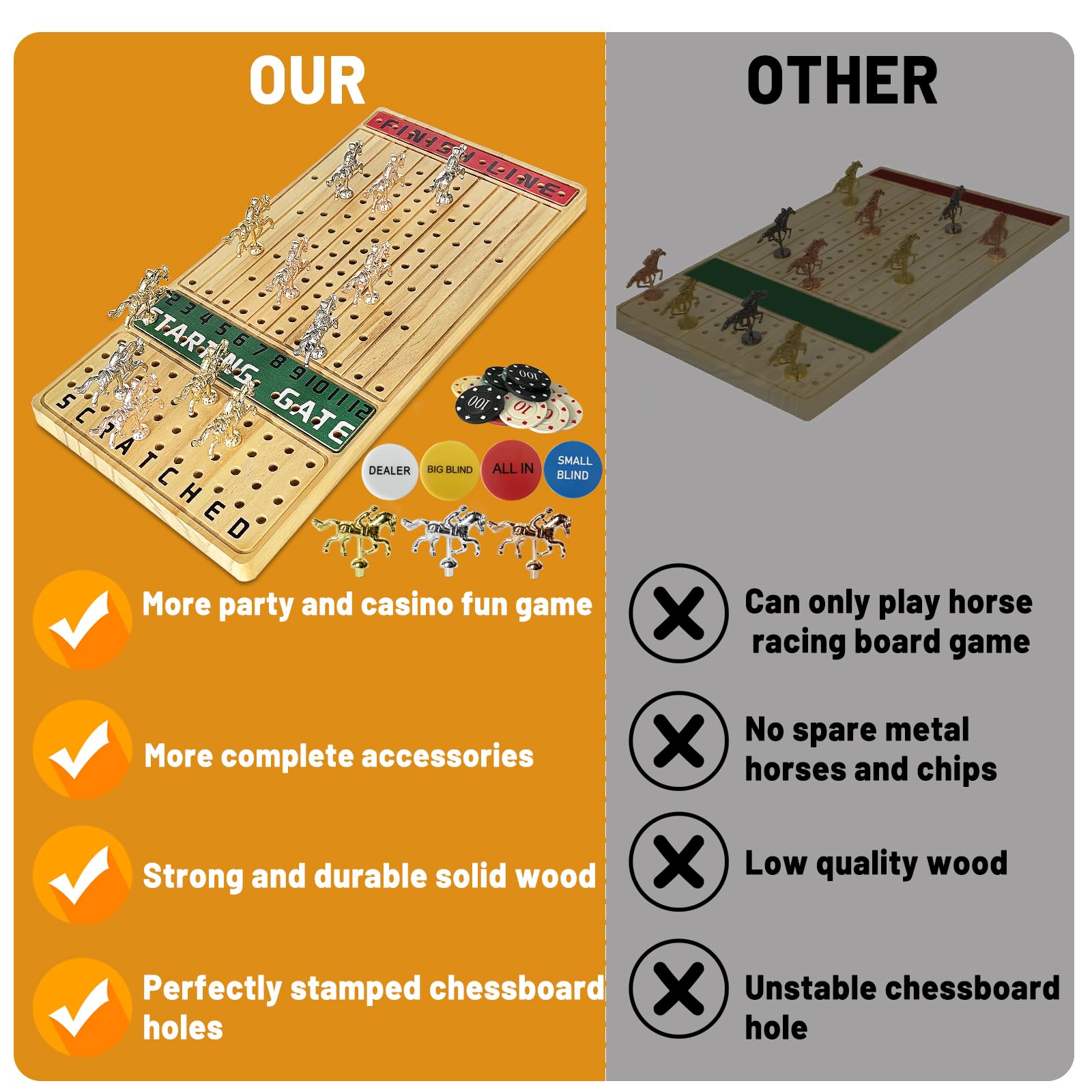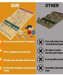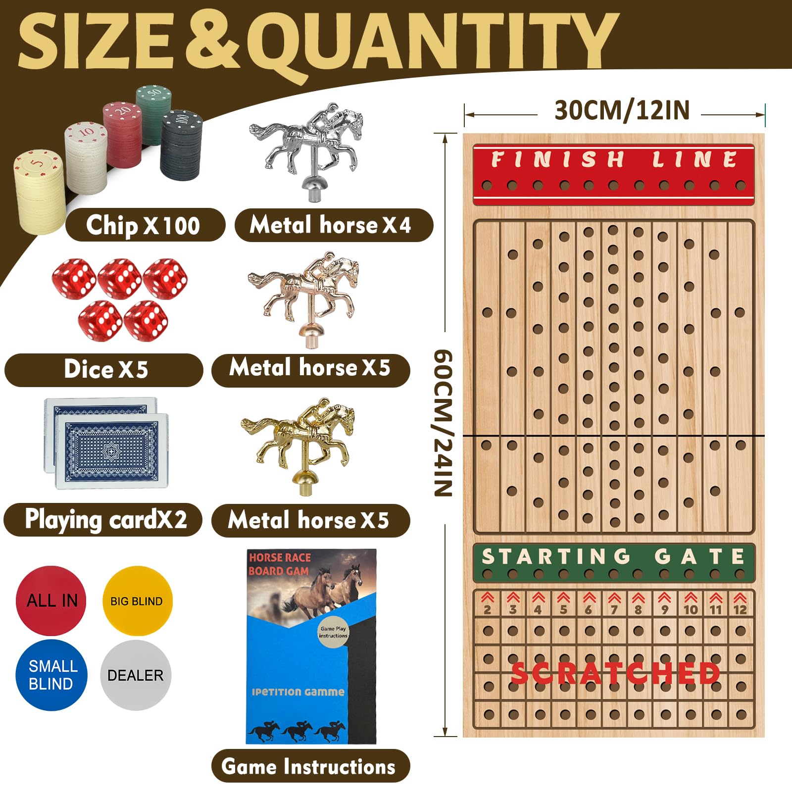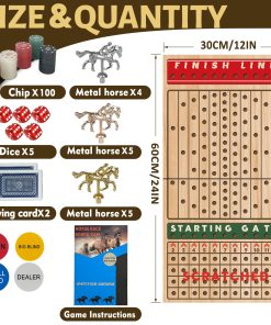 Juego de mesa de carreras de caballos grande de 24 pulgadas: 14 caballos metálicos de lujo, tablero de juego de carreras de caballos de madera maciza engrosada, 5 dados, 2 barajas de cartas, botón de crupier y botón ciego & 5 dados para fiestas y juegos de azar. Eleva tu experiencia de juego: este juego de mesa de carreras de caballos de lujo viene con un tablero de madera maciza engrosada, proporcionando una base resistente y lujosa para tus sesiones de juego. Disfruta de la emoción de la carrera con amigos y familia en tu próximo encuentro. Caballos de metal robustos: con 14 caballos de metal robustos, este set añade un toque de elegancia y durabilidad a tu juego. Cada caballo está diseñado para resistir la emoción de la carrera, asegurando un juego fluido en cada ocasión. Set completo para diversión competitiva: con 5 dados, 2 barajas de cartas, y botones de crupier y ciego incluidos, este set completo tiene todo lo que necesitas para una emocionante experiencia de carreras de caballos. Es perfecto para fiestas y noches de juego. Juego estratégico: usa los dados y las cartas para planificar tu camino hacia la victoria. Los elementos adicionales de azar y habilidad hacen que cada juego sea único, manteniendo a los jugadores comprometidos y deseando volver por más. Ideal para reuniones sociales: ya sea que estés organizando una fiesta o simplemente teniendo una noche de juego casual, este juego de mesa de carreras de caballos está diseñado para reunir a las personas durante horas de diversión y competencia amigable