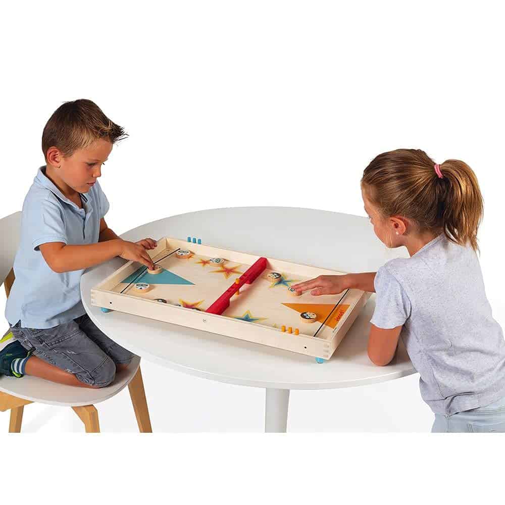 ¡El clásico juego de Passe-Trappe se ha actualizado con un aspecto único! ¿Qué acróbata temerario saldrá victorioso? Cada jugador tiene 5 fichas que representan 5 acróbatas. Para ganar, necesitan enviar a sus acróbatas sobre la pared al campamento de la oposición. Usando el lanzador, los jugadores lanzan a sus acróbatas a través del tablero hacia la mitad del oponente. El primer jugador en llevar a sus 5 temerarios al otro extremo del tablero es el ganador. Este juego clásico brindará horas de diversión, pero ganar tomará velocidad, precisión y concentración. Este juego de madera certificado por FSC (fabricado con madera de bosques manejados de forma sostenible) trae el circo a tu sala de estar, con el estrecho pasaje planteando un formidable obstáculo para tus pequeños acróbatas. Los acróbatas mismos están representados por 10 fichas adorables, cada una con un aspecto retro de dibujos animados. Viene con una bolsa de transporte de algodón para jugar en movimiento. Ideal para desarrollar la destreza en niños de 3 años en adelante. Contiene 2×5 remos, 8 contadores, bolsa de almacenamiento, folleto de instrucciones. Material(es) utilizado(s): Madera (contrachapado). Rango de edad recomendado: a partir de los 3 años