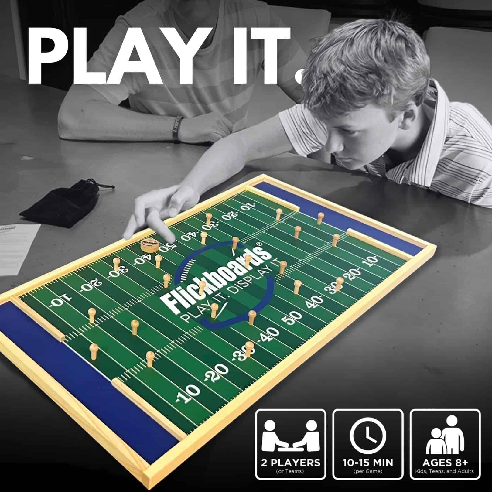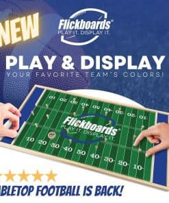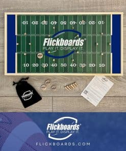 Las fiestas previas al partido tienen una variedad de actividades que van desde el juego de la bolsa de maíz y barbacoa hasta el beer pong y más. Pero cuando la fiesta comienza a la 1 y el inicio es a las 3:20, debes aprovechar tu tiempo sabiamente. El juego de la bolsa de maíz toma mucho tiempo, el beer pong se desvía con el viento, y no quieres perderte la comida. Presentamos FLICKBOARDS LLC, nuestro divertido y rápido juego de madera que se mantiene firme frente al viento y solo toma alrededor de 10 minutos para jugar, lo que significa que tu comida del día del juego no se enfriará. En tu equipo azul, el tablero de juego decorativo de madera de 23.75 x 12.5 x 0.75 pulgadas (60.33 x 31.75 x 1.9 cm) también funciona como arte de pared. Juega. Exhibe. Fácil de aprender, los Flickboards son divertidos para todas las edades. Sé el primero en evitar los peones de los jugadores y lanzar el chip a la zona de anotación 5 veces para sellar la victoria. Mejora tu juego introduciendo penalizaciones y desafíos. Advertencia: Este producto puede exponerte a sustancias químicas que el Estado de California sabe que causan cáncer y defectos de nacimiento u otros daños reproductivos.