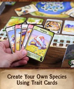 Incluido: 129 Cartas de Rasgos (17 Cartas de Rasgos Carnívoros, 7 de Cada Otra Carta de Rasgos), 20 Tableros de Especies, 40 Marcadores de Madera, 144 Fichas de Alimento, 12 Fichas de Alimento de Valor Diez, 1 Tablero de Pozo de Agua, 6 Pantallas de Alimento, 1 Ficha de Inicio Dino, 2 Ayudas de Jugador, 1 Manual de Reglas