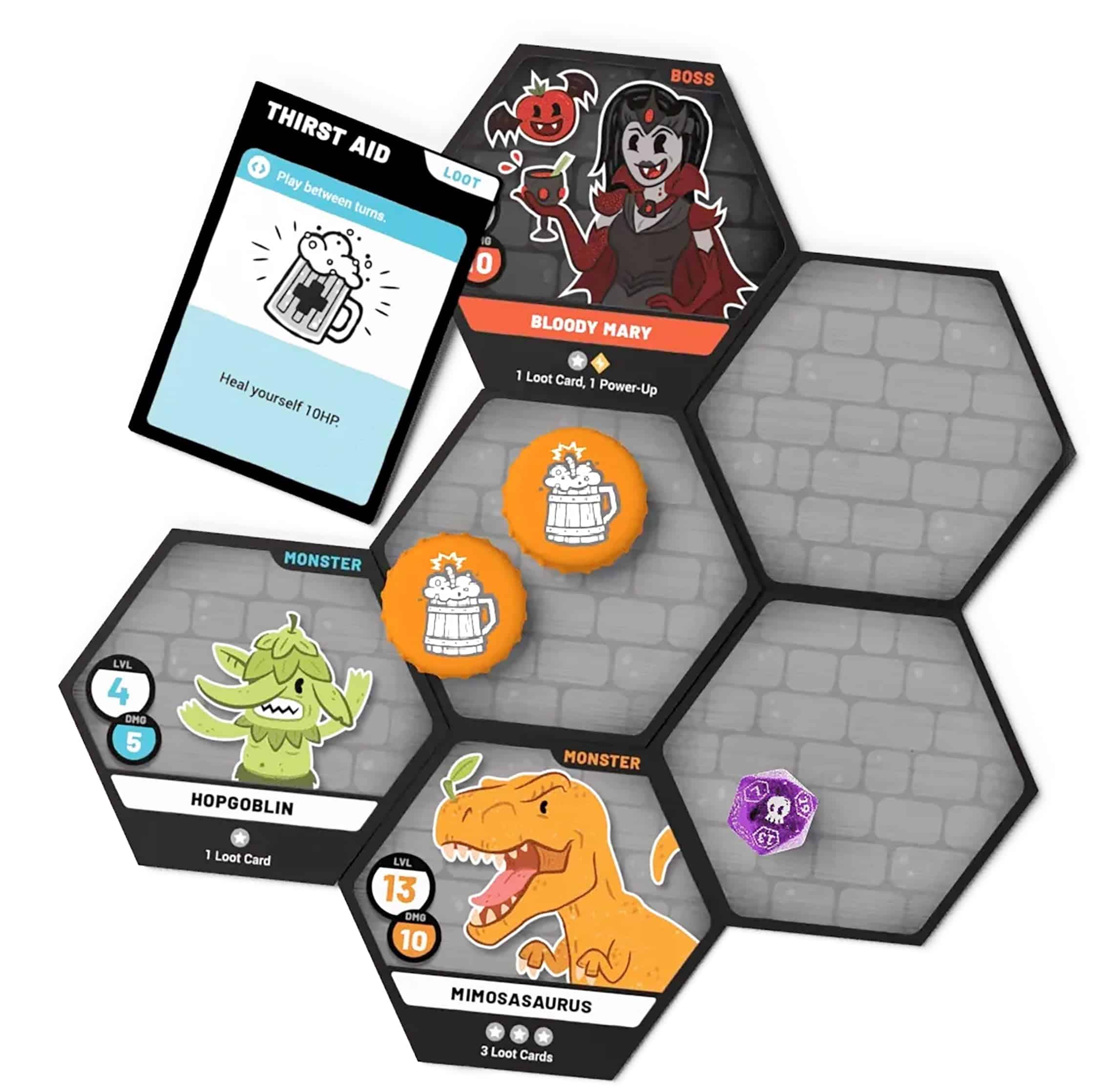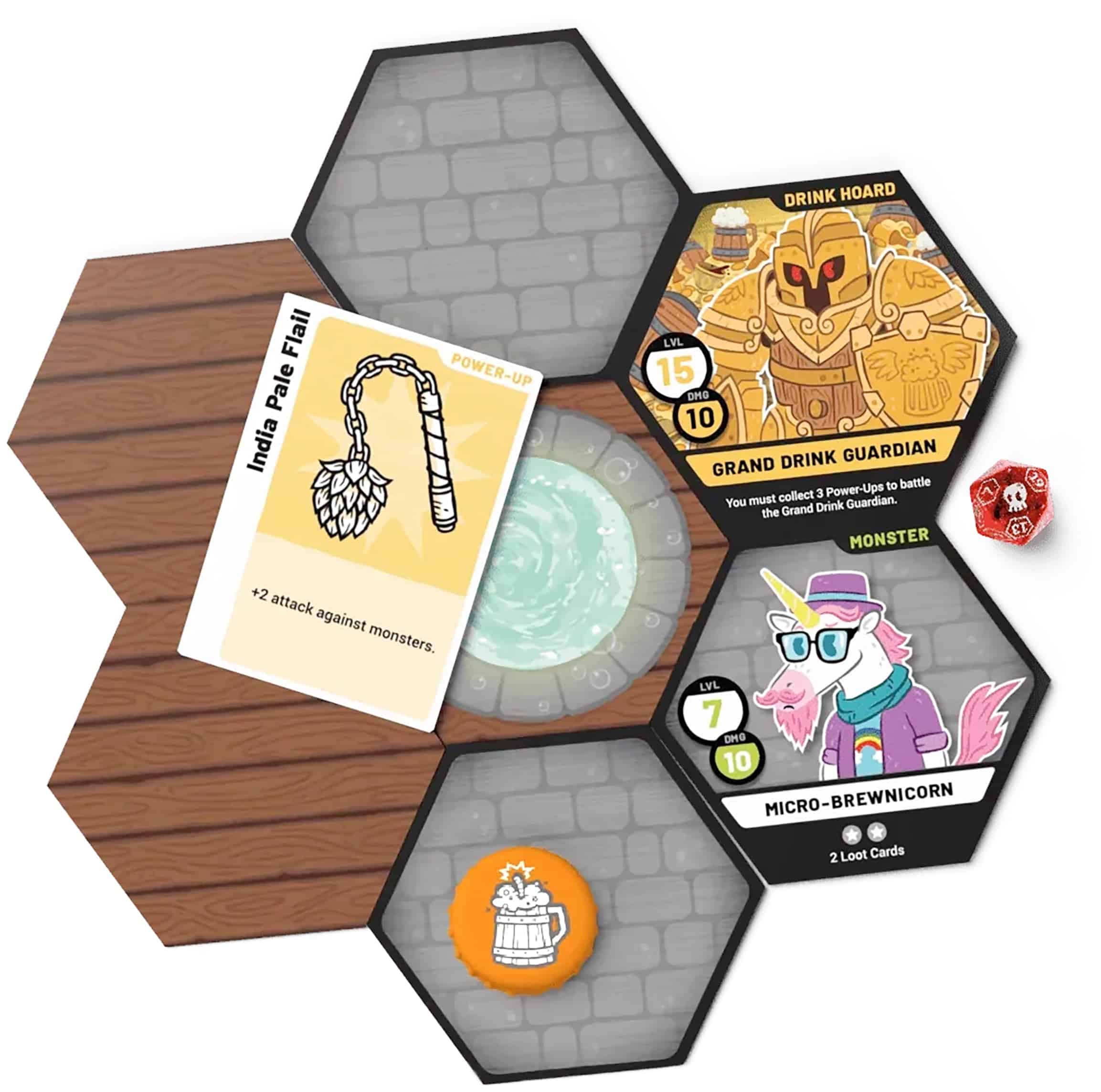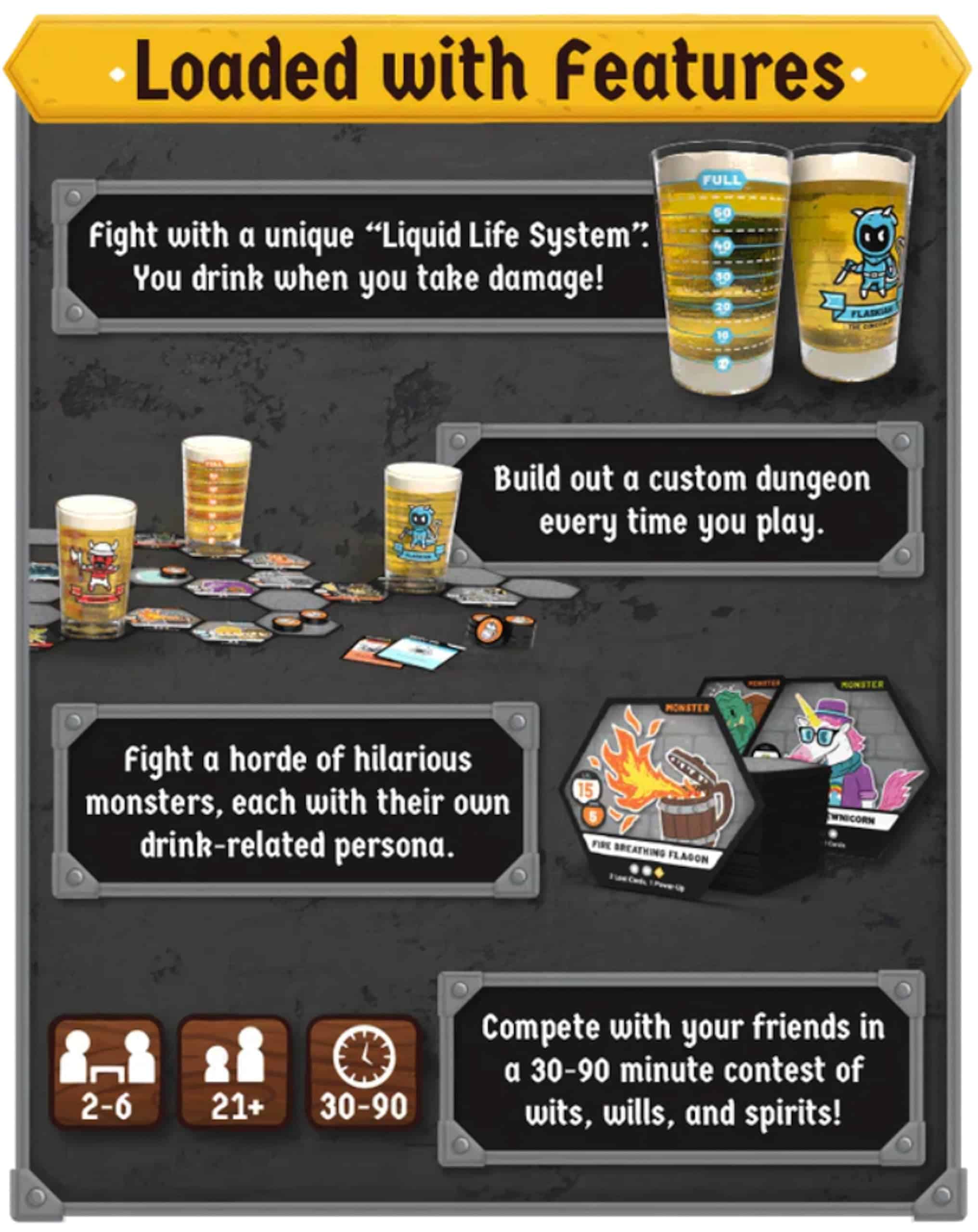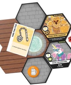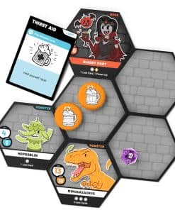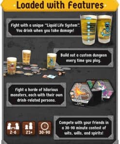 HEROES OF BARCADIA Board Game es un emocionante juego de mesa que combina la diversión de exploración de mazmorras con un toque de beber, ¡perfecto para la próxima noche de juegos con amigos! La 1ra EDICIÓN presenta un Sistema de Daño de Batalla Líquida innovador que permite a los jugadores decidir qué líquidos usar para representar su vida en el juego. Ya sea soda, cerveza, jugo u otra bebida, las posibilidades son infinitas y añaden un giro emocionante a la jugabilidad. Con un número de jugadores de 2 a 6 (y hasta 8 con la adición del Pack de Fiesta), HEROES OF BARCADIA es una opción ideal para grupos grandes. El juego incluye todo lo necesario para empezar, con dados brillantes, cartas impermeables, un libro de reglas detallado y tazas de personaje únicas. ¡Prepárate para enfrentar desafíos, recolectar botines y emprender una aventura épica en busca del Gran Guardián de la Bebida en HEROES OF BARCADIA!
