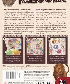 No es fácil ser un animal de zoo. Los recintos son demasiado pequeños para tus necesidades, la rutina diaria es aburrida y los visitantes del zoo son demasiado molestos. Has decidido: necesitas escapar del zoo, idealmente en los próximos siete días. Hay múltiples formas de escapar en KuZOOkA, pero debes trabajar en secreto con los otros animales para juntar la basura dejada por los visitantes del zoo y desarrollar un plan de escape que haga uso de estos objetos. Cada jugador tiene una de las diez cartas de animal con un poder único, y juegas en un tablero que presenta un camino compuesto por espacios en seis colores, con cada espacio teniendo un número en él. En cada ronda, se reparten cartas de objeto a los jugadores, con 20-22 cartas siendo repartidas en la primera ronda. Las cartas muestran un objeto de color, por ejemplo, una cuchara de helado roja o una bufanda morada. En un turno, colocas uno de tus fichas de animal en el camino más lejos que cualquier otra ficha de animal, digamos, en el espacio 1 rojo o el espacio 2 morado, para dar una indicación de lo que tienes en mano. (El primer jugador está limitado a uno de los primeros cinco espacios.) El siguiente jugador coloca una de sus fichas más abajo en el camino, y así sucesivamente, con cada colocación dando a los jugadores la oportunidad de sugerir qué cartas tienen en mano. Un jugador puede usar su poder animal una vez durante una ronda. En algún momento un jugador decidirá que en lugar de colocar una ficha de animal, es hora de intentar una escapada. En ese momento, todos los jugadores revelan todas las cartas del color que coincida con la ubicación de la ficha de animal más lejos en el camino. Si tienes más cartas, obtienes estrellas de experiencia igual al número representado en ese espacio, y con estrellas de experiencia puedes comprar un nivel de experiencia inicial más alto, lo que significa que tendrás más cartas en juego, incluyendo cartas boca arriba visibles para todos. Si tienes exactamente tantas cartas como el número representado, obtienes estrellas de experiencia además de una carta de herramienta universal que cuenta como un comodín. Si tienes menos cartas, fallas. Baraja todas las cartas, luego reparte la cantidad actual de cartas y comienza una nueva ronda. Si durante una ronda logras llegar a uno de los seis espacios finales en la pista y tienes al menos tantas cartas del color designado, escapas y ganas el juego. Si fallas en hacer esto al final de la séptima ronda, pierdes. Puedes aumentar la dificultad de KuZOOkA al requerir más estrellas para avanzar de nivel de experiencia o al jugar en el lado opuesto del tablero, lo que requiere que ganes herramientas universales para tener éxito en los seis espacios finales.