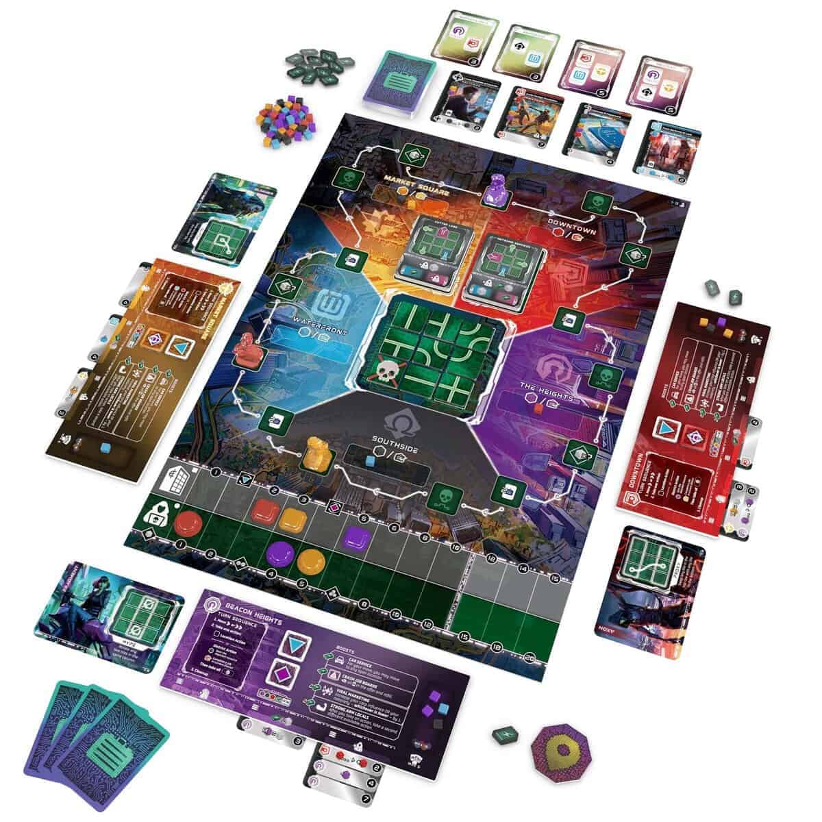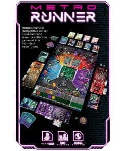 METRORUNNER – ¡Bienvenido a Mirror City! Metrorunner es un juego competitivo de movimiento de trabajadores y recolección de recursos tematizado en el mundo cyberpunk para 1-5 jugadores. Circulando por los distritos de Mirror City en la línea de Metro, competirás por recursos mientras corres para completar contratos de los cinco distritos y de despiadadas mega-corporaciones. Aumenta tu influencia y obtén mejoras, exprimiendo cada crédito posible de facciones corruptas mientras robas secretamente sus datos para tu distrito natal. Evita y corta el paso a otros corredores, aprovechando las oportunidades para hackear nodos de red. Manipula la circuitería de una cuadrícula central de fichas, alterando clevermente los caminos de un puzle en constante cambio para burlar los firewalls. Asegura tu reputación completando trabajos difíciles por toda la ciudad, secuestrando tecnología del mercado negro y gastando sabiamente tus créditos ganados con esfuerzo. Solo así te destacarás sobre la competencia, ganando un lugar codiciado dentro de la lucha de poder de Mirror City.