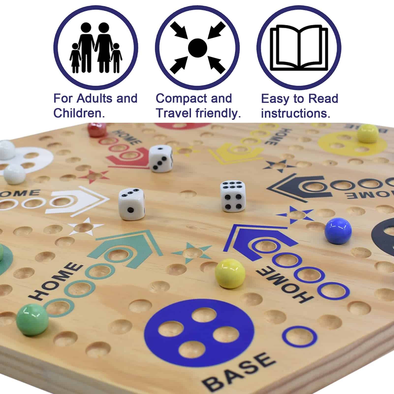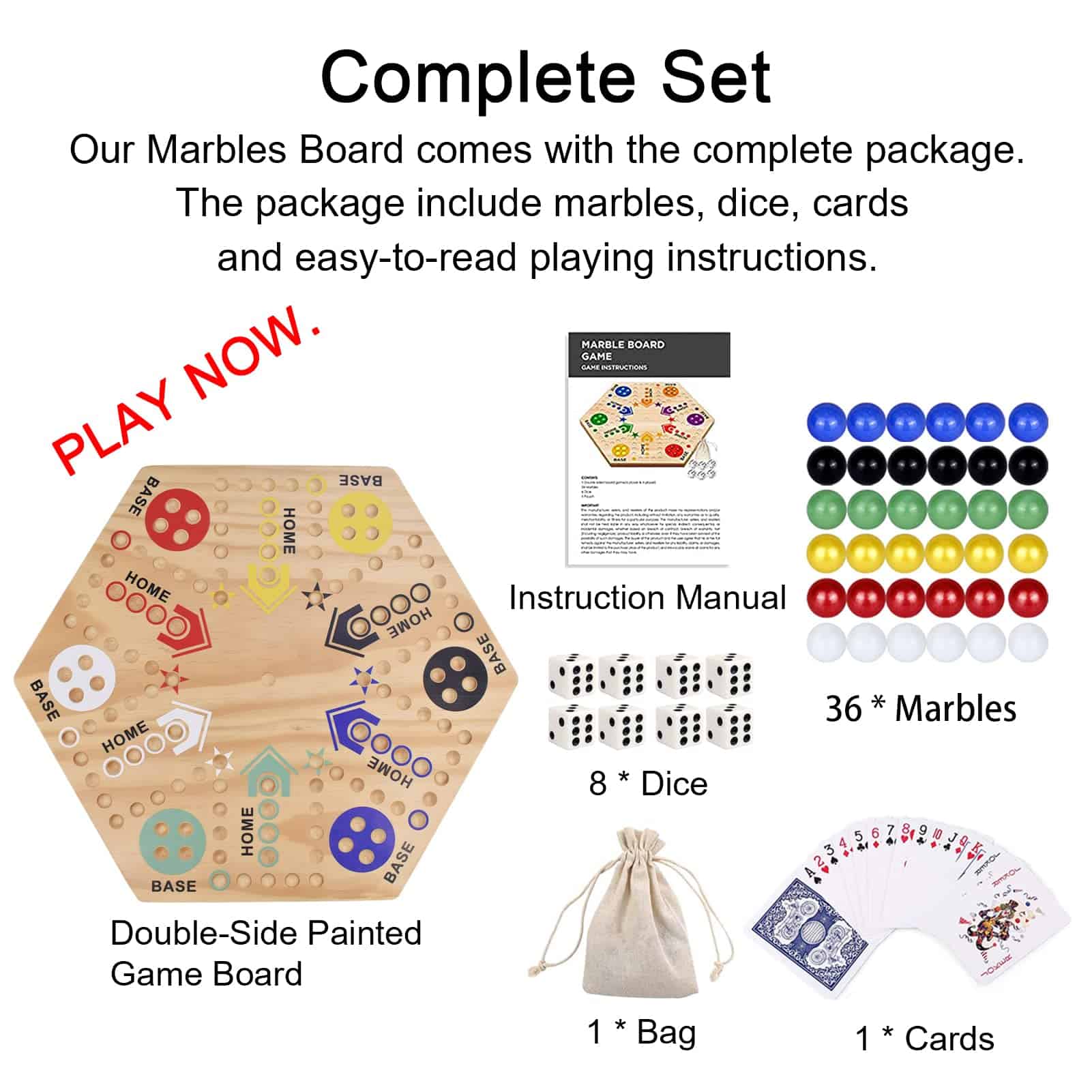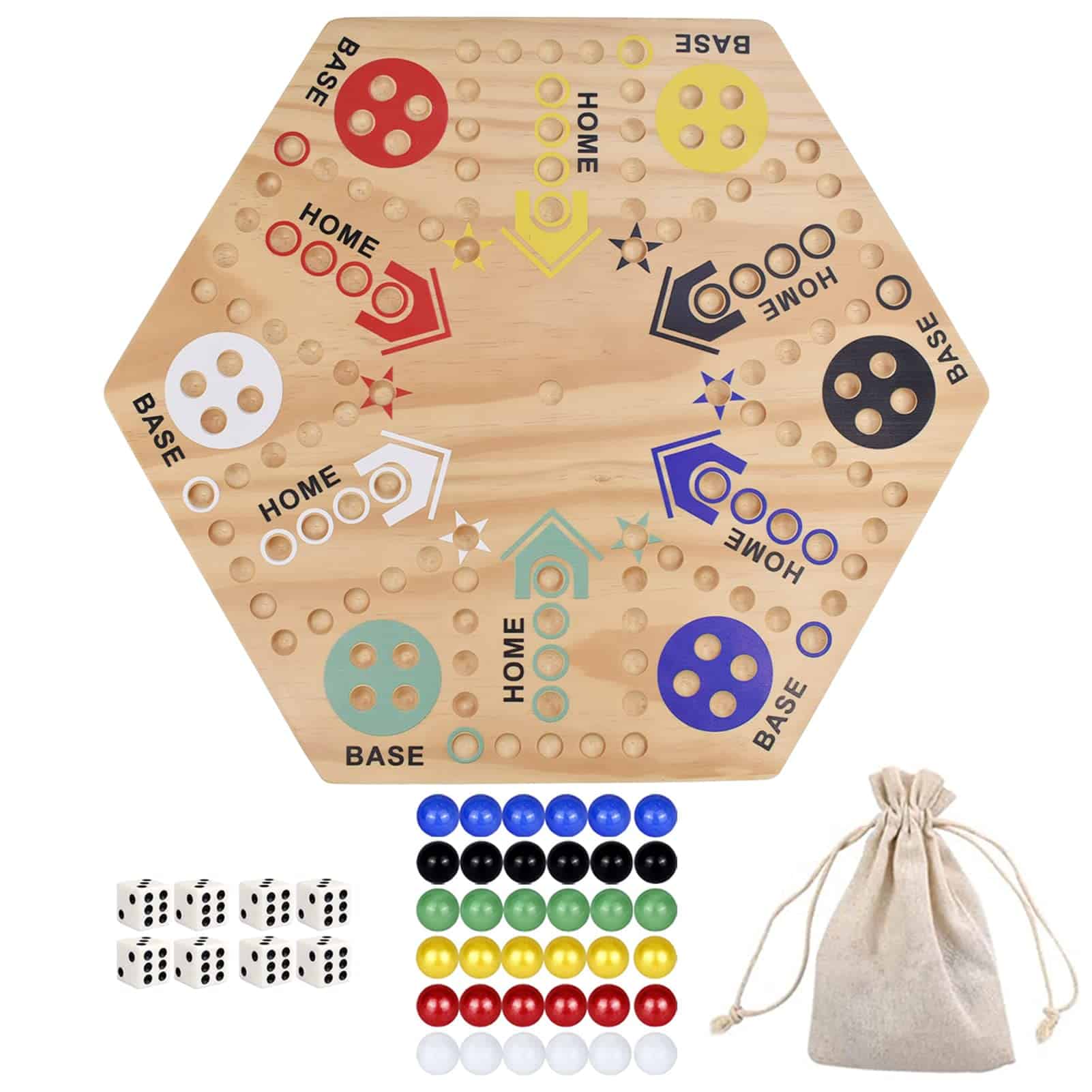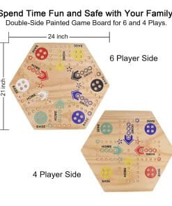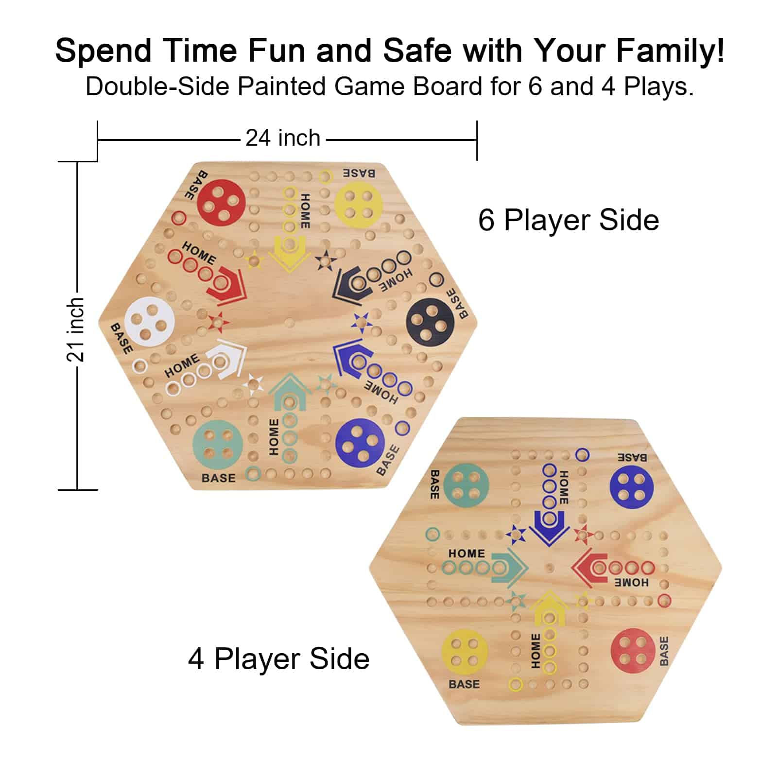 Juego de Tablero de Mármol Original Juego de Tablero de Madera Wahoo de Doble Cara de 24 Pulgadas para 6 y 4 Jugadores, Tablero de Juego con 6 Colores 36 Marbles, 8 Dados para Amigos y Familiares