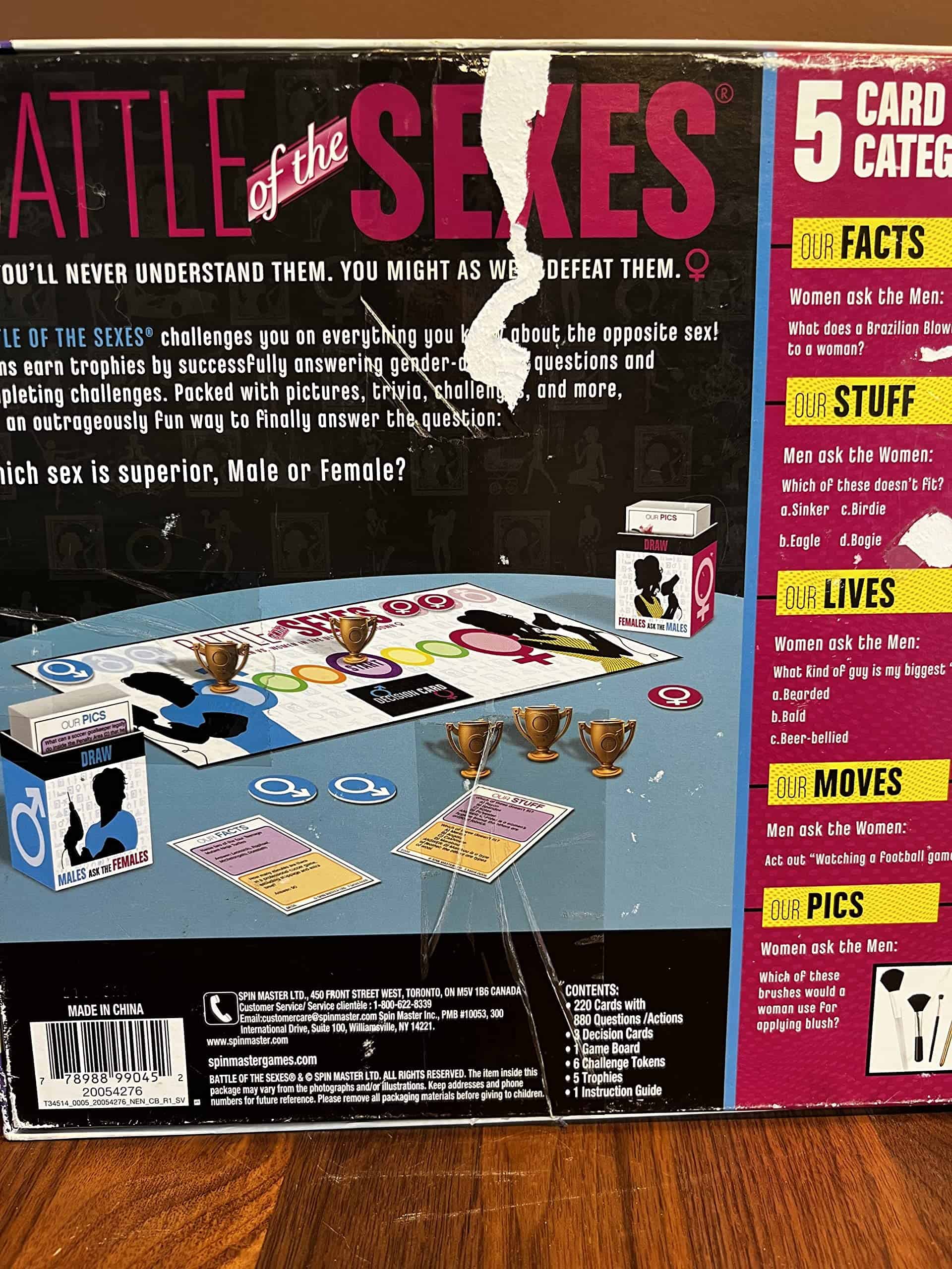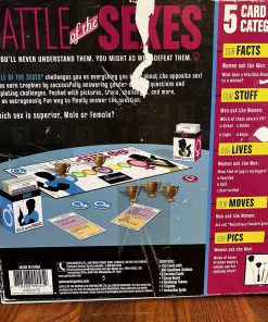Nunca los entenderás, así que más vale vencerlos en Battle of the Sexes! ¡Este divertido juego de trivia para adultos enfrenta a hombres contra mujeres en la batalla final! Lleno de imágenes, trivia y retos ridículos, este juego es imprescindible para cualquier grupo o reunión de cualquier tamaño, ya sea una fiesta, una noche de juegos o simplemente una noche en pareja. Hecho para 4 o más jugadores en equipos de 12 años en adelante. Competir nunca había sido tan divertido. El objetivo del juego es poner a prueba tu conocimiento (o lo que crees saber) del sexo opuesto a través de una serie de preguntas de trivia basadas en género. ¿Ella sabe qué jugador de fútbol suelta el balón? ¿Podría él decirte qué varita usar al aplicar rubor? Battle of the Sexes está lleno de 880 preguntas o acciones divididas en cinco categorías de cartas escandalosas para cinco veces la diversión! Por cada pregunta que tu equipo responda correctamente, un trofeo se acerca más al Círculo de Ganadores de tu equipo. ¡No bajes la guardia ya que el sexo opuesto intentará superarte, engañarte y superarte! Para animar las cosas, cada equipo puede usar Fichas de Desafío. Estas Fichas pueden lanzarte a una victoria fácil, o hacerte catapultar hacia atrás. Si tu equipo no sabe la respuesta a una pregunta de Nuestros Hechos, Nuestro Material, Nuestras Fotos o Nuestra Vida, pero crees que el otro equipo tampoco sabe la respuesta, puedes devolver la pregunta lanzándosela jugando una de tus fichas de desafío. Si responden incorrectamente, mueve el trofeo hacia tu lado del tablero. Si responden correctamente, muévelo hacia su lado del tablero. ¡Cada equipo solo tiene 3 Fichas de Desafío – asegúrate de usarlas sabiamente! ¡Reclama la victoria! ¡Gana tres trofeos con éxito y guía a tu equipo hacia la victoria! Battle of the Sexes es la forma divertida y escandalosa de finalmente responder a la pregunta: ¿Qué sexo es superior, Masculino o Femenino ¡Battle of the Sexes está lleno de 880 preguntas o acciones divididas en cinco categorías de cartas escandalosas para cinco veces la diversión! Lo que hay en la caja 220 Cartas con 880 Preguntas/acciones, 3 Cartas de Decisión, 1 Tablero de Juego, 3 Fichas de Desafío Femeninas, 3 Fichas de Desafío Masculinas, 5 Trofeos, 1 Guía de Instrucciones