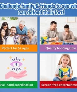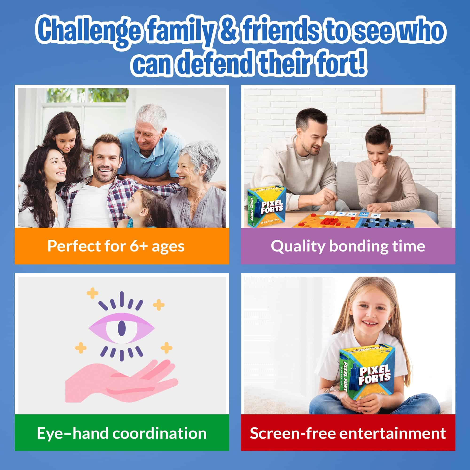 ¡QUE GANE LA MEJOR FORTALEZA! Pixel Forts es un juego de mesa familiar en el que se construye una base mientras se lanza destrucción a los enemigos. Los píxeles se pueden utilizar tanto como armas como barreras, lo que brinda a cada jugador la oportunidad de derribar otras fortalezas mientras mantiene la suya intacta. CÓMO JUGAR: Cada juego de mesa contiene 4 fortalezas, 60 píxeles, 60 cartas de potenciador y un tablero de jugador. Después de construir las bases de cada jugador, pueden lanzar un píxel hacia el enemigo, fortificar sus píxeles derribados o comprar un potenciador. DISEÑADO PARA TODAS LAS EDADES: Recomendado para niños (6+), adultos y personas mayores, este emocionante juego de construcción de fortalezas es perfecto para noches de juegos en familia, viajes de fin de semana con amigos, reuniones navideñas y una divertida actividad recreativa para la oficina. MEJORA HABILIDADES COGNITIVAS Y DEDESTREZA: Nuestro juego de mesa Pixel Fort no es solo un juego social, ¡sino también un juego mental! Aprende y mejora naturalmente tus habilidades de resolución de problemas, planificación estratégica y reconocimiento de patrones de la manera más entretenida posible. EL JUEGO DE MESA DEFINITIVO: Los juegos para niños de Uzzle son amados por más de 150,000 clientes en todo el mundo. Nuestros divertidos juegos de mesa son compactos para viajar y son ideales para regalar. ¡Crea una experiencia inolvidable con tus seres queridos y atesórala para toda la vida!