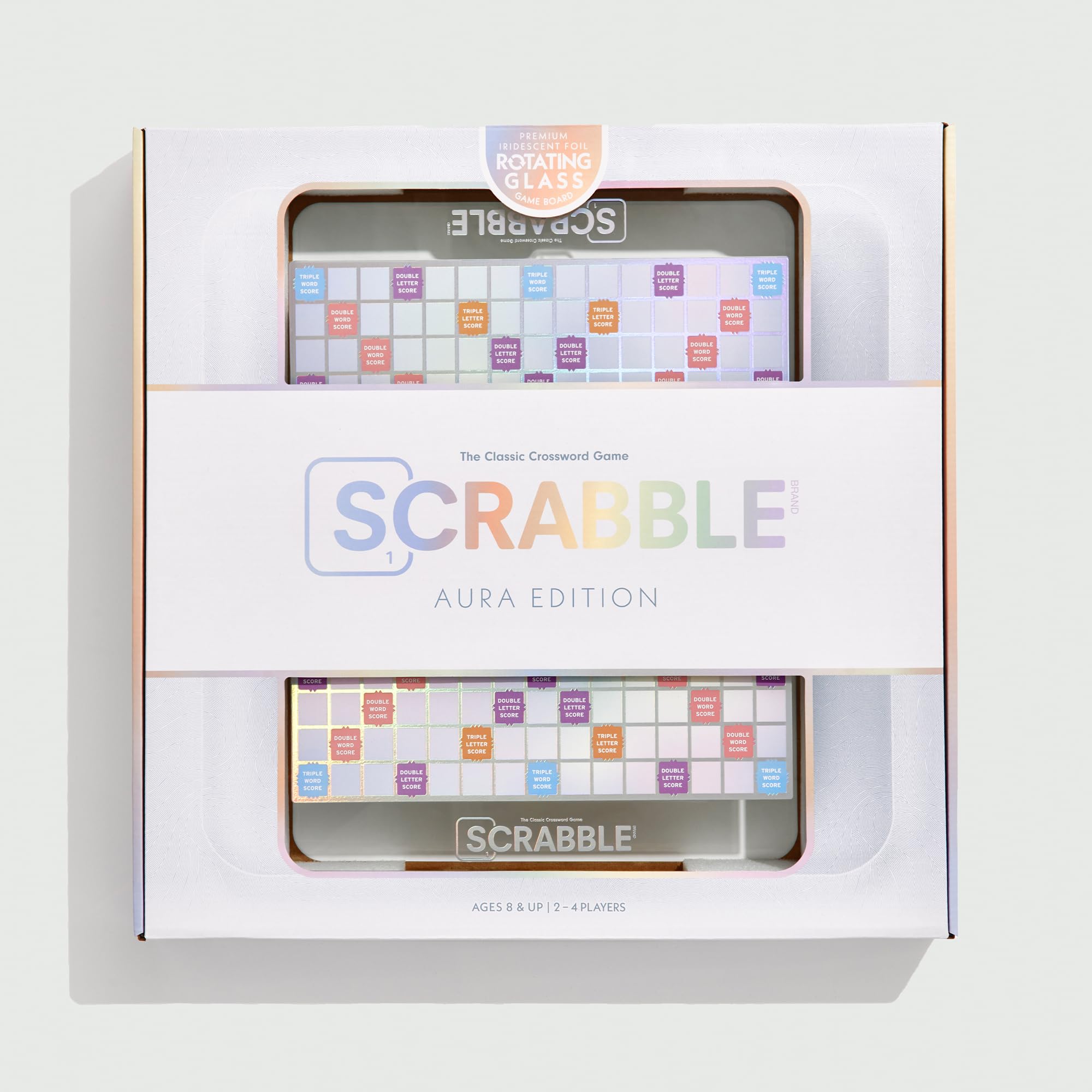 La noche de juegos obtiene un brillo especial con SCRABBLE EDICIÓN AURA. Este tablero de juego de vidrio de alta calidad resplandece con colores serenos que reflejan la vibra de cualquier habitación. Rota suavemente el tablero y observa cómo los acentos de papel de aluminio iridiscente iluminan cada palabra, creando un juego hipnótico de luz y color. Expresa tu estilo personal como nunca antes con esta edición premium de SCRABBLE. Convierte cada movimiento en una obra maestra y deja que tu aura brille a través de cada palabra que juegues.
